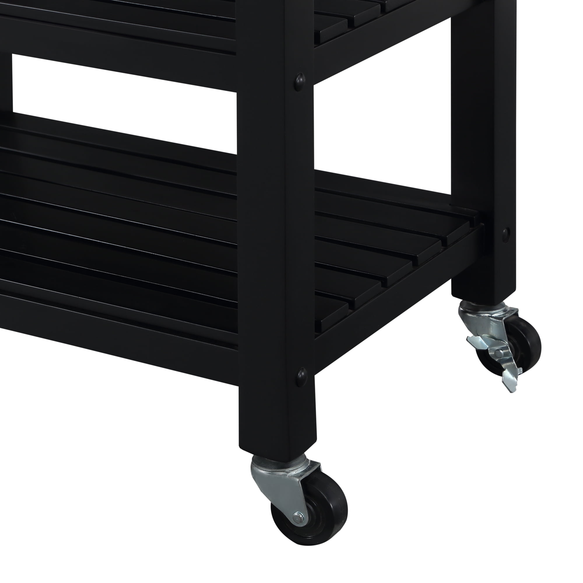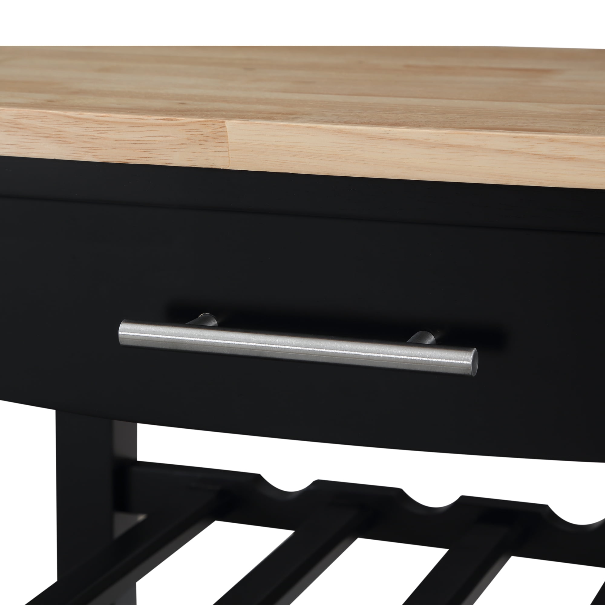 The Ellaine 4 Tier Butcher Block Kitchen Cart with Drawer and Wine Rack by Convenience Concepts is the perfect addition to any transitional kitchen space. Providing functionality and efficiency for everyday tasks, this conventional unit is sure to become a staple in your home. The smooth butcher block countertop offers a sleek and stylish station to assist with your cooking needs while the stainless-steel towel holder allows for easy cleaning. Three additional shelves offer plenty of storage space including a wine rack capable of storing four bottles. Three brushed nickel hooks on the left side of the cart and one spacious drawer on roller slides will keep kitchen utensils at your fingertips. This finely crafted piece is perfect for small kitchens, apartments, and anywhere you need a little extra storage or kitchen prep space. The sturdy frame is built of sturdy solid rubberwood to ensure long-term durability. This portable cart is the perfect mobile storage space thanks to the 360-degree swivel caster wheels, two of which are locking. Available in multiple finishes, you are sure to find cart to match current existing interiors. Please note that this cart is not intended to be used as a cutting board.
