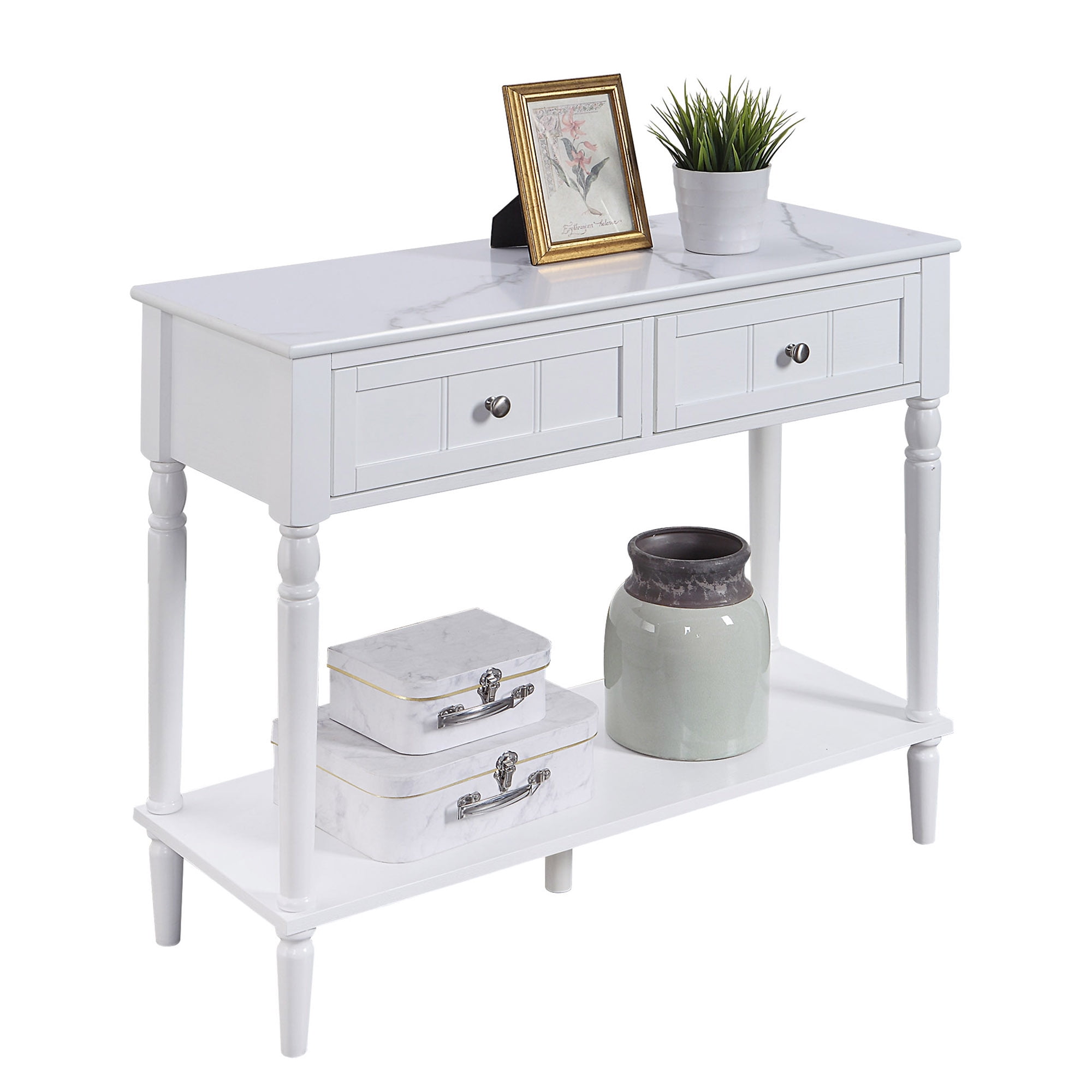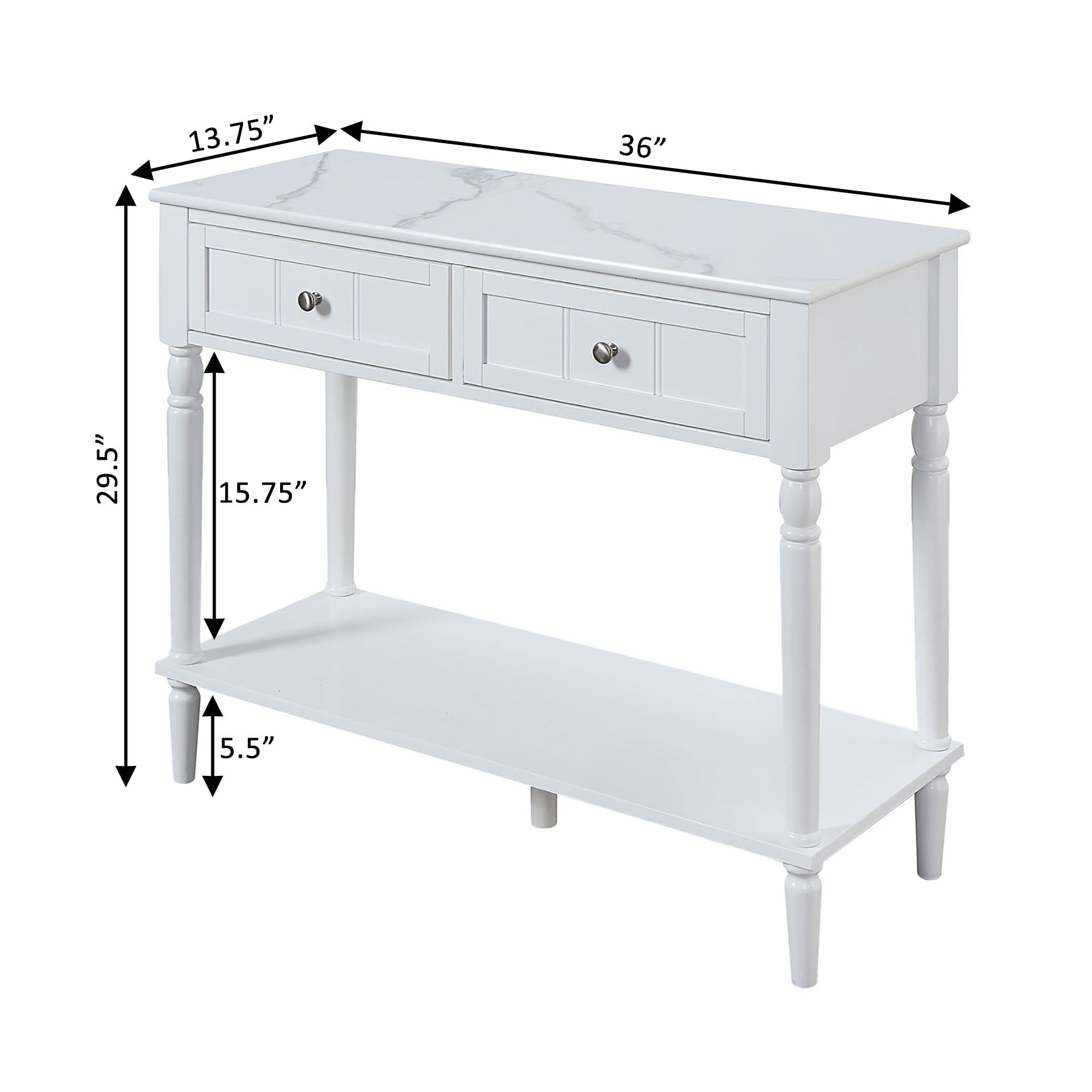 Convenience Concepts French Country 2 Drawer Hall Table with Shelf, White Faux Marble/White Features: Part of the French Country Collection Traditional and Transitional Styles Available in Multiple Finishes 2 Spacious Drawers & 2 Tiers of Spacious Shelving Built from Pine Wood, Ash Wood Veneer, MDF, & Particleboard Assembled Item Dimensions: (L) 36 in. x (W) 13.75 in. x (H) 29.5 in.