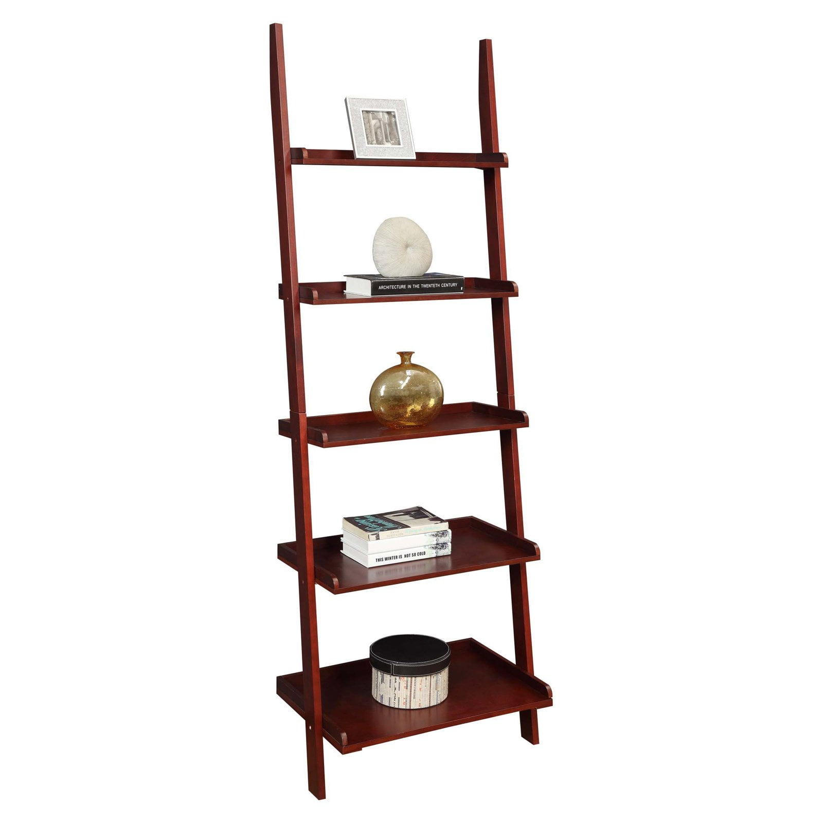 The French Country Bookshelf Ladder by Convenience Concepts makes for the perfect display or storage unit in any room of your home. Available in multiple finishes, this piece features five tiers of spacious shelving for collectibles, books, or even storage. Versatility is endless thanks to its unique design. This bookshelf ladder can be placed in the living room, office, or any room that needs additional display space. Crafted with solid pine, birch veneer, and MDF, this sturdy unit is built to last. Coordinate with additional pieces from the French Country Collection, each sold separately. Features: Part of the French Country Collection Available in Multiple Finishes Five Tiers of Spacious Shelving Crafted from Solid Pine, Birch Veneer, and MDF Will Provide Years of Enjoyment Rich Glossy Blue Wood Finish (L) 25 in. x (W) 15.75 in. x (H) 72.75 in. Specifications: Product Dimensions: (L) 25 in. x (W) 15.75 in. x (H) 72.75 in. Product Color: Blue