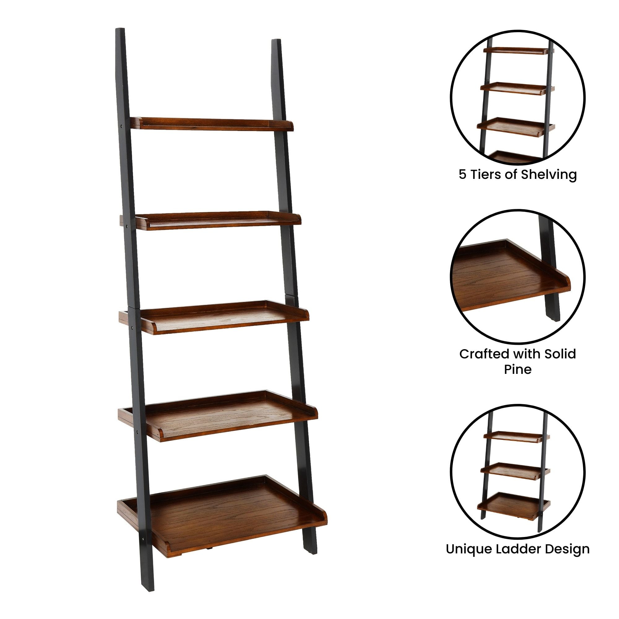 Part of the French Country Collection Available in Multiple Finishes Five Tiers of Spacious Shelving Crafted from Solid Pine, Birch Veneer, and MDF Easily Complements any Decor Quick and Easy Set Up (L) 25 in. x (W) 15.75 in. x (H) 72.75 in. Beautiful dark brown walnut and black wood finish provides a gorgeous two-tone look