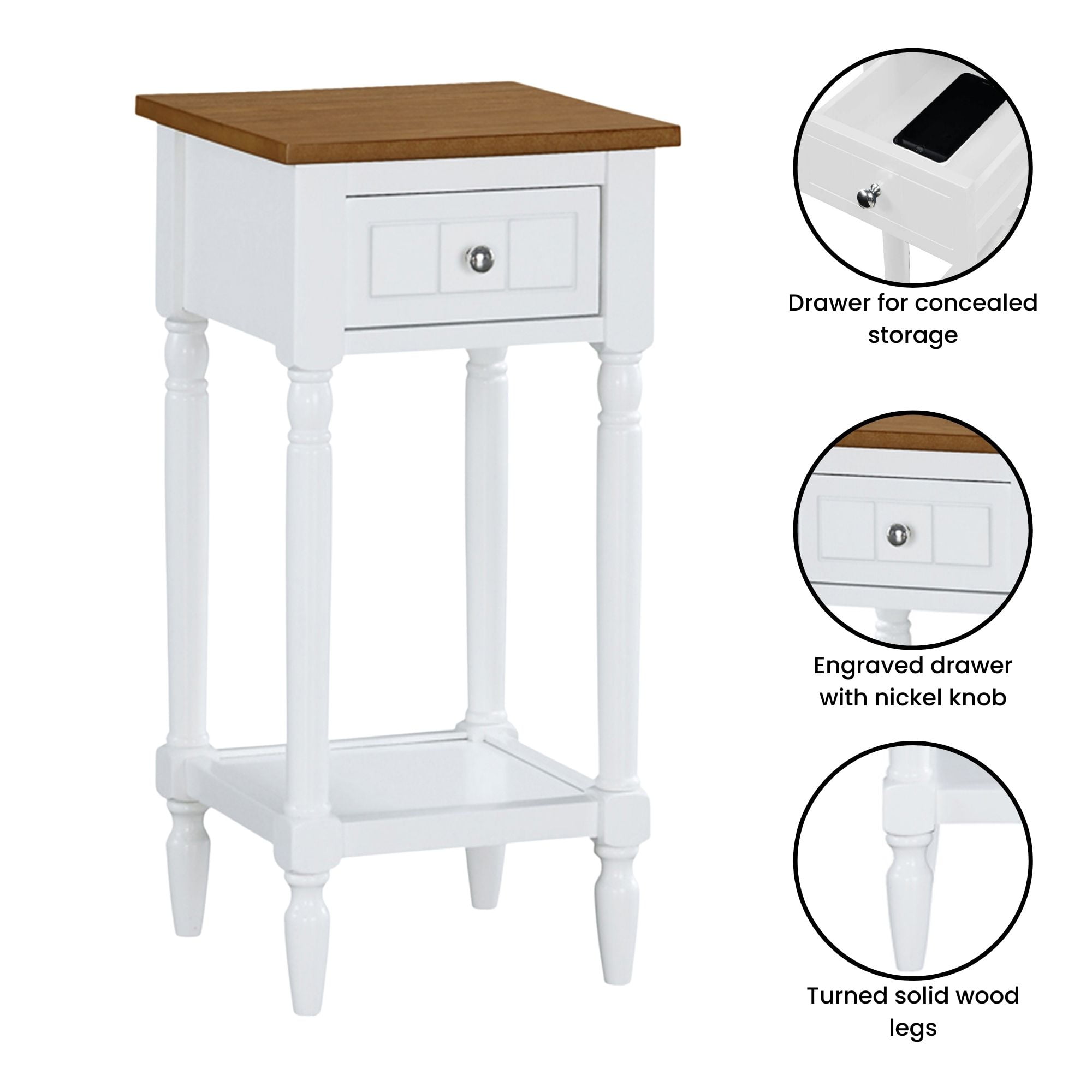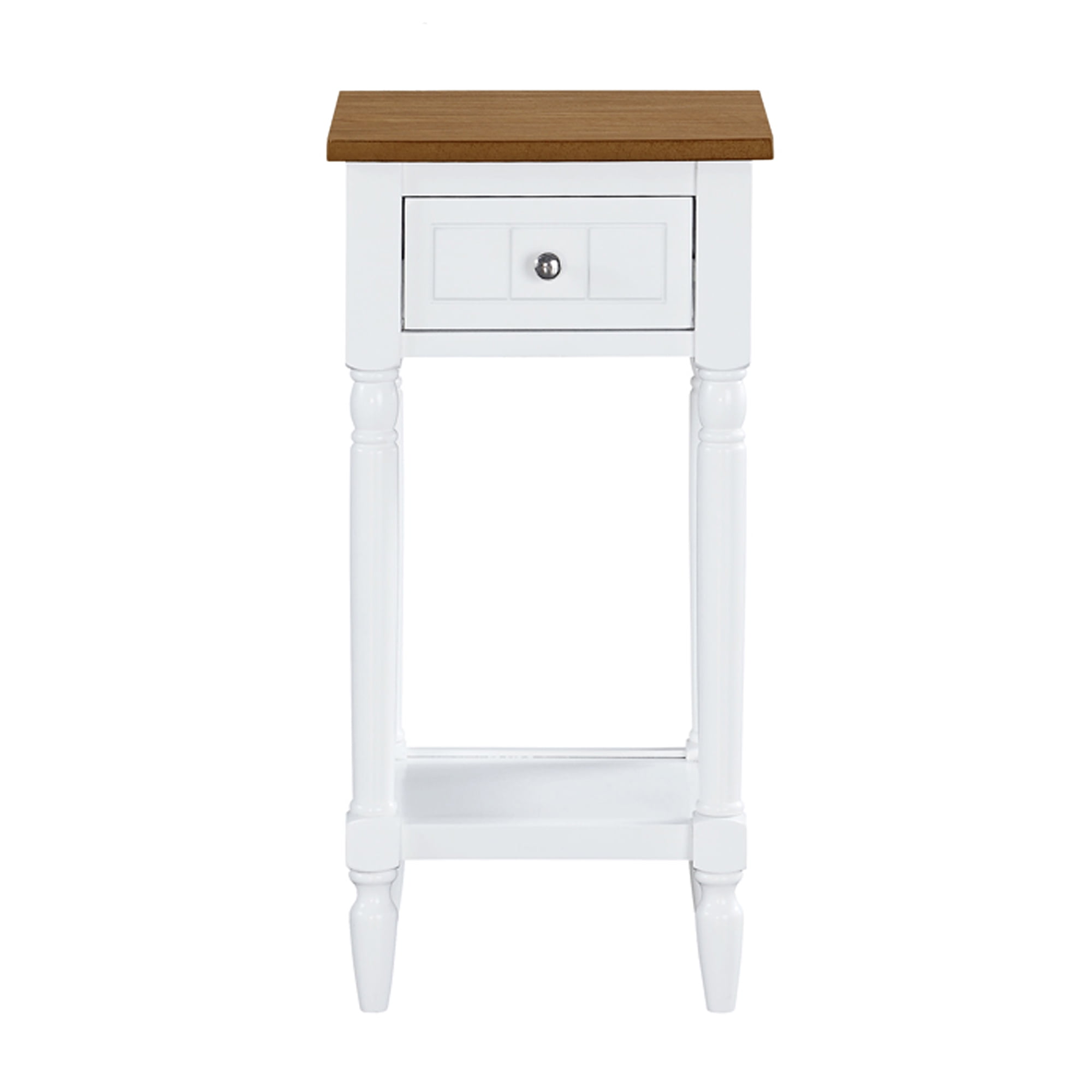 Add farmhouse charm to your home with the French Country Khloe 1 Drawer Accent Table with Shelf by Convenience Concept. This elegant piece features turned legs with stunning sculpted accents that will make a captivating addition to any room. Featuring a spacious engraved drawer and two tiers of shelving, this end table offers much storage space for your favorite decorative items, books, and more. Available in a range of finishes, it is easy to choose the perfect hue to match your existing home interiors or create a captivating contrast in your living space. The charming turned legs are engineered from solid wood while the base of the table is built from sturdy manufactured wood. The base of the table is finished with smooth non-lead-based paint and the tabletop boasts a beautiful veneer. Style your home with a touch of French countryside charm by adding coordinating pieces from the French Country Collection by Convenience Concepts, each sold separately.