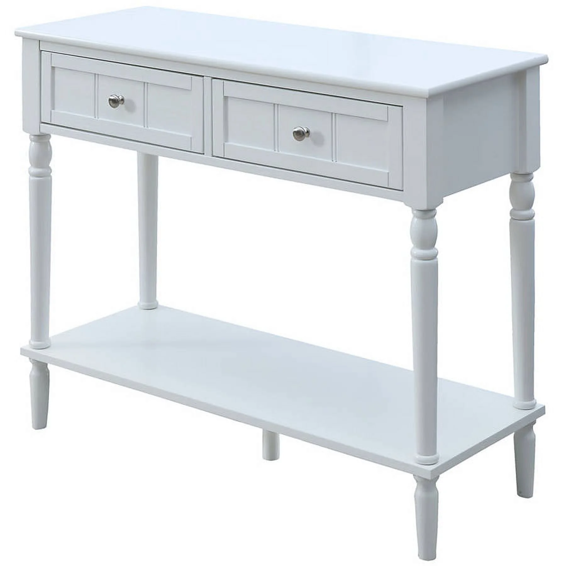 French Country Two Drawer Hall Table, White The French Country Two Drawer Hall Table is the perfect combination of sophistication and elegance. Featuring 2 drawers for concealed storage and an open bottom shelf, you can hide away small odds and ends and display books to baskets. Beautifully crafted, the French Country Two Drawer Hall Table also boasts a real wood veneer as you can see the details in the wood grain finish. The beveled table top edge, carved drawer, stainless steel knobs and sculpted turned legs offers the style that you were looking to add to your home. Available in multiple finishes the French Country Two Drawer Hall Table will fit beautifully with your existing home decor. Look for additional coordinating pieces available from Convenience Concept the French Country Collection. Specifications: Featuring 2 drawers for concealed storage and an open bottom shelf, you can hide away small odds and ends and display books to baskets Available in Multiple Finishes Easy Assembly No Tools Required 2 Drawers for Concealed Storage Bottom Shelf for Additional Storage and Display