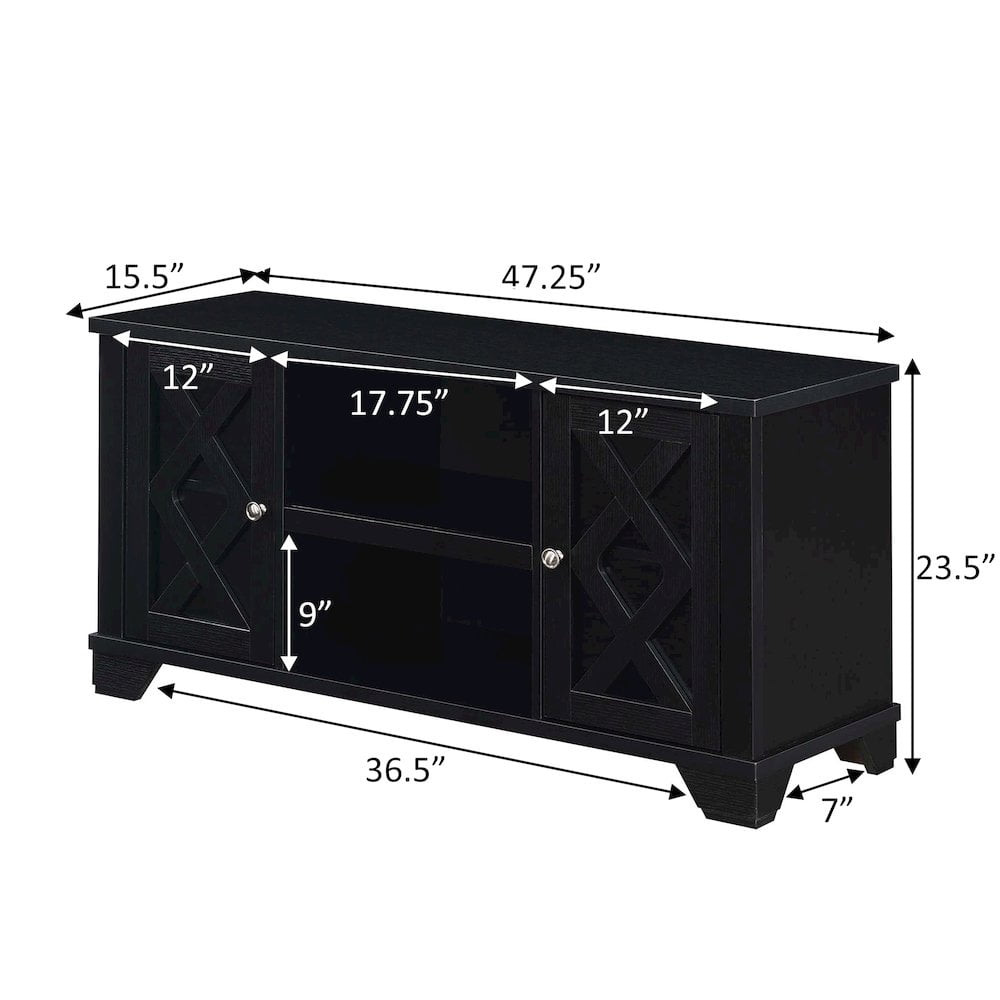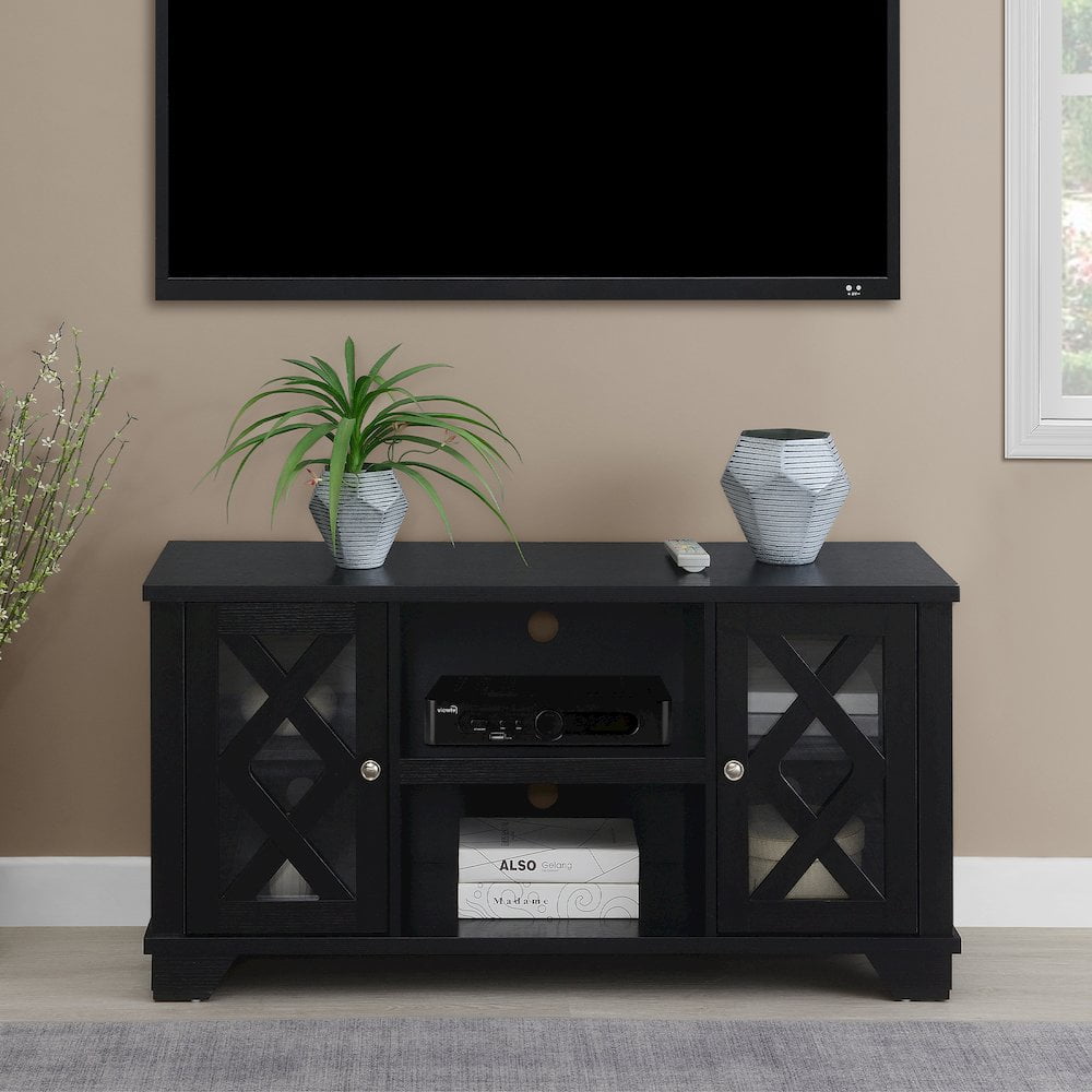 Finish:Black Available in Multiple Finishes 2 Open Shelves and 2 Enclosed Cabinets Two Cable Management Holes Easy Assembly with Instructions Provided Product Dimensions: 47.25″L x 15.5″W x 24″H