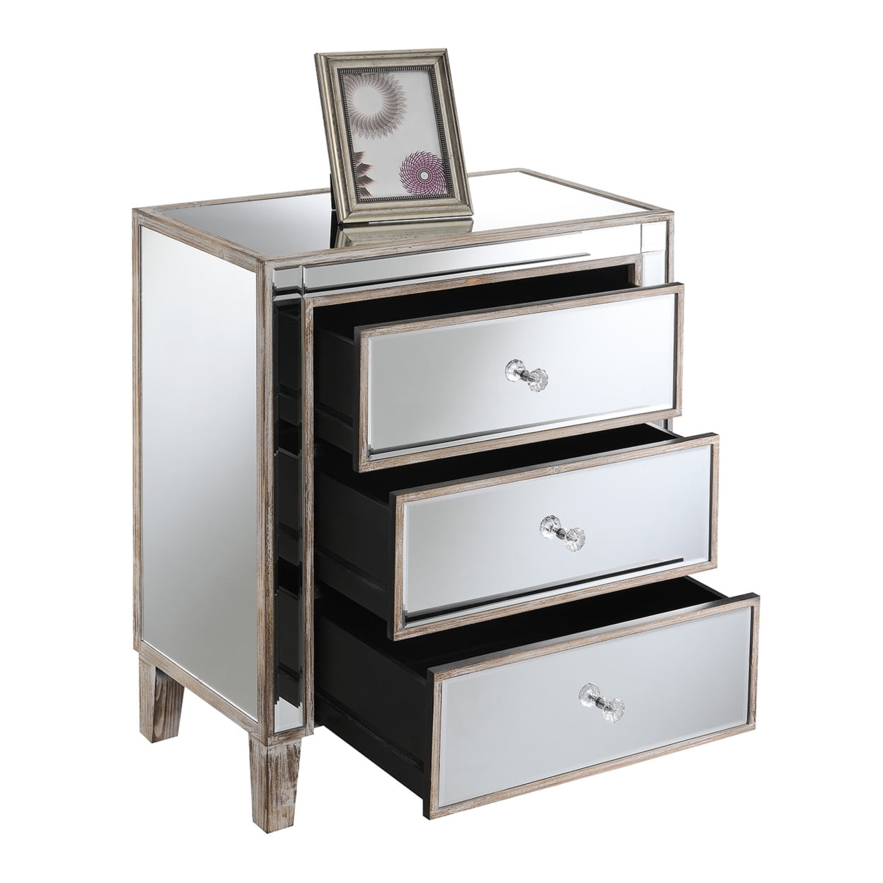 Distressed Finish: Yes Finish:Weathered White/Mirror Gold Coast Collection 3 Drawers Mirrored Glass Panels Available in Multiple Finishes Minimal Easy Assembly Material: Beveled Mirror Mdf Solid Wood Legs Item Weight: 46 Item Height: 28.5