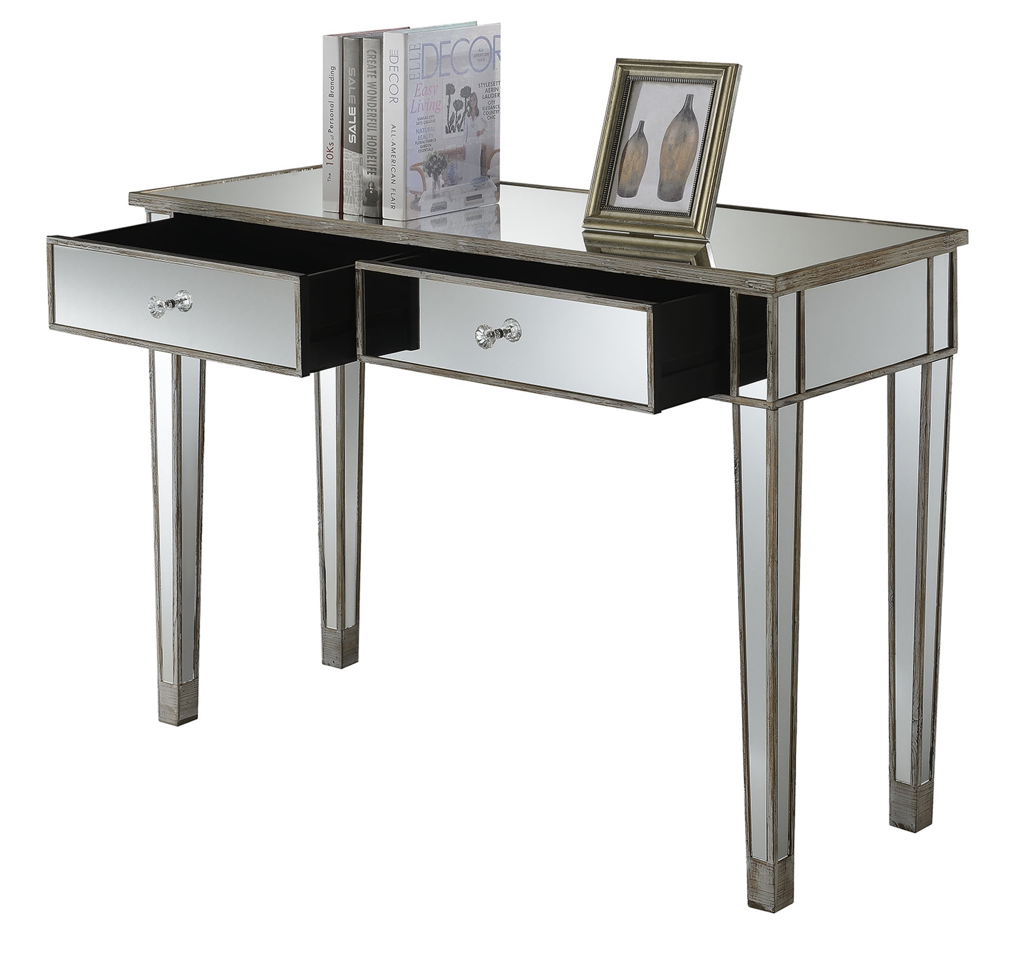 Add some glam to your home with this Gold Coast Mirrored 2 Drawer Desk/Console Table. This chic and sleek desk will bring any room to life with its luxurious glass mirrored panels. Two spacious pull-out drawers on roller slides reveal plenty of room for concealed storage. Stylish crystal faux drawer knobs offer easy accessibility to all your home office or entryway essentials. Constructed from manufactured wood and glass mirrors; this multi-use desk is built to last. Beautiful silver non-lead-based paint surrounds the mirrored frame which gives this carefully crafted unit just the right amount of sparkle. This piece offers much versatility and can be utilized as a desk; console table; or vanity. Adults and young adults just love how Glam this table is!