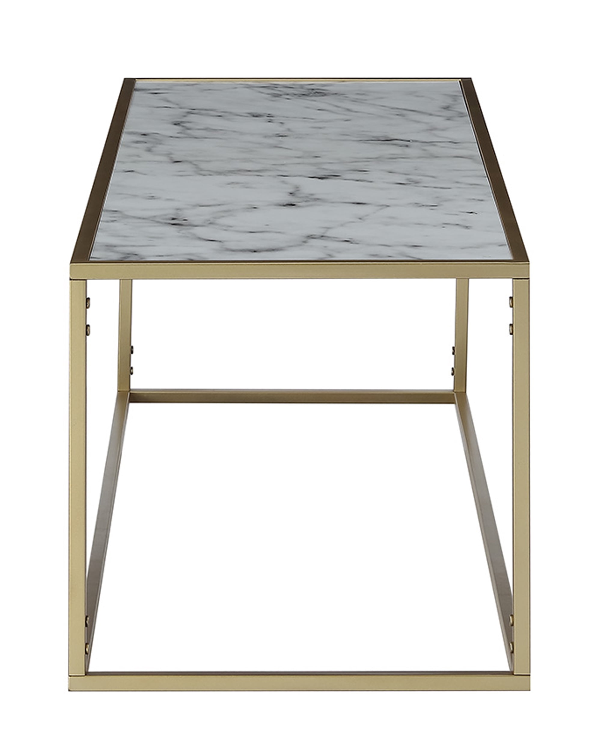 Beautiful white faux marble top and gold metal frame Material: Metal Tube, MDF Board with Marble Paper Melamine Contemporary style with a minimalist twist Easy two-step assembly Will upgrade the look of any decor 16.5″ H x 48″ W x 17″ D