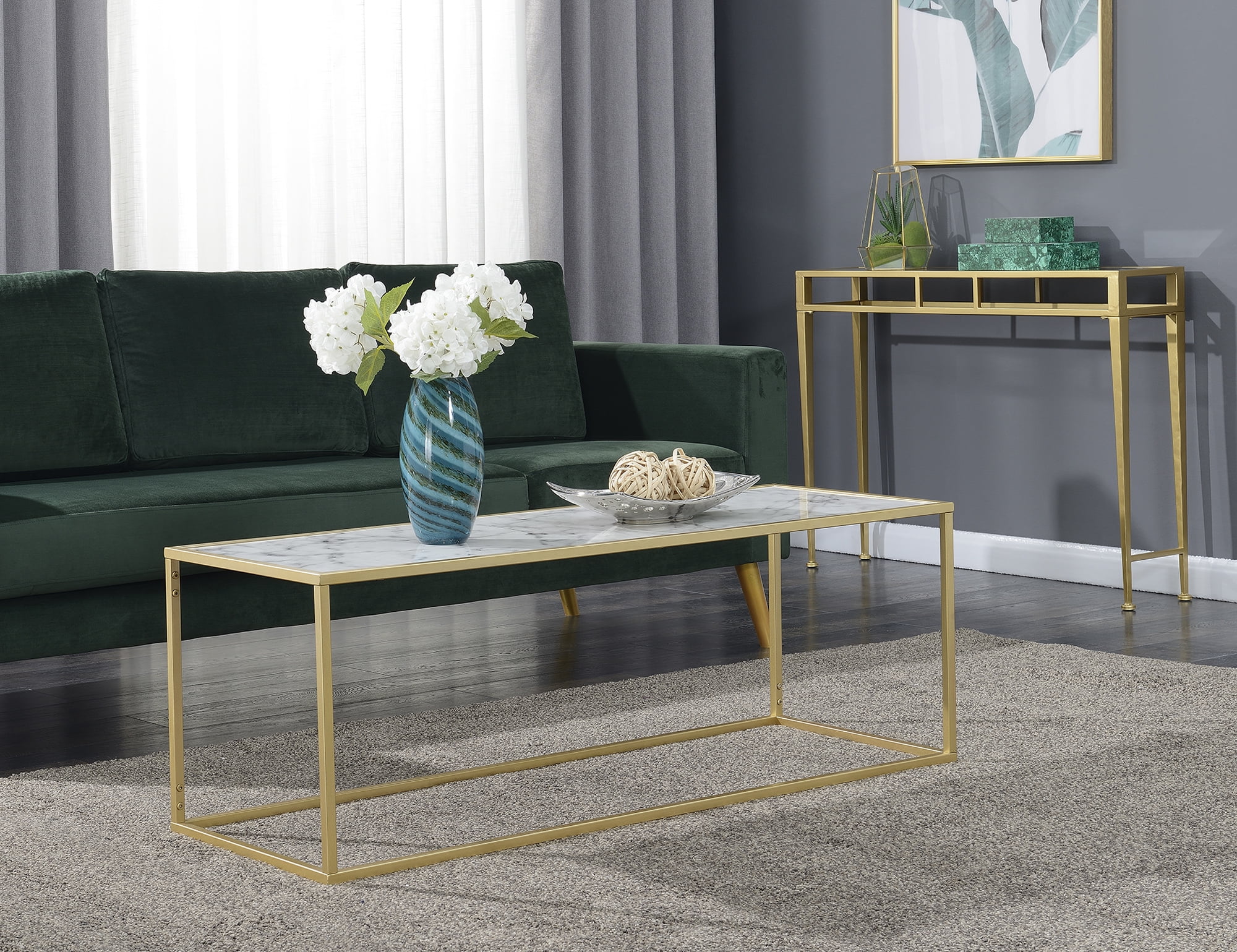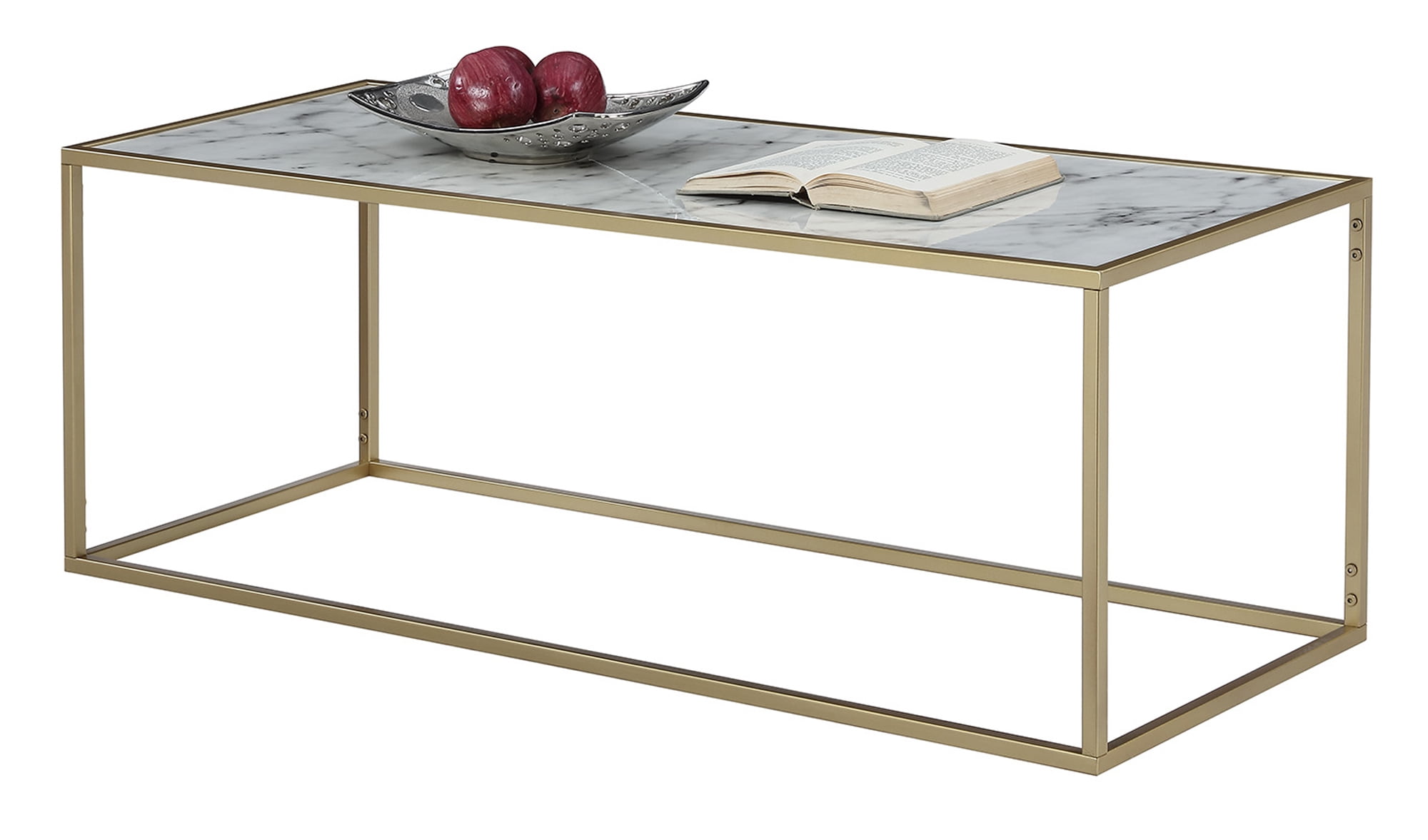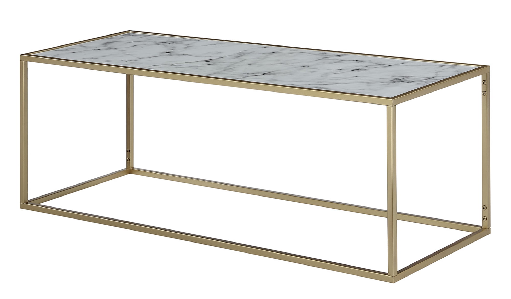 Create a luxurious and airy feel to any room in your home with the Gold Coast Faux Marble Coffee Table from Convenience Concepts. Boasting a contemporary style with a minimalist twist, it will refresh your decor. Featuring a rectangular table top made from MDF and finished with a glossy faux white marble with gray veining, and a frame crafted from gold powder coated metal, this table is built for durability and easy maintenance. Its clean-lined silhouette is perfect for showcasing your favorite mementos without overwhelming your home decor. Add this table to your living room or den in no time with its easy assembly of only two steps. Features: Beautiful white faux marble top and gold metal frame Material: Metal Tube, MDF Board with Marble Paper Melamine Contemporary style with a minimalist twist Easy two-step assembly Will upgrade the look of any decor 16.5″ H x 48″ W x 17″ D Specifications: Product Dimensions: 16.5″ H x 48″ W x 17″ D Product Weight: 18 lbs Weight Capacity: 44 lbs