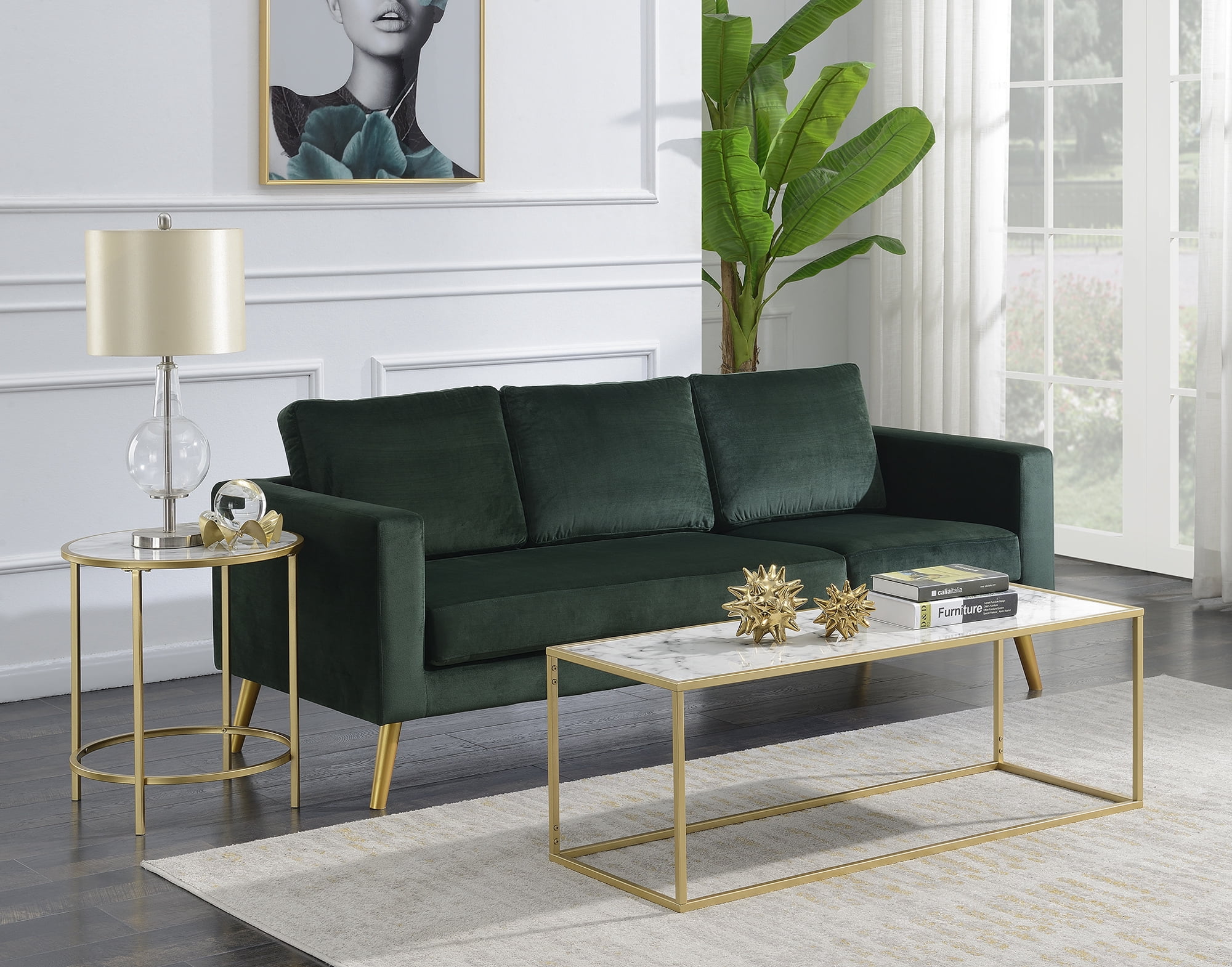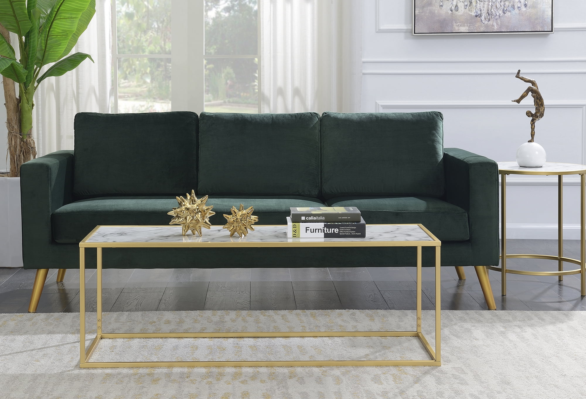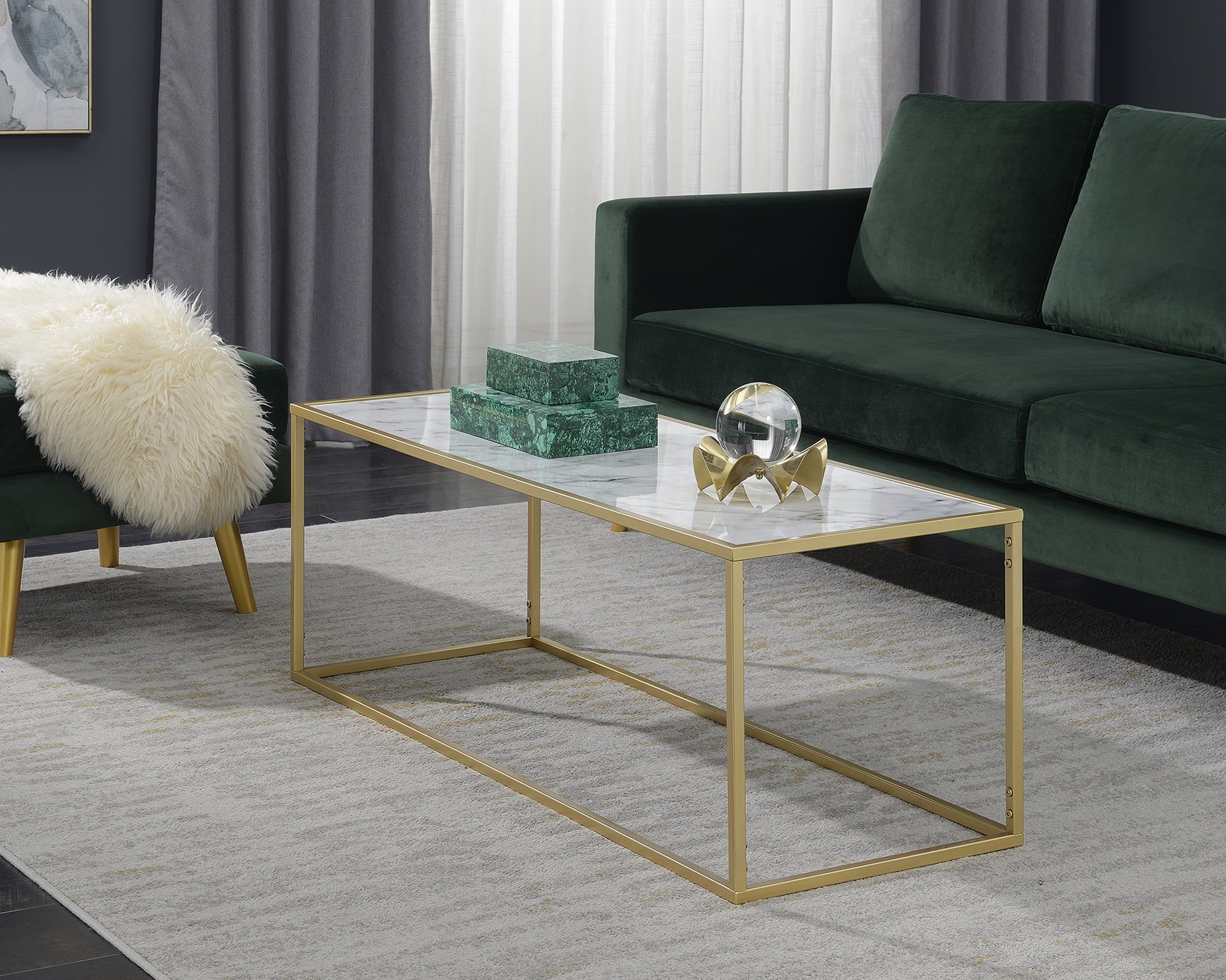 Create a luxurious and airy feel to any room in your home with the Gold Coast Faux Marble Coffee Table from Convenience Concepts. Boasting a contemporary style with a minimalist twist, it will refresh your decor. Featuring a rectangular table top made from MDF and finished with a glossy faux white marble with gray veining, and a frame crafted from gold powder coated metal, this table is built for durability and easy maintenance. Its clean-lined silhouette is perfect for showcasing your favorite mementos without overwhelming your home decor. Add this table to your living room or den in no time with its easy assembly of only two steps. Features: Beautiful white faux marble top and gold metal frame Material: Metal Tube, MDF Board with Marble Paper Melamine Contemporary style with a minimalist twist Easy two-step assembly Will upgrade the look of any decor 16.5″ H x 48″ W x 17″ D Specifications: Product Dimensions: 16.5″ H x 48″ W x 17″ D Product Weight: 18 lbs Weight Capacity: 44 lbs
