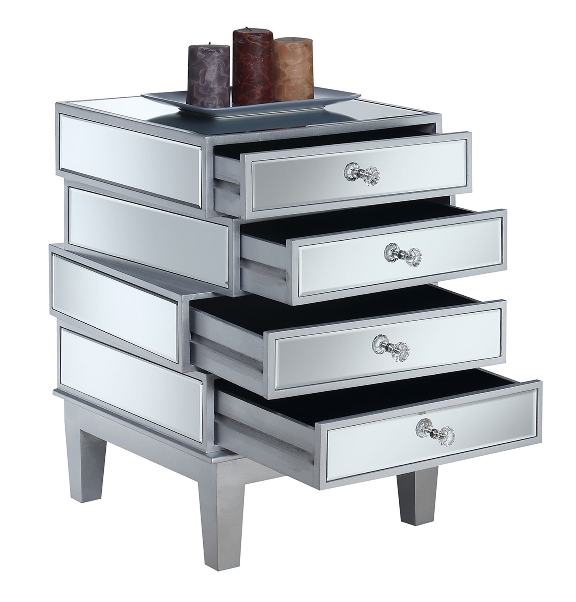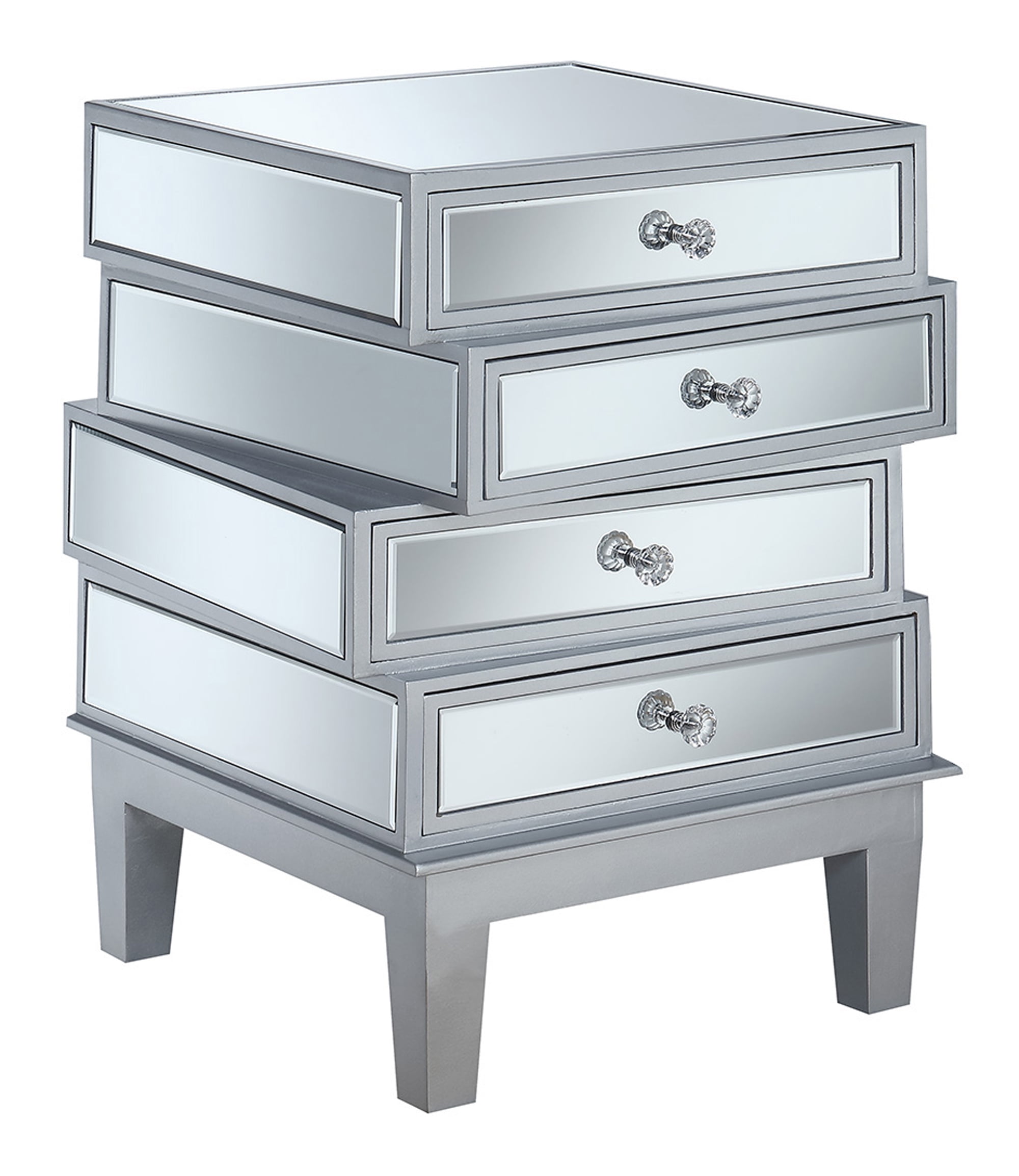 Features: Gold Coast Collection 4 Drawers Faux Crystal Rosette Drawer Knobs Mirrored Panels Product Dimensions: (L) 19.25 in. x (W) 19 in. x (H) 26.5 in.