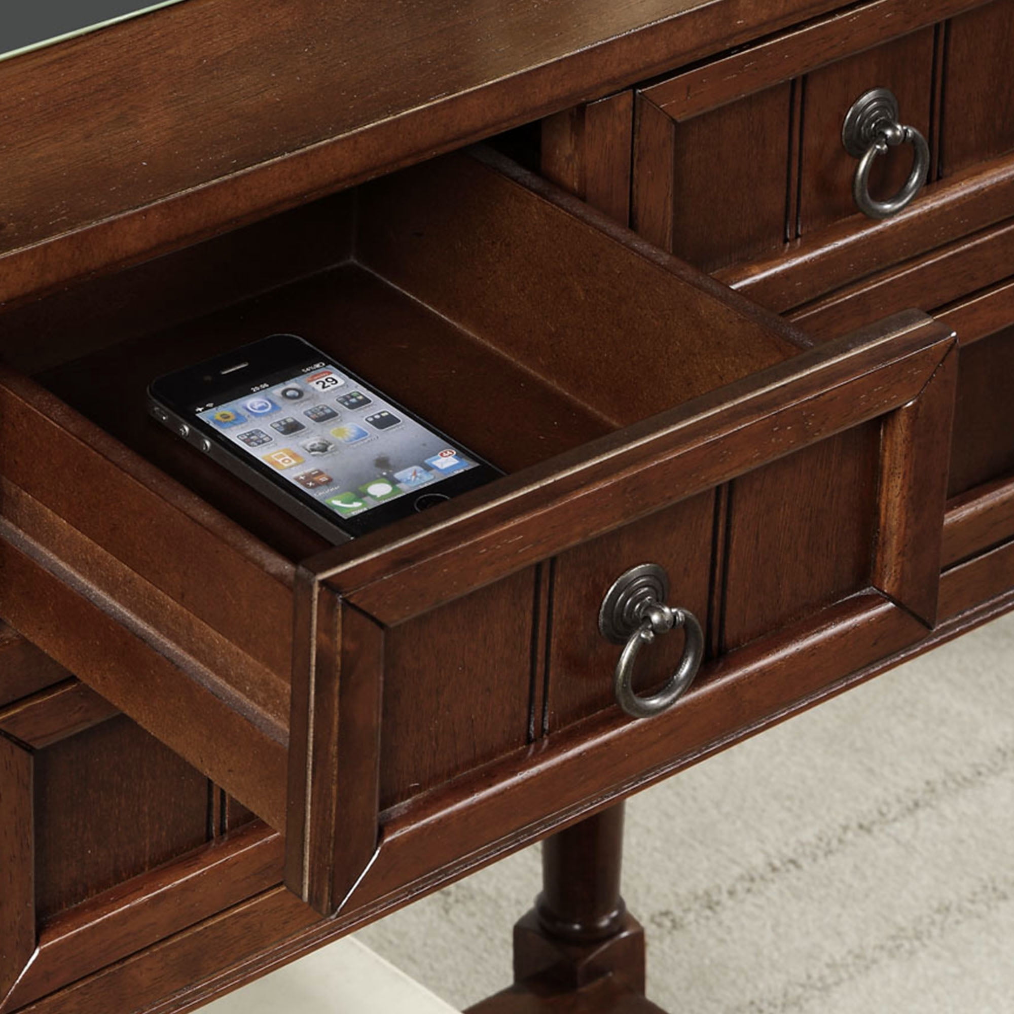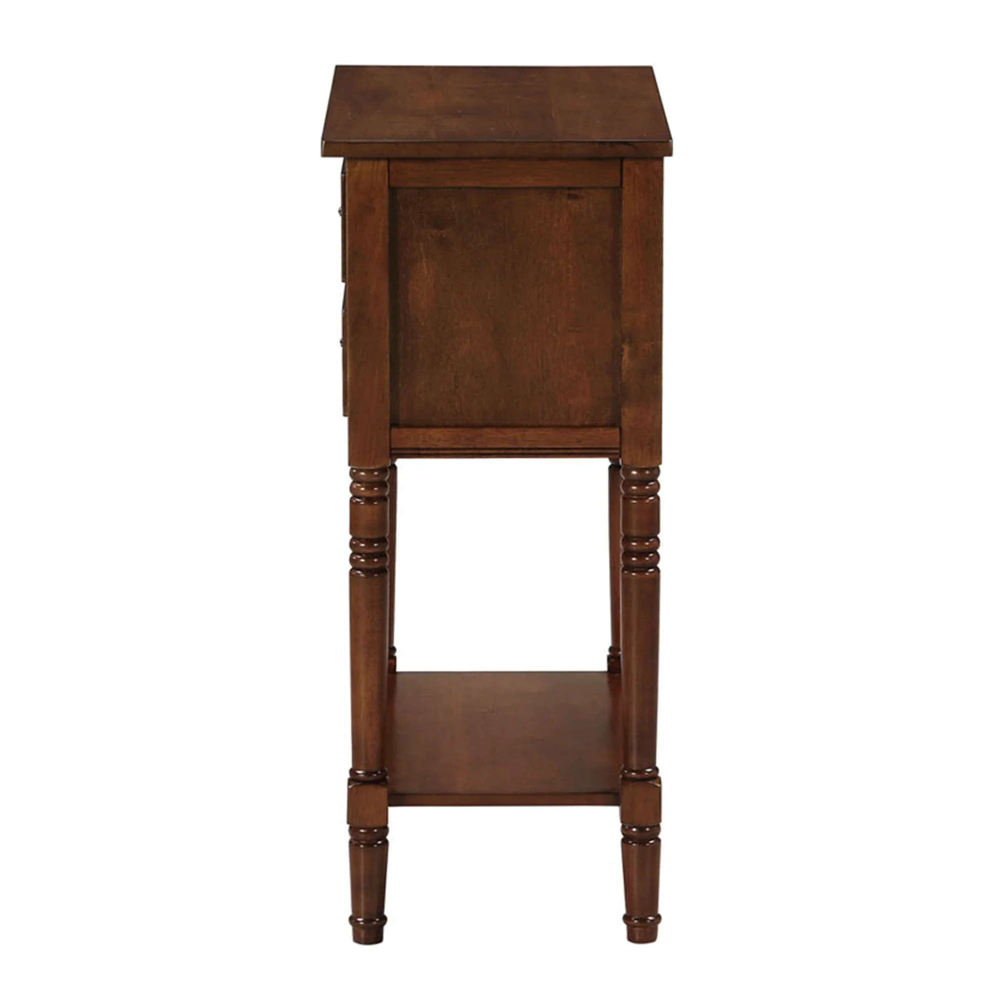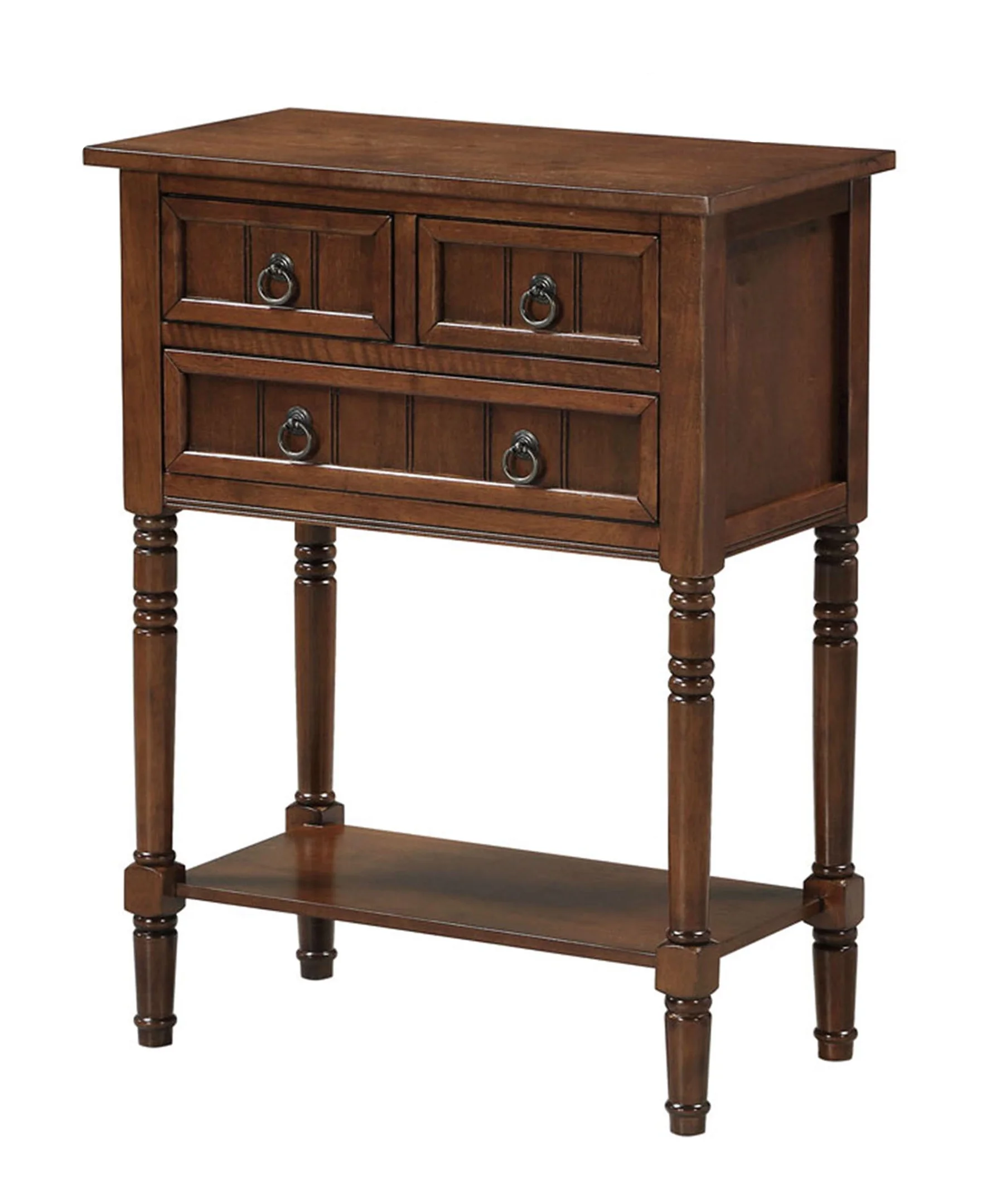 Traditional and transitional style Arrives almost fully assembled, only 2 steps required to setup in minutes and no tools needed Crafted from solid and manufactured wood 3 shaker drawers for concealed storage and 2 tiers of shelving Beautiful sculpted turned legs Low maintenance, easy to clean, and built for durability To maintain and protect your furniture, regularly wipe down all surfaces with a soft clean dry cloth Assembled item weight: 28 lbs. Maximum top shelf weight capacity: 35 lbs. Maximum bottom shelf weight capacity: 20 lbs. Assembled product dimensions: (L) 23.75 in. x (W) 13 in. x (H) 30.75 in. Color may vary slightly due to photography lighting or monitor display