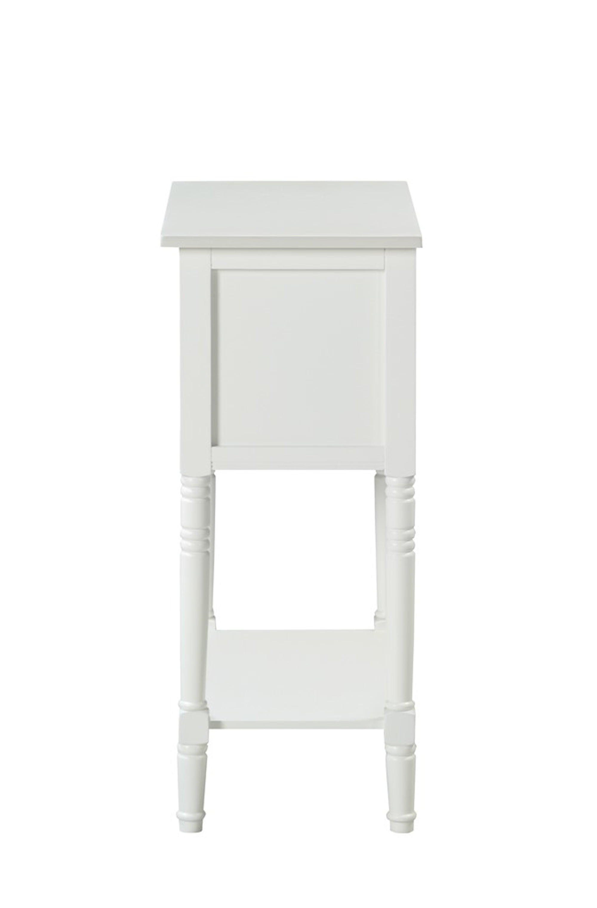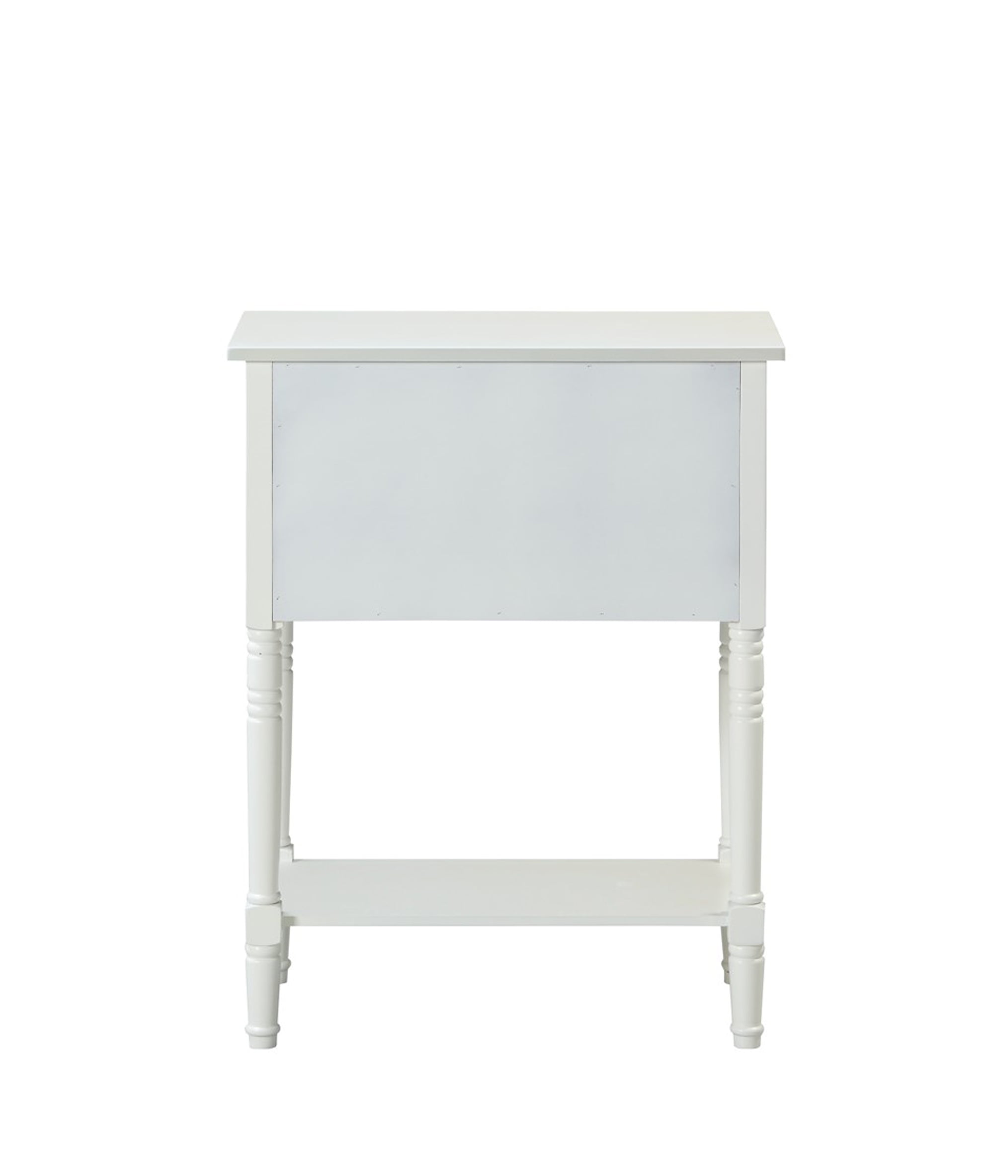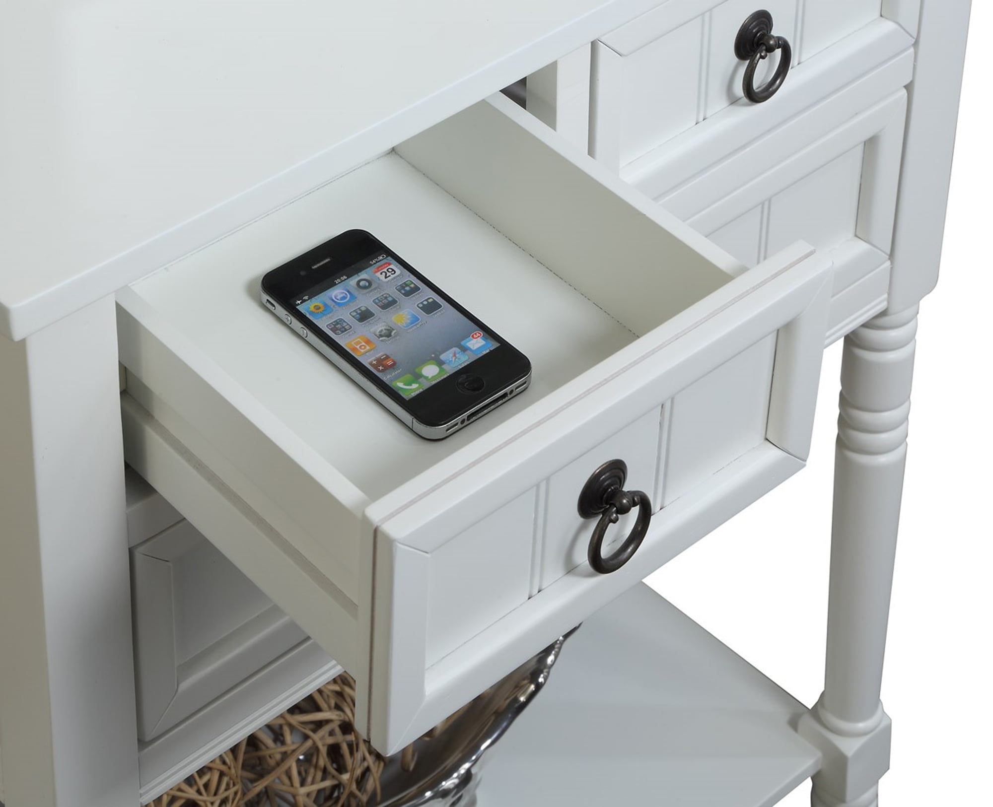 Traditional and transitional style Arrives almost fully assembled, only 2 steps required to setup in minutes and no tools needed Crafted from solid and manufactured wood 3 shaker drawers for concealed storage and 2 tiers of shelving Beautiful sculpted turned legs Low maintenance, easy to clean, and built for durability To maintain and protect your furniture, regularly wipe down all surfaces with a soft clean dry cloth Assembled item weight: 28 lbs. Maximum top shelf weight capacity: 35 lbs. Maximum bottom shelf weight capacity: 20 lbs. Assembled product dimensions: (L) 23.75 in. x (W) 13 in. x (H) 30.75 in. Color may vary slightly due to photography lighting or monitor display