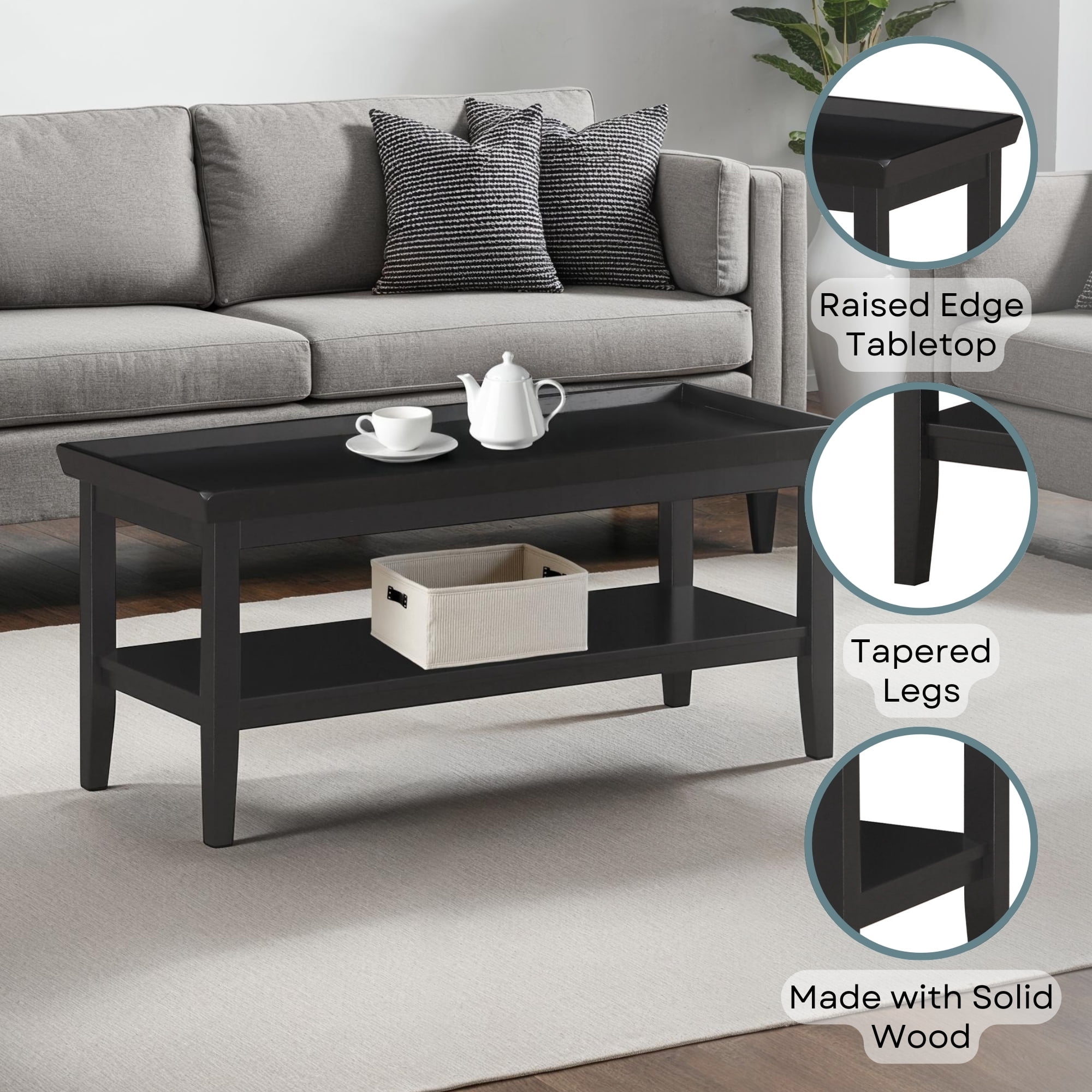 The simple, yet charming look of the Ledgewood Coffee Table from Convenience Concepts offers a practical solution for any home. Beautifully crafted from solid rubberwood, this piece will stand up to any occasion. The tray-like table top with raised edges will keep all of your belongings safely and securely on the table without any worries of broken clocks, lamps, or any other fragile items you may keep. Also featuring a bottom shelf for additional storage and display, so you can showcase your favorite collectibles or add a basket to neatly organize remote controls for any media or gaming consoles. Clean lines paired with a classic tapered leg give this piece a timeless look. Available in multiple finishes, the Ledgewood End Table will easily complement any new or existing decor. Look for other items from the Ledgewood Collection by Convenience Concepts for the complete look; each sold separately. Features: Beautiful black wood finish Solid Rubberwood Construction Material: Solid Rubber Wood Legs, MDF Shelves, Rubber Wood Veneer Ledgewood Collection Raised Tray Like Edges Tapered Legs with Clean Lines Available in Multiple Finishes 20″ H x 42″ W x 18″ D Specifications: Product Dimensions: 20″ H x 42″ W x 18″ D Product Weight: 36