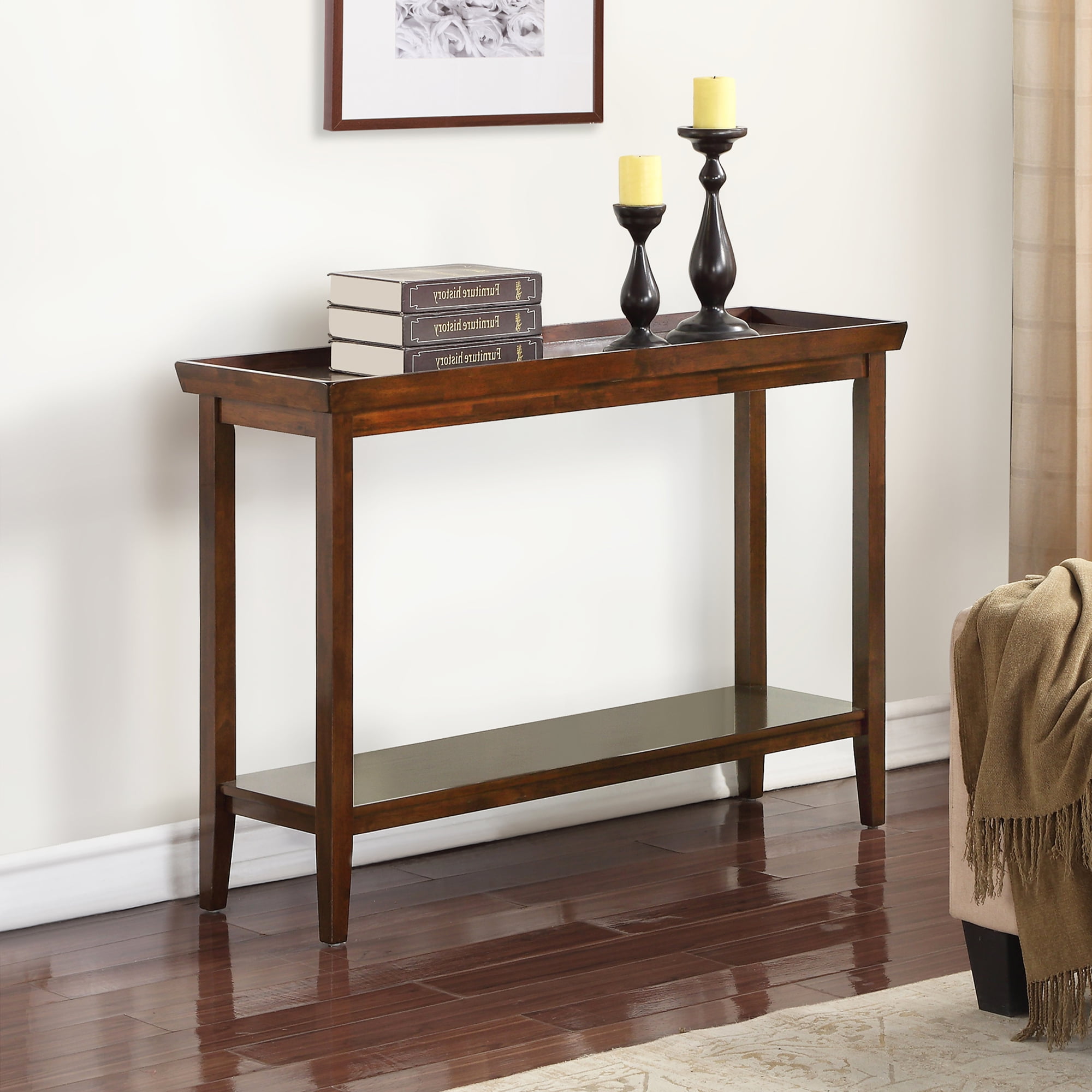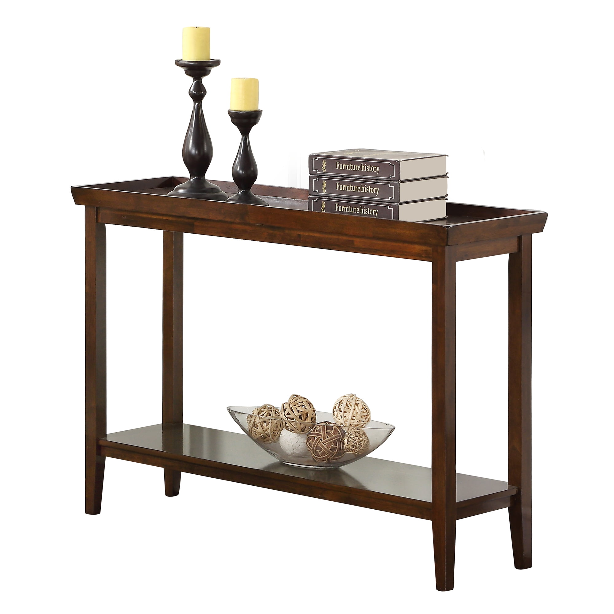 Convenience Concepts Ledgewood Console Table with Shelf, Espresso Features: Part of the Ledgewood Collection by Convenience Concepts Traditional & Contemporary Style 2 Tiers of Spacious Shelving Built from Solid Rubberwood; Rubberwood Veneer; & Manufactured Wood Assembled Item Weight: 38 lbs. Assembled Item Dimensions: (L) 48 in. x (W) 15 in. x (H) 34 in. Color May Vary Slightly Due to Photography Lighting or Monitors Display