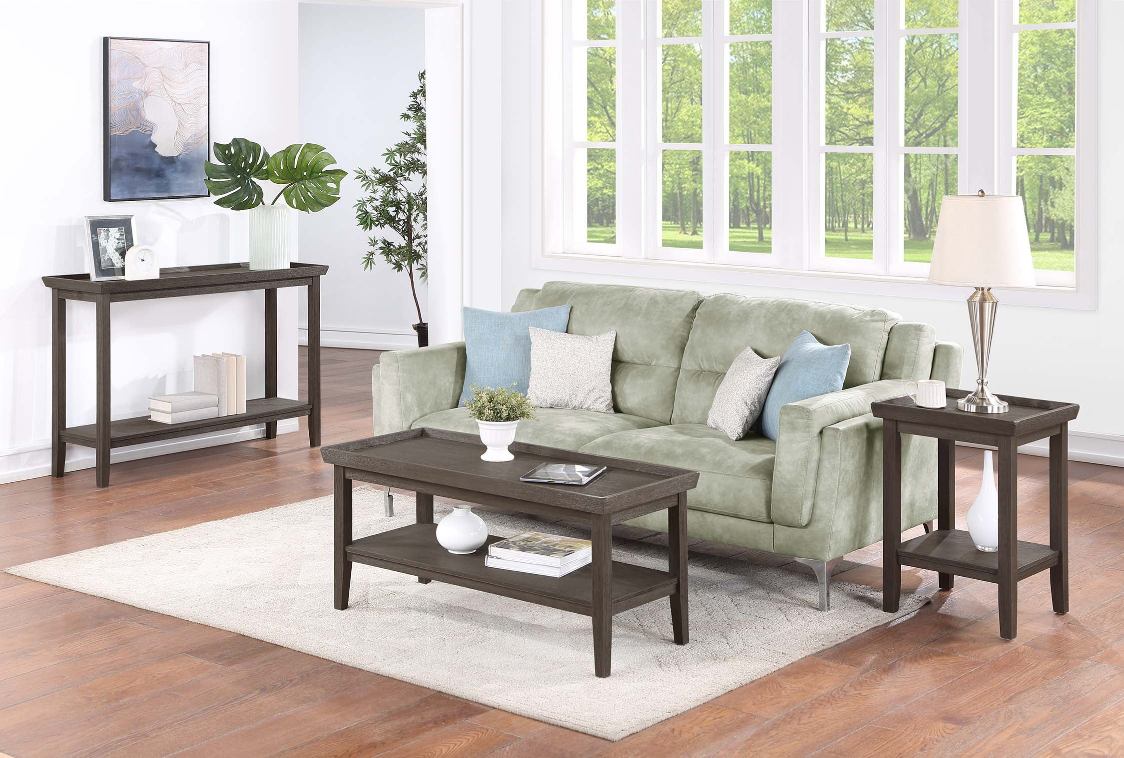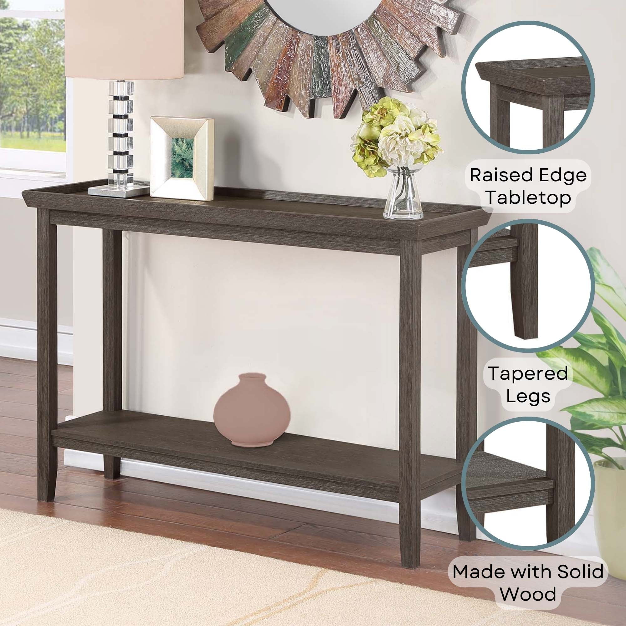 Part of the Ledgewood Collection Available in Multiple Finishes Two Tiers of Spacious Shelving Built from Solid Rubberwood, Rubberwood Veneer, and Manufactured Wood (L) 48 in. x (W) 15 in. x (H) 34 in. Color May Vary Slightly Due to Photography Lighting or Monitors Display Beautiful gray wood finish