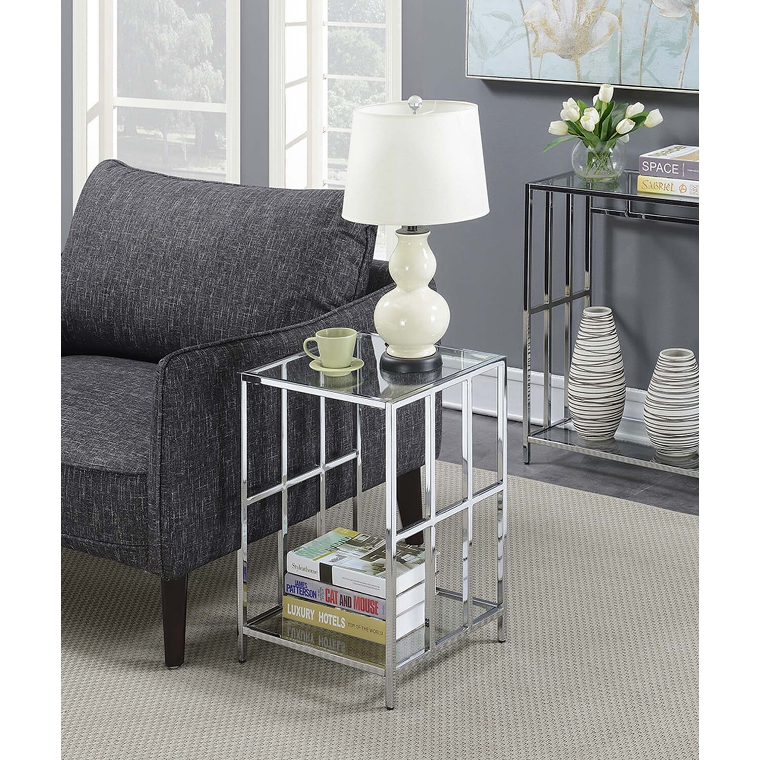 Refresh your home decor with the Mission Glass End Table by Convenience Concepts. Boasts a classical style with a contemporary twist, that will not go unnoticed by your family or guests. Dressed in two tiers, it offers plenty of storage and display space for all your entertainment essentials. Ideal for your living room, home study or entryway, this accent piece’s versatility has no limits. Beautifully designed with shelves crafted from clear tempered glass and a frame welded from metal, its sturdiness and easy maintenance is certain. Not only is this unit easy on the eyes but it is also easy to assemble as it requires only 3 steps. Features: Provides a classical style with a contemporary twist Crafted from metal and clear mirrored glass Enjoy in no time with its simple three-step assembly! Beautiful chrome frame finish Will complement any modern decor 24″H x 15.75″W x 15.75″D Specifications: Product Dimensions: 24″H x 15.75″W x 15.75″D Product Weight: 19 lbs