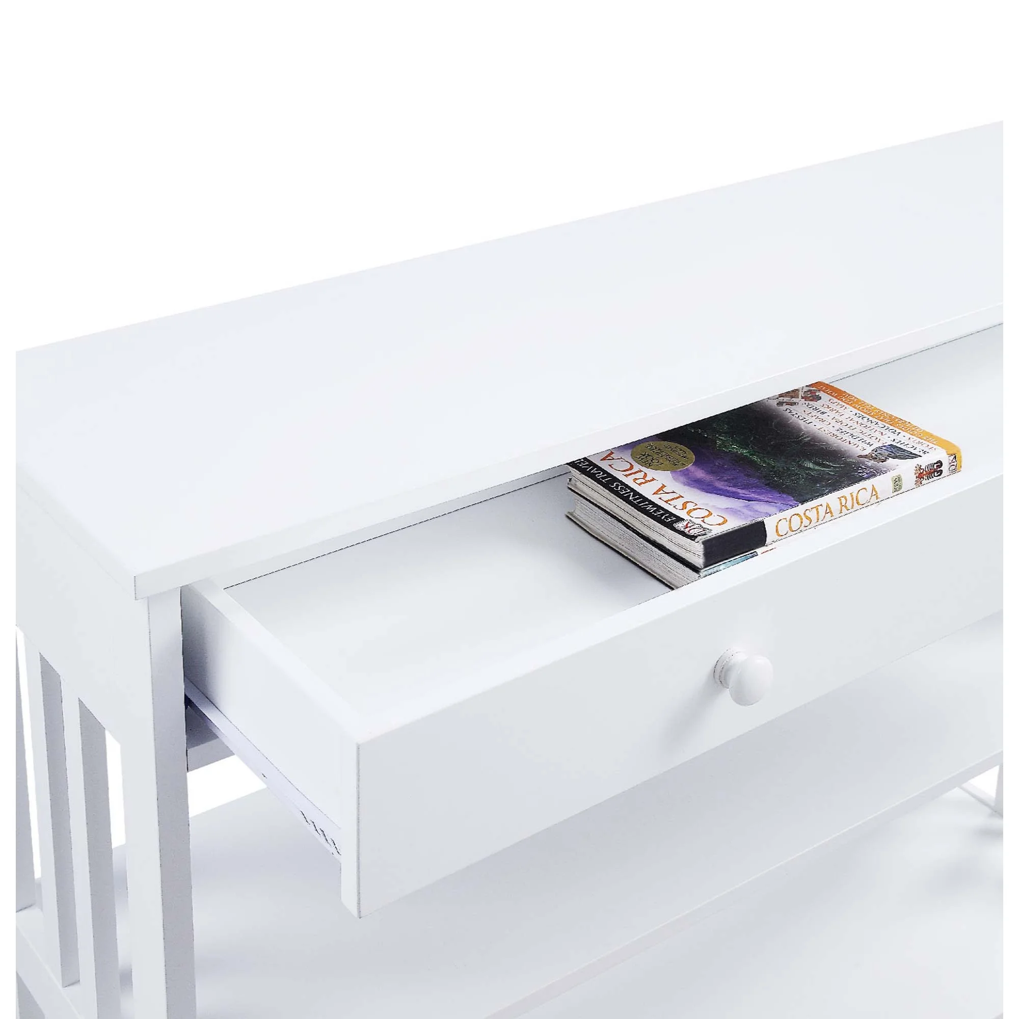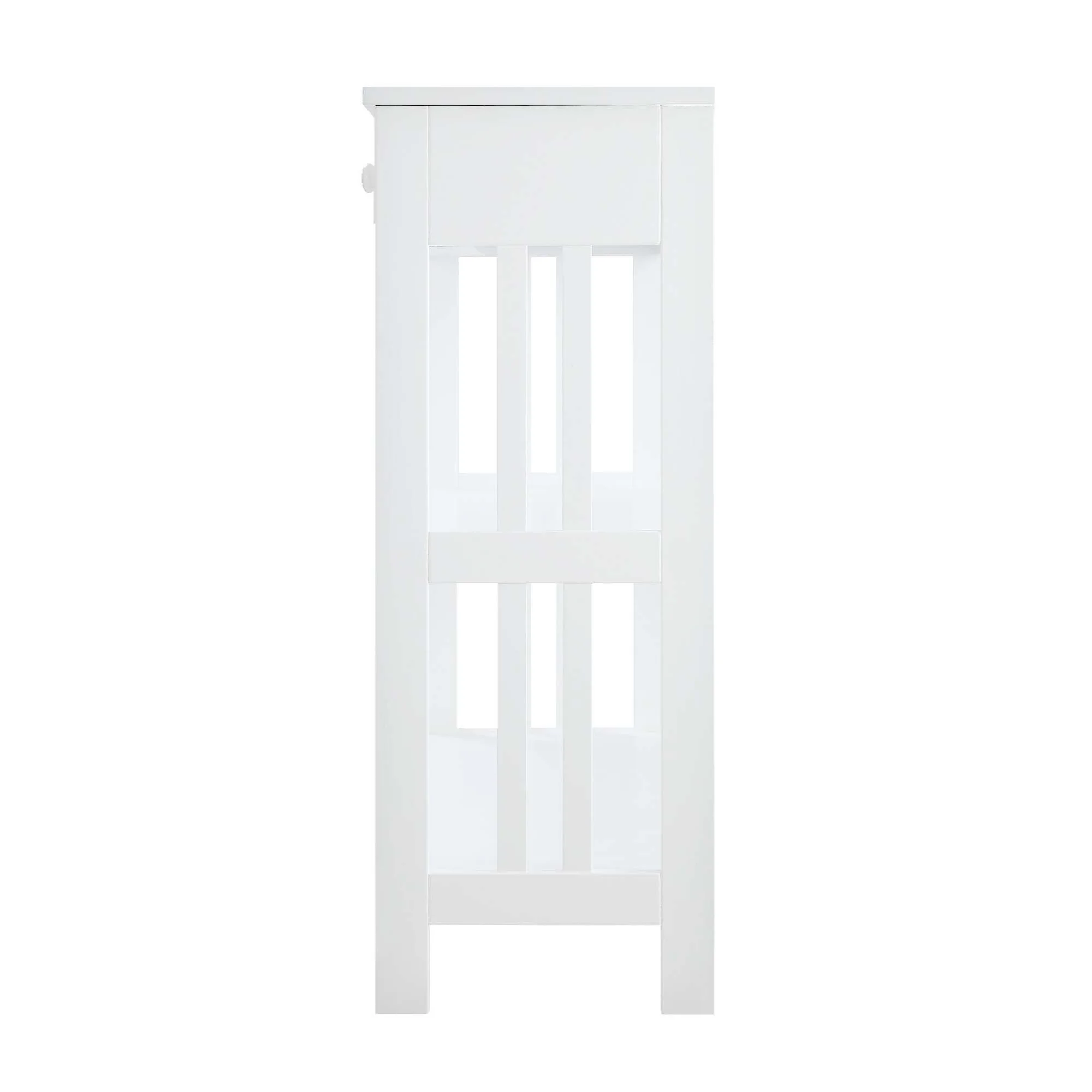 Instantly optimize your storage and display space by bringing home the Mission 1 Drawer Console Table by Convenience Concepts. Offers three ample shelves, enough for all your beloved mementos and one drawer for those unsightly essentials. The drawer is accompanied by roller style metal drawer slides, to help you open and close the drawer smoothly. Do not forget about the signature style side frames, they give this piece its sleek look and contemporary style. Crafted from MDF and finished in a non-lead based paint, this accent unit was built for durability. Add to your entryway, hall or living room and enjoy its endless versatility. Allow this furniture to become a staple in your home right after delivery with its simple 9-step assembly. Features: Flaunts a contemporary style Made from MDF and non-lead based paint Offers a simple nine-step assembly Beautiful white wood finish Will complement any decor 31.5″H x 12″W x 39.5″D Specifications: Product Dimensions: 31.5″H x 12″W x 39.5″D Product Weight: 42 lbs