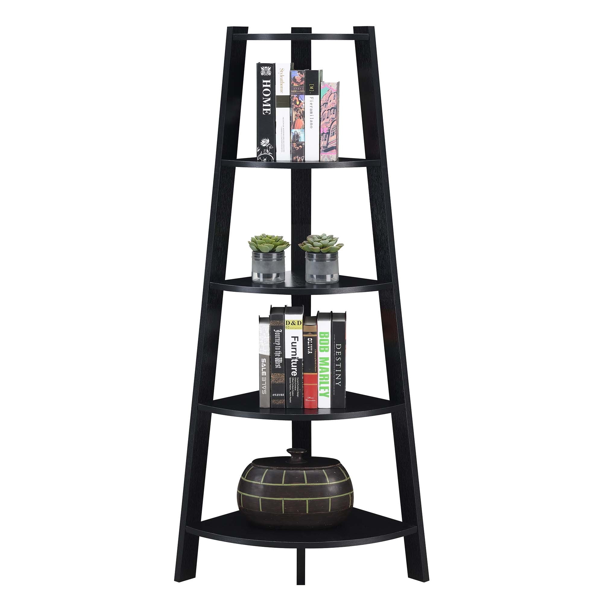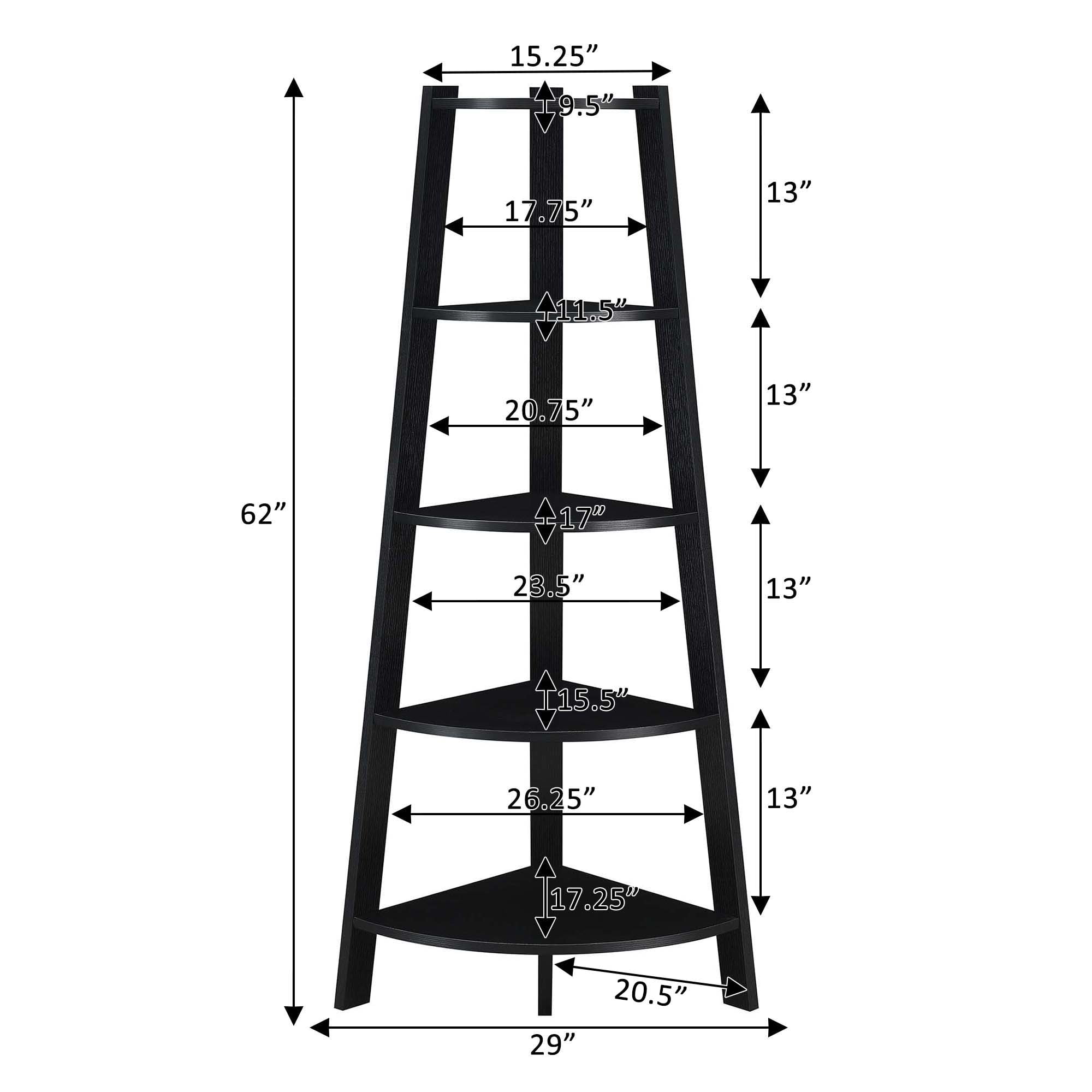 Convenience Concepts Newport 5 Tier Wide Corner Bookcase, Black Features: Part of the Newport Collection by Convenience Concepts Contemporary & Modern Styles 5 Tiers of Wide Shelving Engineered from Particleboard; MDF; & Melamine Veneer Assembled Item Weight: 28 lbs. Assembled Item Dimensions: (L) 20.5 in. X (W) 20.5 in. X (H) 62 in.