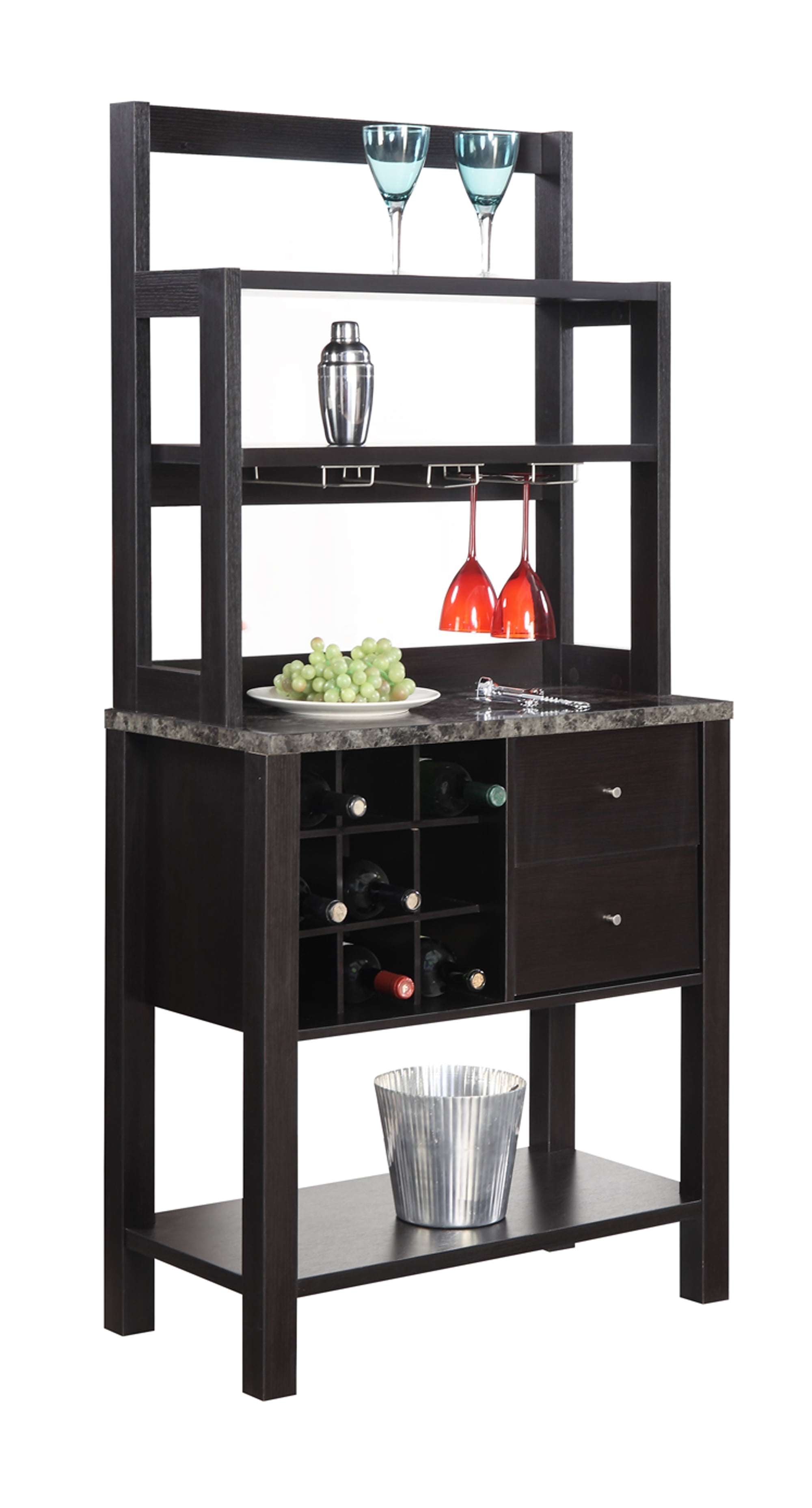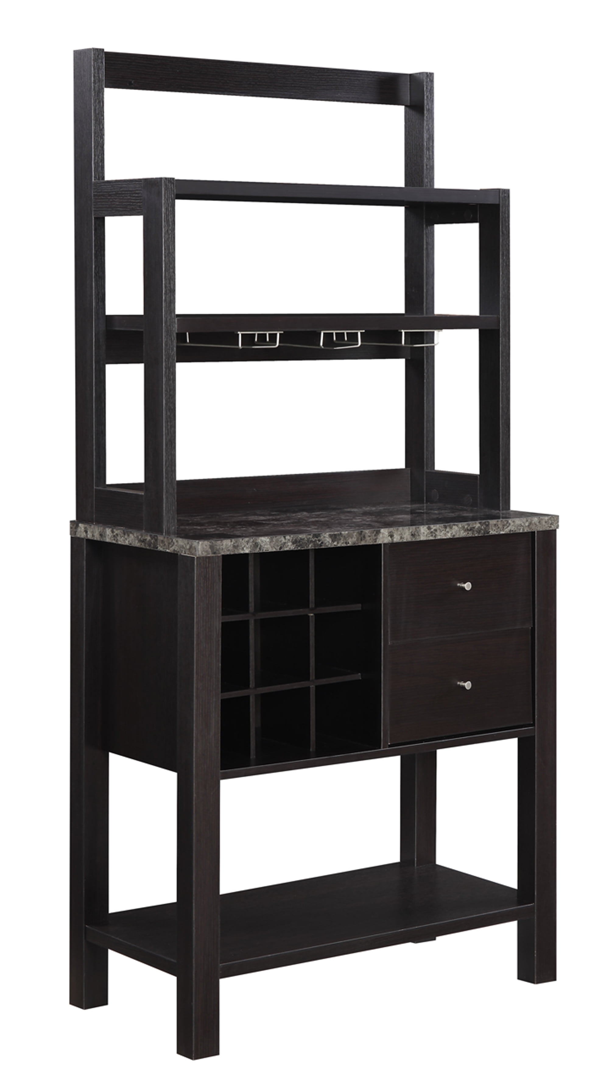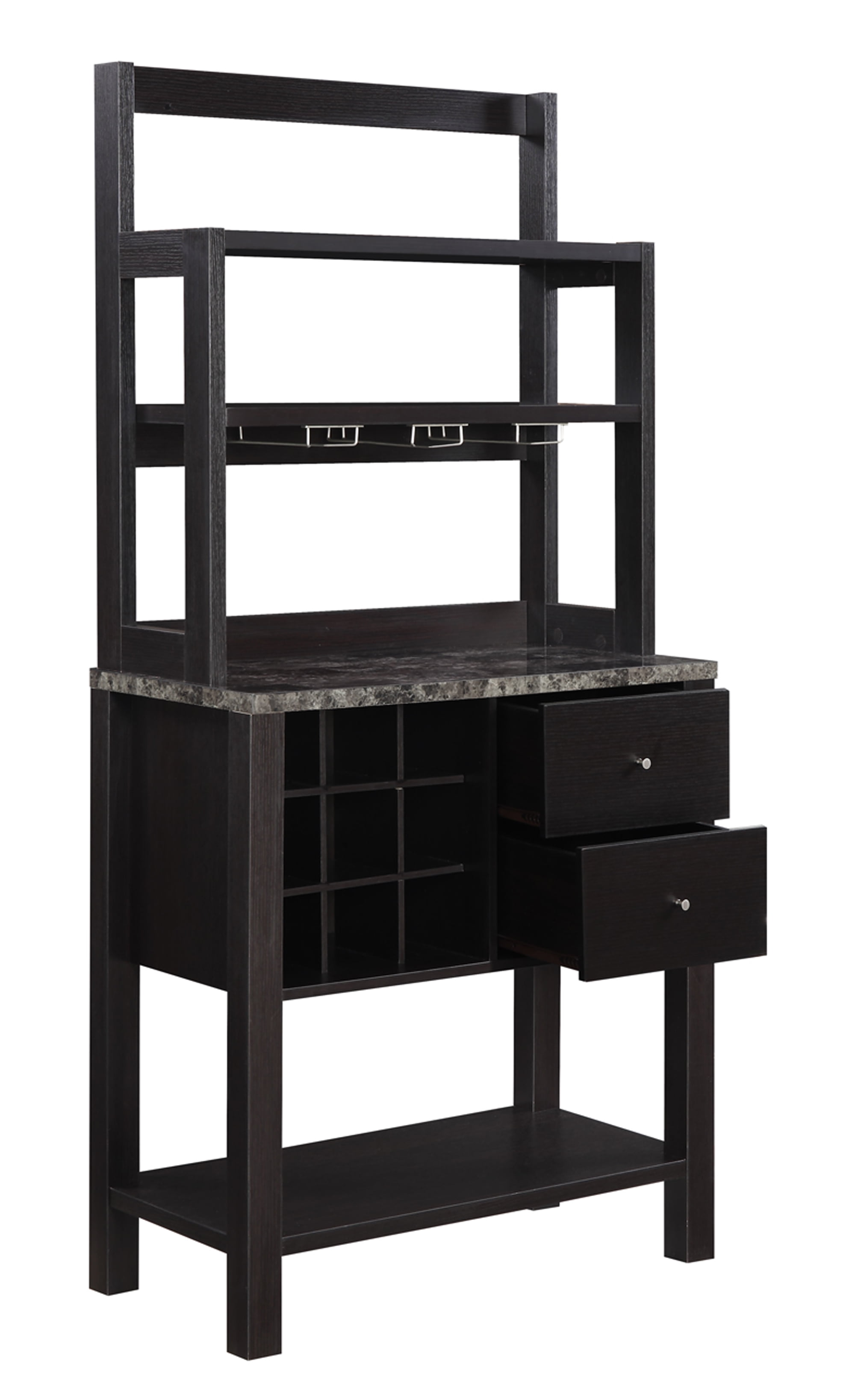 Upgrade your entertaining area with the Newport Serving Bar by Convenience Concepts. With a holding capacity of 9 wine bottles; you will have enough space for your favorite varieties. Better yet; it provides a total of 4 shelves; 3 top shelves and 1 bottom shelf; for all your crystal tumblers and must have beverages. It has 3 hanging stemware racks; to accommodate your wine glasses. The two drawers provide hidden storage to stow your cocktail shaker set and accessories. Not only is this sleek piece full of functionality but it is also very stylish. Its modern contemporary design will upgrade any room in your home. Place in your living room; den or home office and enjoy its endless versatility. Available in multiple finishes to become a staple in your home. Provides a simple assembly that is worth every step. Pair up with additional furniture pieces from the Newport Collection by Convenience Concepts. Each sold separately.