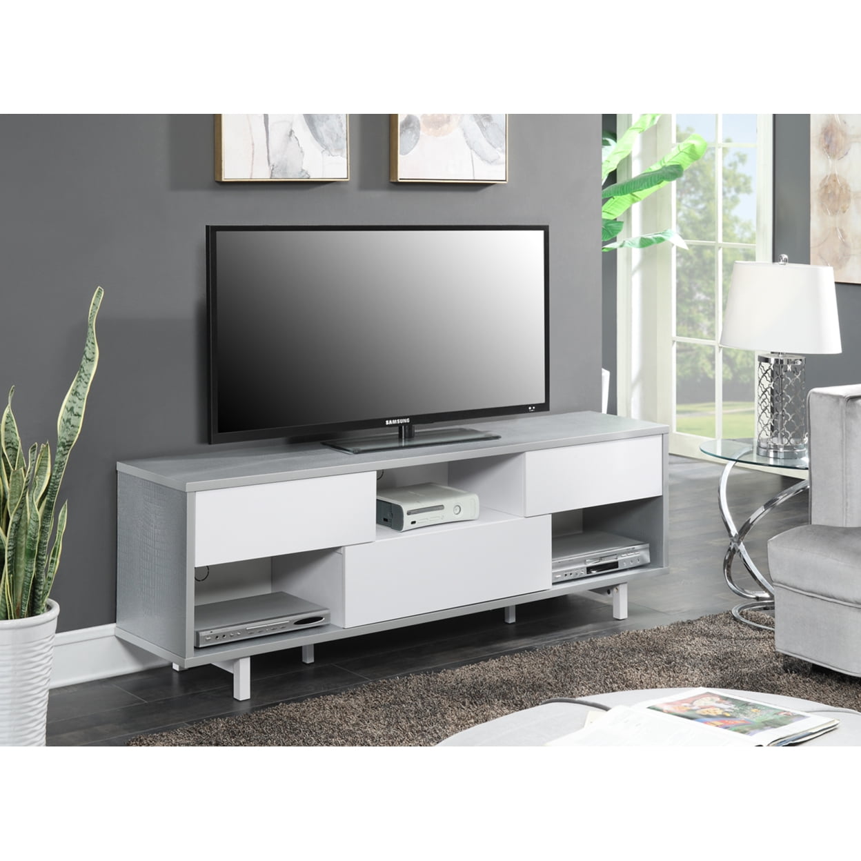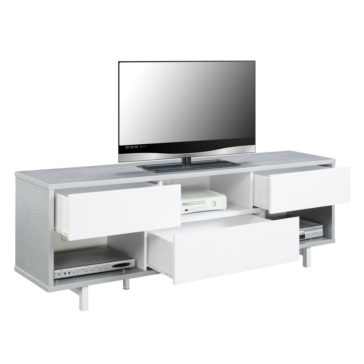Convenience Concepts Newport Ventura 60″ TV Stand: Grey Faux Crocodile pattern with White drawer front 3 drawers for concealed storage 3 open compartments for media or collectibles Holds up to a 60″ TV stand Easily complement any decor Televisions sold separately. See all televisions.