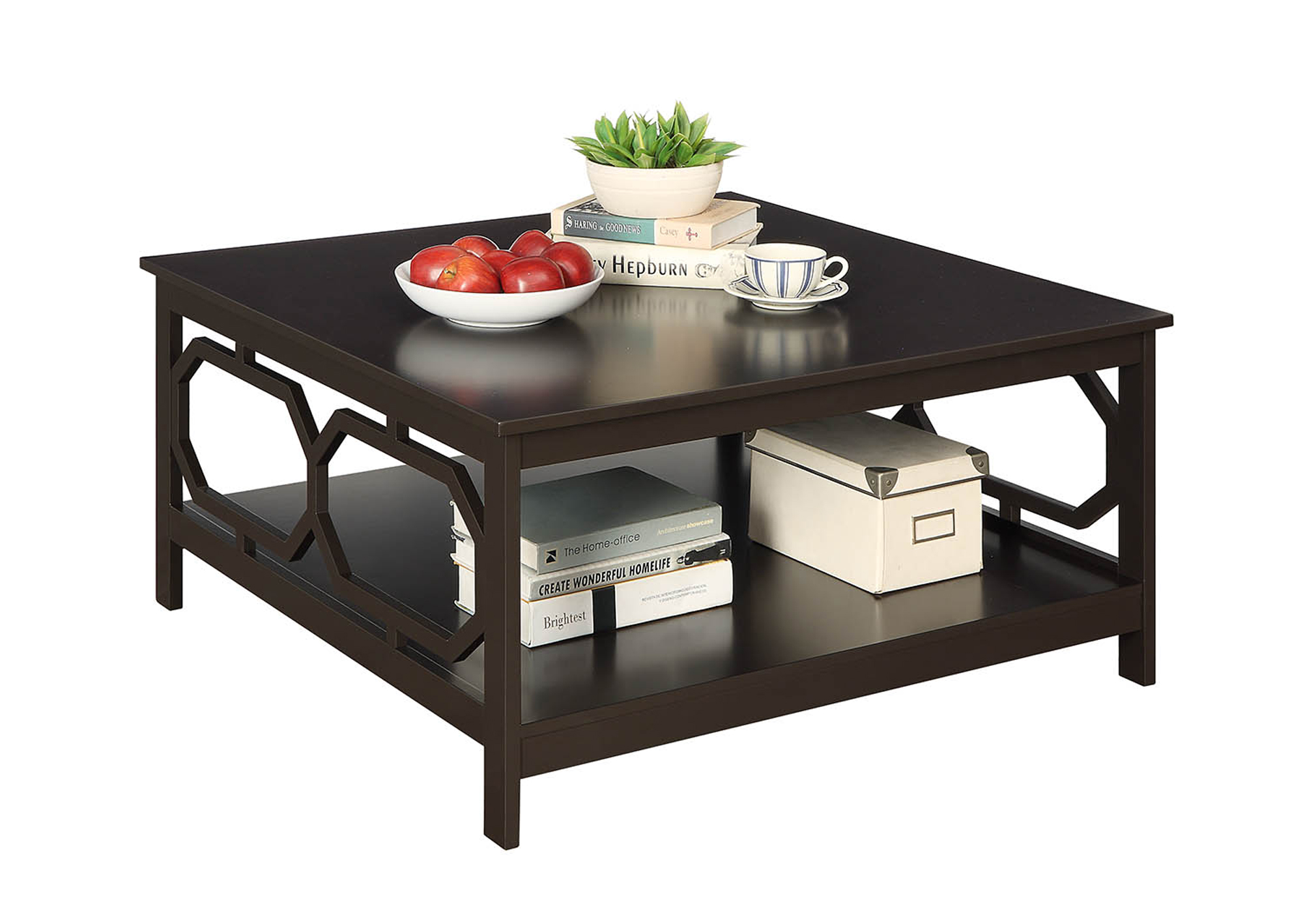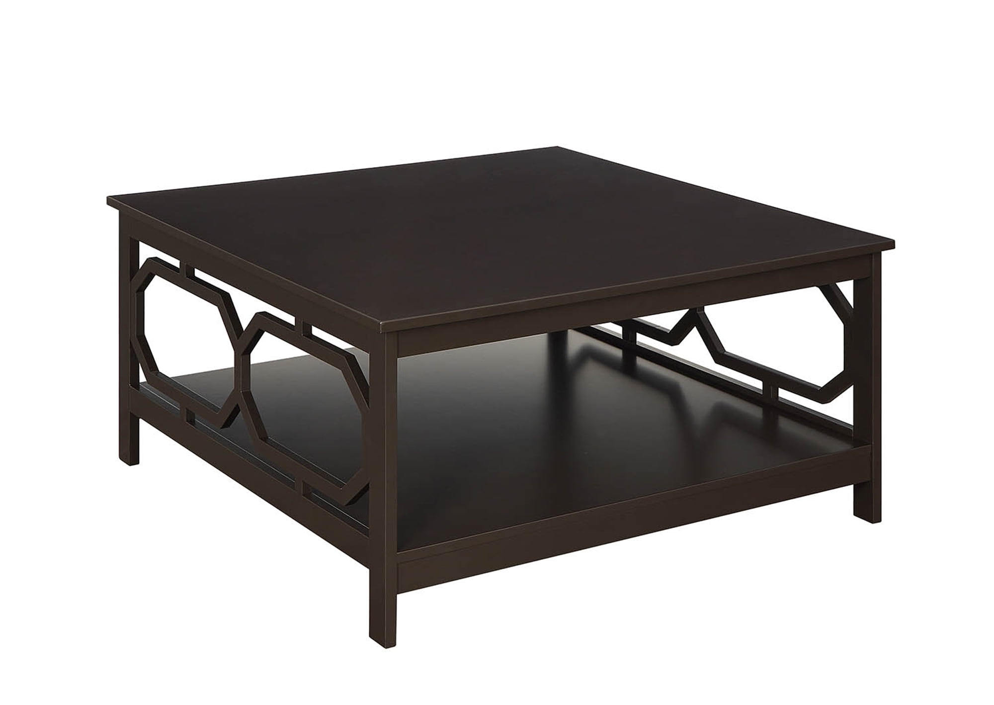 Reinvent your living room with the Omega Square 36” Coffee Table. The simple yet eye-catching design showcases clean lines and beautiful octagon cut outs on the sides. Available in multiple finishes it’s sure to complement any home decor. Featuring a large table top surface and a lower shelf that provides usable display space. Engineered for durability this piece will become a staple in your home. Look for other items from the Omega Collection for the complete look sold separately.