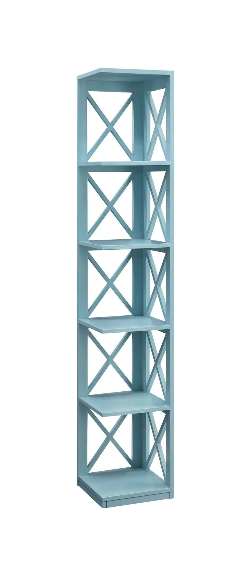 Convenience Concepts Oxford 5 Tier Corner Bookcase, Sea Foam Blue Features: Part of the Oxford Collection by Convenience Concepts Contemporary and Transitional Style Crossed X Design Corner Shelf 5 shelves for storage Will Provide Years of Enjoyment Quick and Easy Set Up Assembled Item Weight: 25 lbs. Assembled Item Dimensions: (L) 12in x (W) 12in x (H) 65.50in.