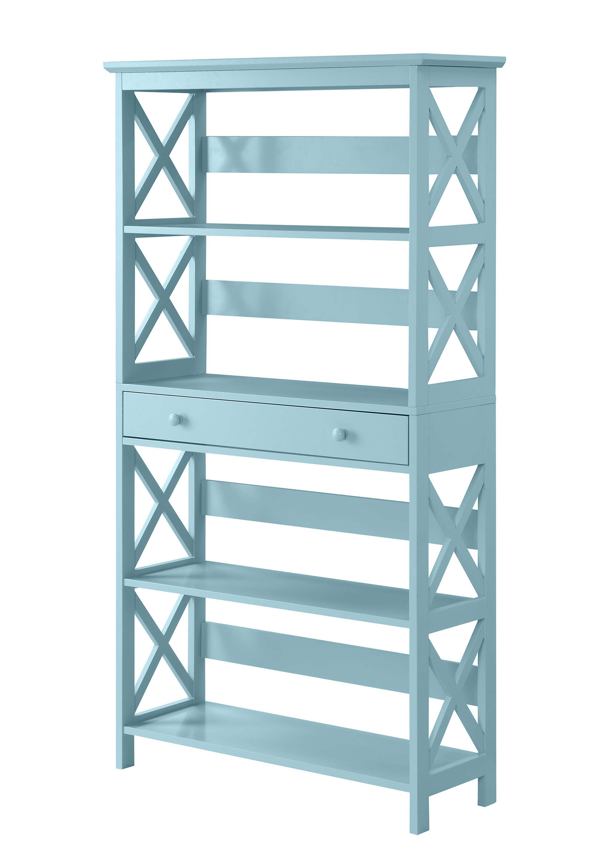 Give your home a handsome makeover with the Oxford Five-Tier Bookcase with Drawer from Convenience Concepts. Featuring five spacious shelves as well as one drawer for concealed storage, so you can display books and collectibles while hiding away unsightly accessories. Clean lines paired with the X pattern create a modern appeal. Crafted with functionality and contemporary styling in mind, the Oxford Five-Tier Bookcase with Drawer will become a staple in your home. Also available in multiple finishes, this piece will easily complement any home decor. Look for other items from the Oxford Collection for the complete look sold separately. Features: Oxford Collection X pattern on sides creates a contemporary edge to the style Five Spacious Tiers Beautiful sea foam wood finish Perfect for storing books or displaying decor Specifications: Product Dimensions: 31.5L x 11.75W x 59.75H Product Weight: 55
