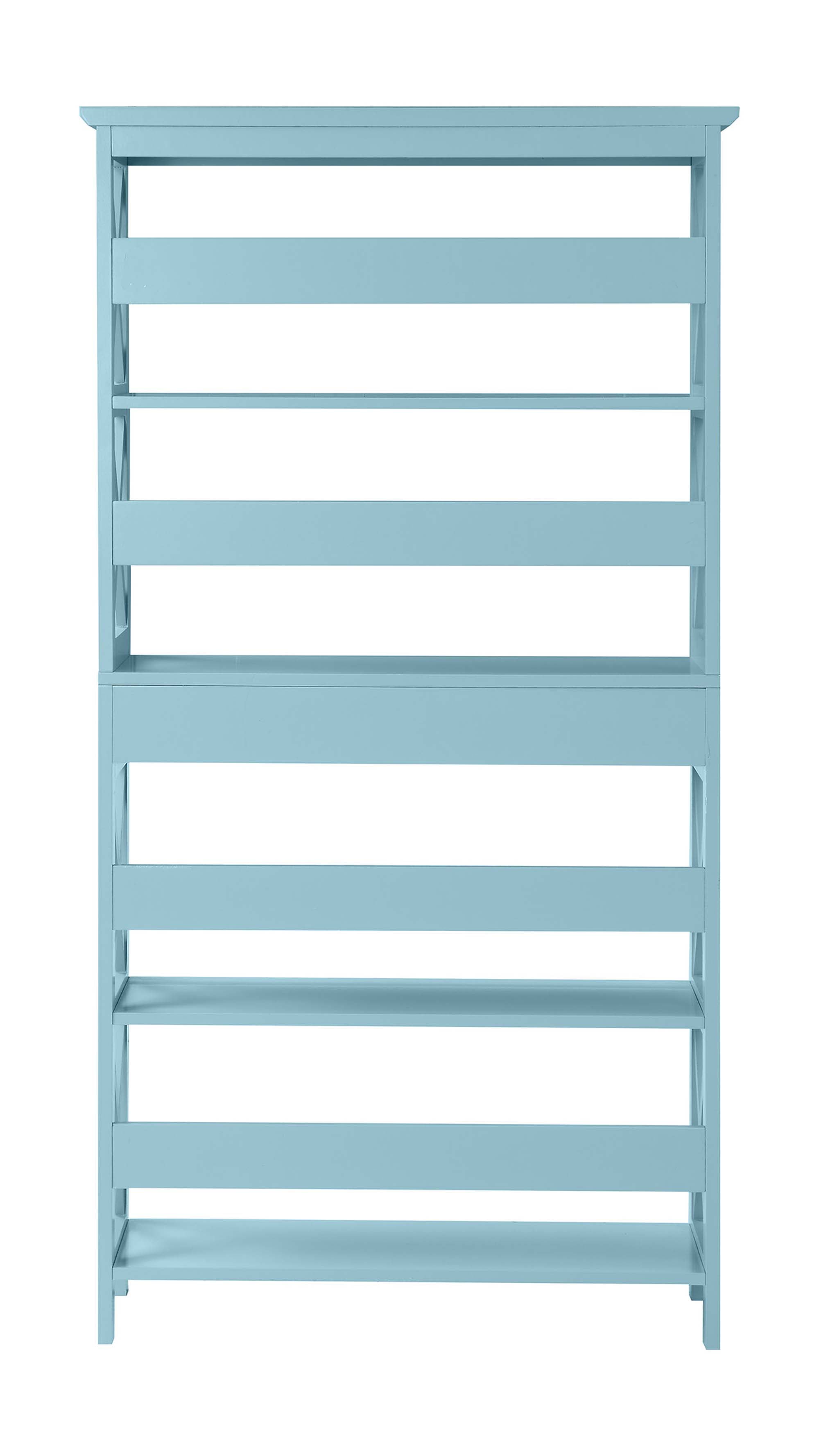 Oxford Collection X pattern on sides creates a contemporary edge to the style Five Spacious Tiers Beautiful sea foam wood finish Perfect for storing books or displaying decor