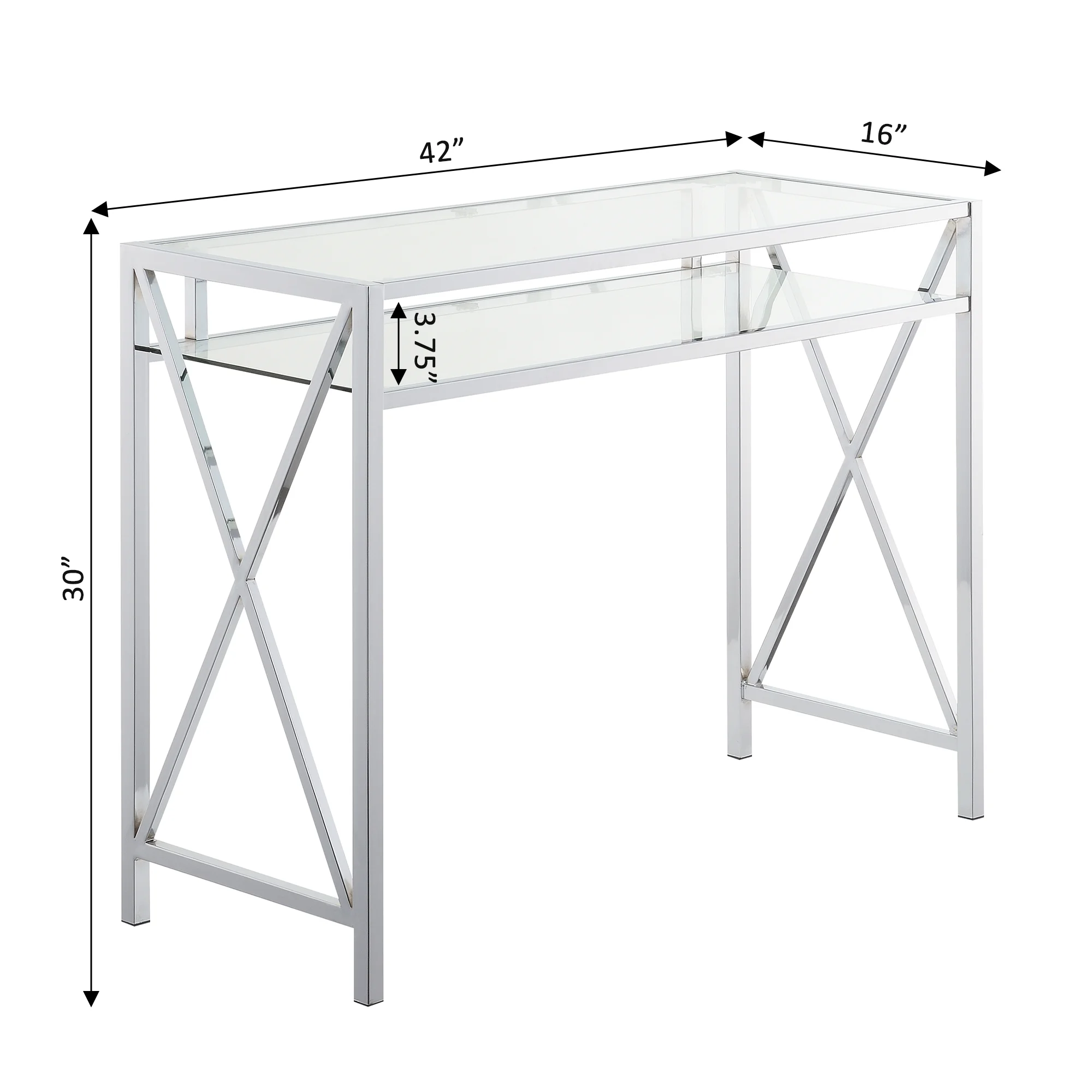 Part of the Oxford Chrome Collection by Convenience Concepts Coastal, modern, contemporary, and glam style Easy assembly with instructions provided Sturdy and sleek chrome metal frame Two clear tempered glass shelves Spacious desktop Unique X-frame side panels Low maintenance, easy to clean, and built for durability To maintain and protect your furniture, regularly wipe down all surfaces with a soft clean dry cloth. Students, Adults, Name it! This is Perfect for all ages. Assembled item weight: 40 lbs. Assembled product dimensions: (W) 42 in. x (D) 16 in. x (H) 30 in. Color may vary slightly due to photography lighting or monitor display.