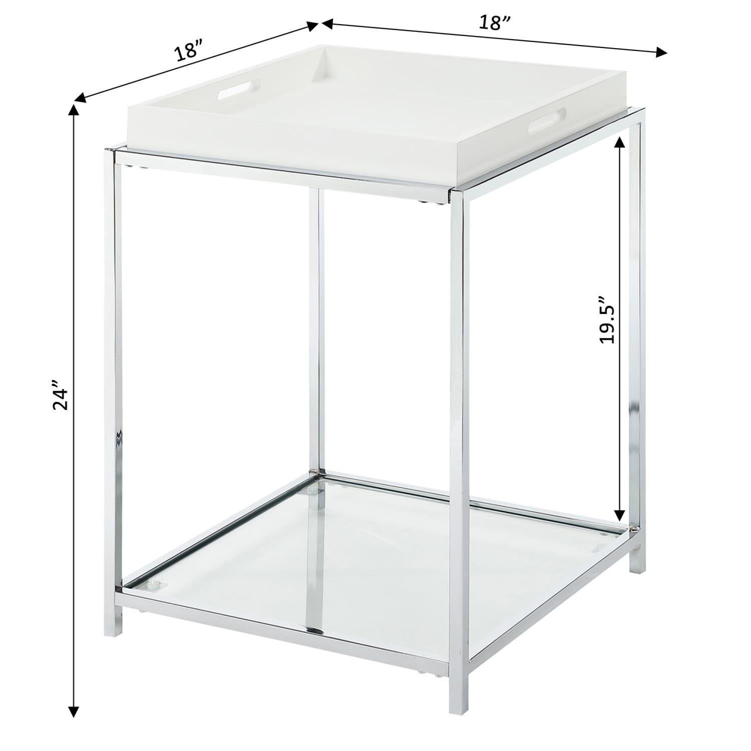 The Palm Beach collection from Convenience Concepts features urban design and multi-function use. Featuring removable/reversible wood tray that can be used as a flat surface or as serving tray. Made of chromed steel and tempered glass, this table is built to last for many years of enjoyment. The chic, modern design will make it a hit with any modern decor styling. Bring home this beautiful piece to compliment any room in the modern home. Features: Palm Beach collection Chrome plated steel frame Clear tempered glass on top and bottom shelves Will provide years of enjoyment (W) 18″ x (L) 18″ x (H) 24″ Matches almost any modern decor Specifications: Product Dimensions: (W) 18″ x (L) 18″ x (H) 24″ Product Color: Clear