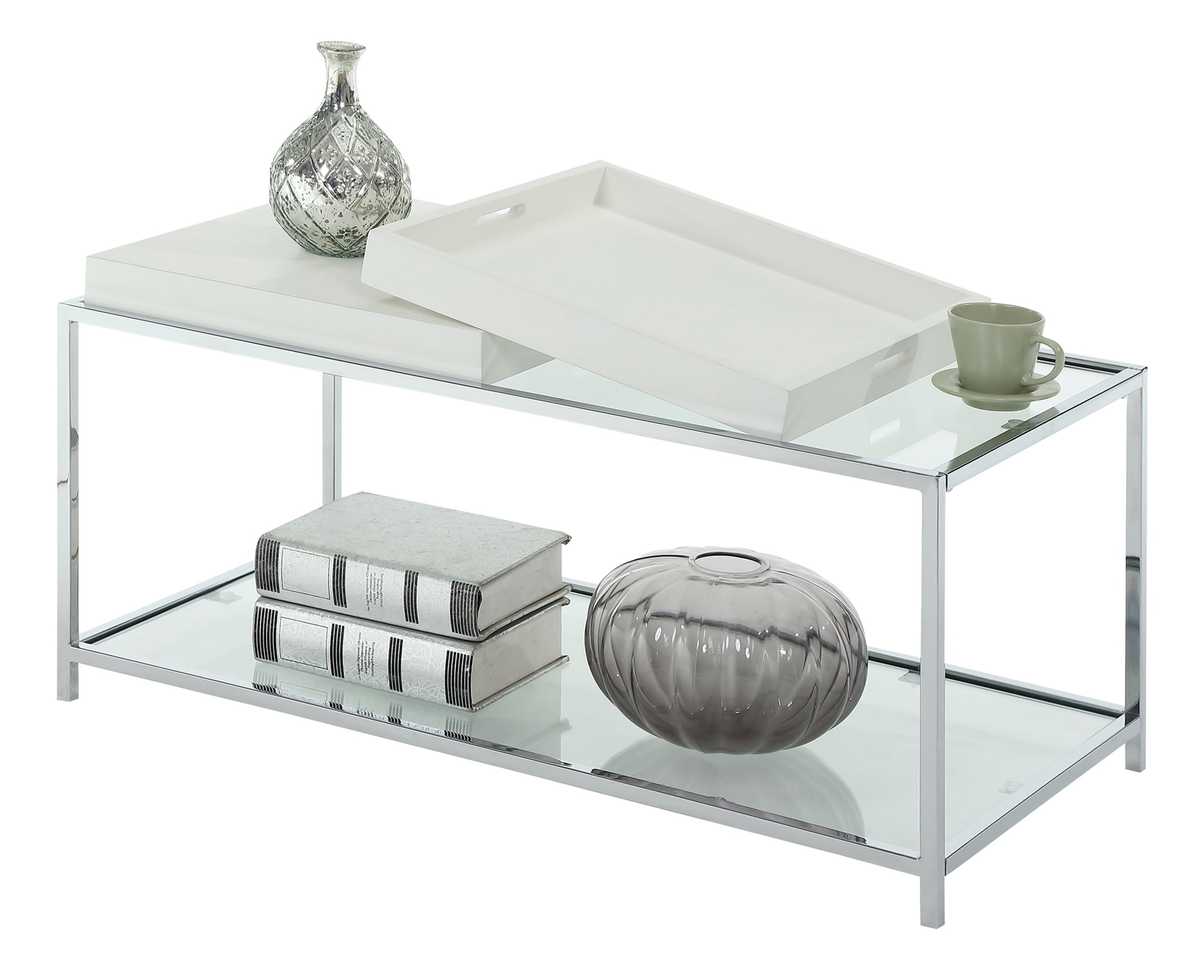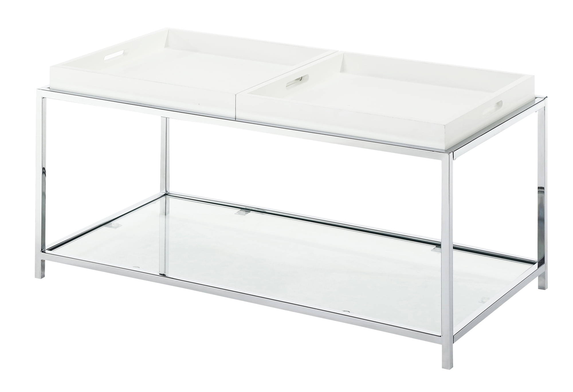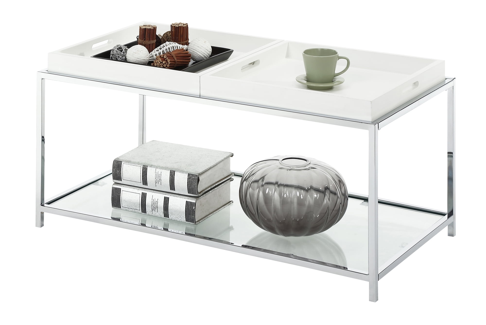 Palm Beach Coffee Table Exciting new design from Convenience Concepts. Inc. that combines urban design and multi function use. The Palm Beach Coffee Table features two removable trays that can be reversed to use as a flat surface, or as serving trays. Clear tempered glass table top allows use of coffee table with, or without trays. Specifications: The Palm Beach Coffee Table features two removable trays that can be reversed to use as a flat surface, or as serving trays Removable Reversable Tray Multi Function Use Chrome Plated Steel Frame Tempered Glass on Top and Bottom Shelves