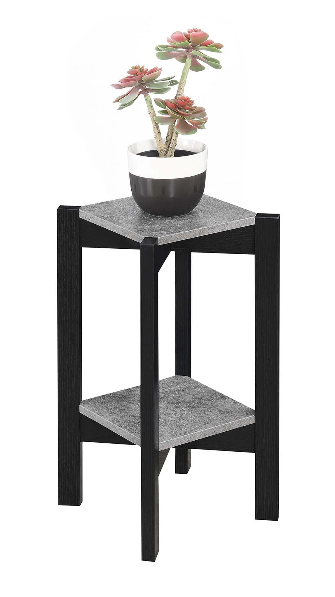 Part of the Plants and Potts Collection by Convenience Concepts Transitional and modern style Easy assembly with instructions provided Engineered from Manufactured Wood and Finished with a Beautiful Faux Cement Design 2 Tiers of Spacious Squared Shelving Use as Plant Stand; Decor Display Stand; or to Showcase Collectibles Low maintenance, easy to clean, and built for durability To maintain and protect your furniture, regularly wipe down all surfaces with a soft clean dry cloth Assembled product weight: 9 lbs. Maximum weight capacity: 10 lbs. per shelf Assembled product dimensions: (W) 9.5 in. x (D) 9.5 in. x (H) 23.5 in. Color may vary slightly due to photography lighting or monitor display