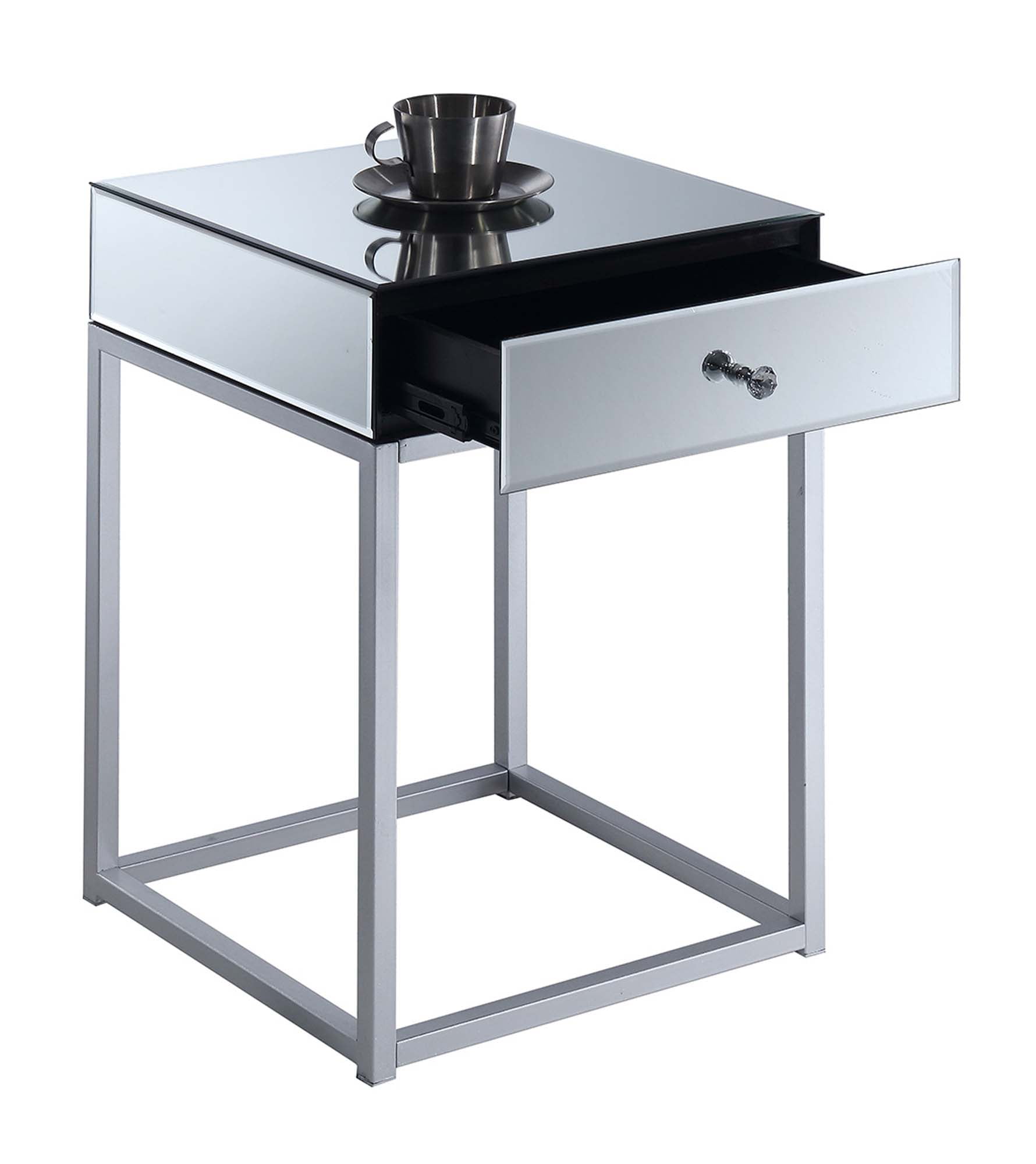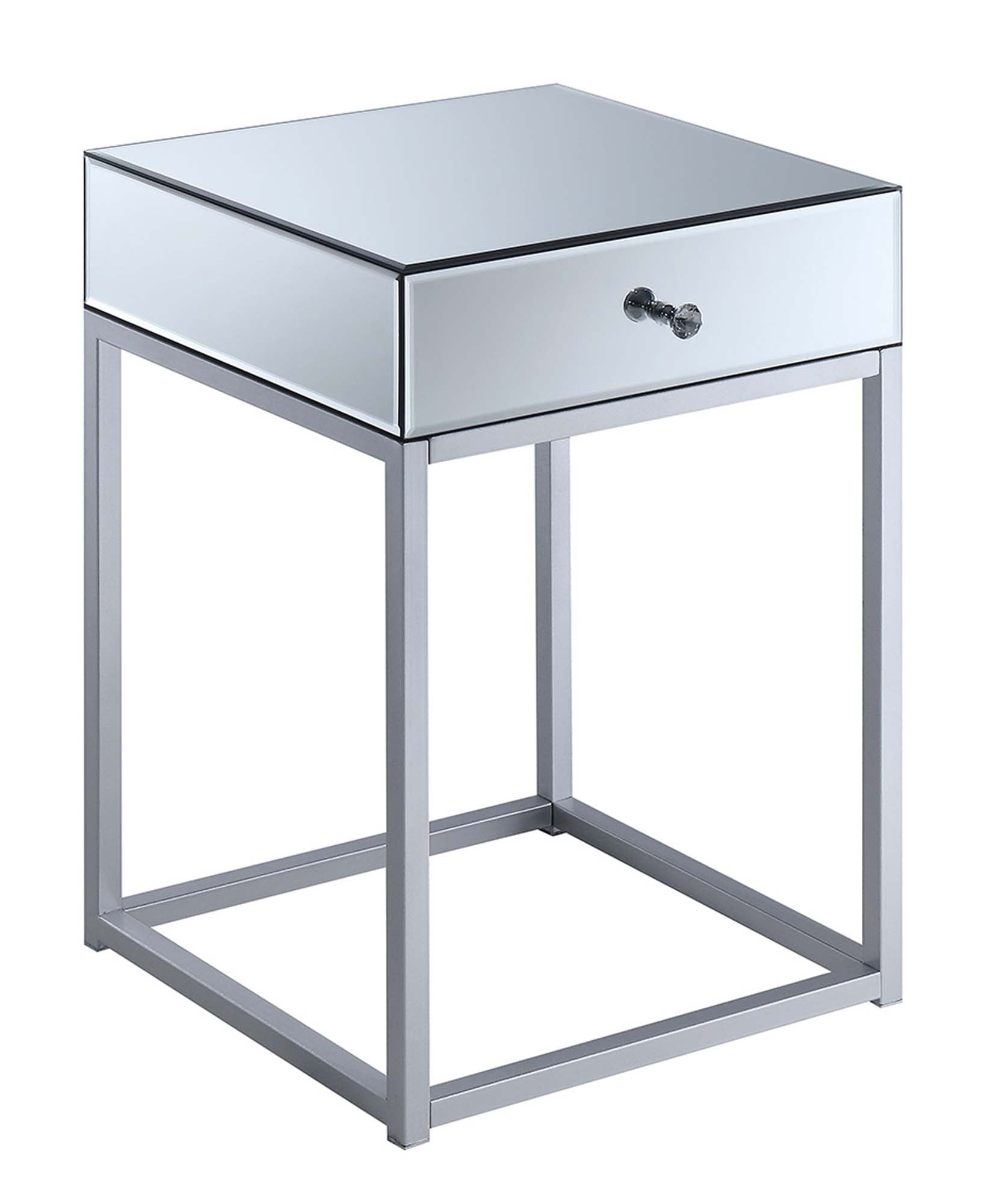 Convenience Concepts Reflections 1 Drawer End Table, Mirror/Silver Features: Part of the Reflections Collection by Convenience Concepts Upscale your home decor with this glam style unit Crafted from MDF/Mirror/Powder coated metal Set up in just 4 steps! Assembled Item Weight: 22 lbs. Assembled Item Dimensions: (L) 16 in. x (W) 16 in. x (H) 24 in.