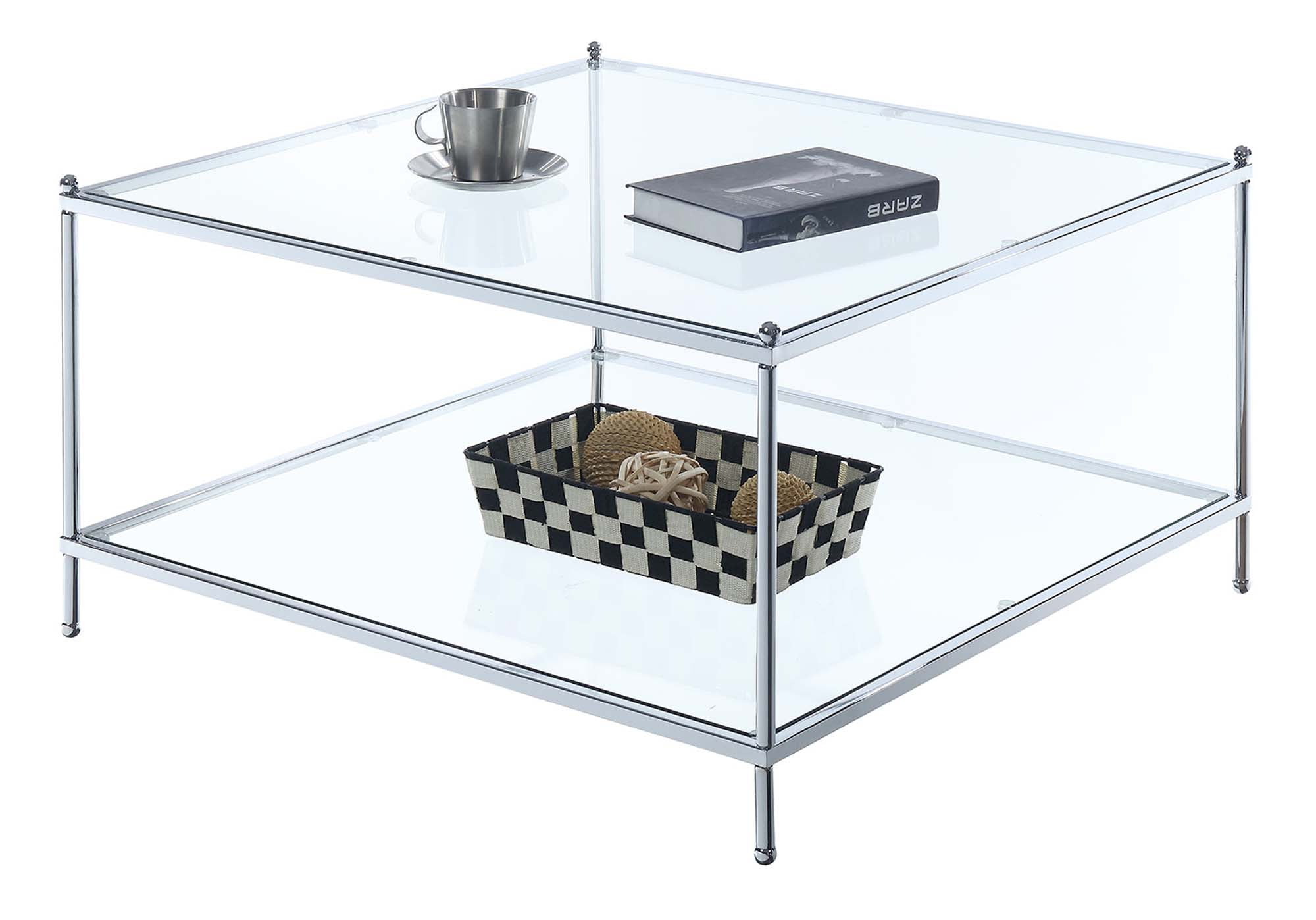 G-L-A-M-O-R-O-U-S is the only way to describe the Royal Crest Square Coffee Table from Convenience Concepts. If you are looking to spice up your living space, go no further. This beautiful contemporary coffee table is just what you were looking for! Featuring a tubular chrome metal frame, the Royal Crest Table oozes sophistication, while offering the durability you need for everyday life. The tempered clear glass is strong enough to hold your favorite centerpiece, magazines and other necessities, while lightening up the room with its open concept style, so light and airy as if your objects were floating in midair. The bottom shelf provides additional space, so you can utilize your space comfortably and efficiently. This Royal Crest Square Coffee Table is fit for royalty and can easily be set up in just 5 steps. Look for other Royal Crest items from Convenience Concepts. Each sold separately.