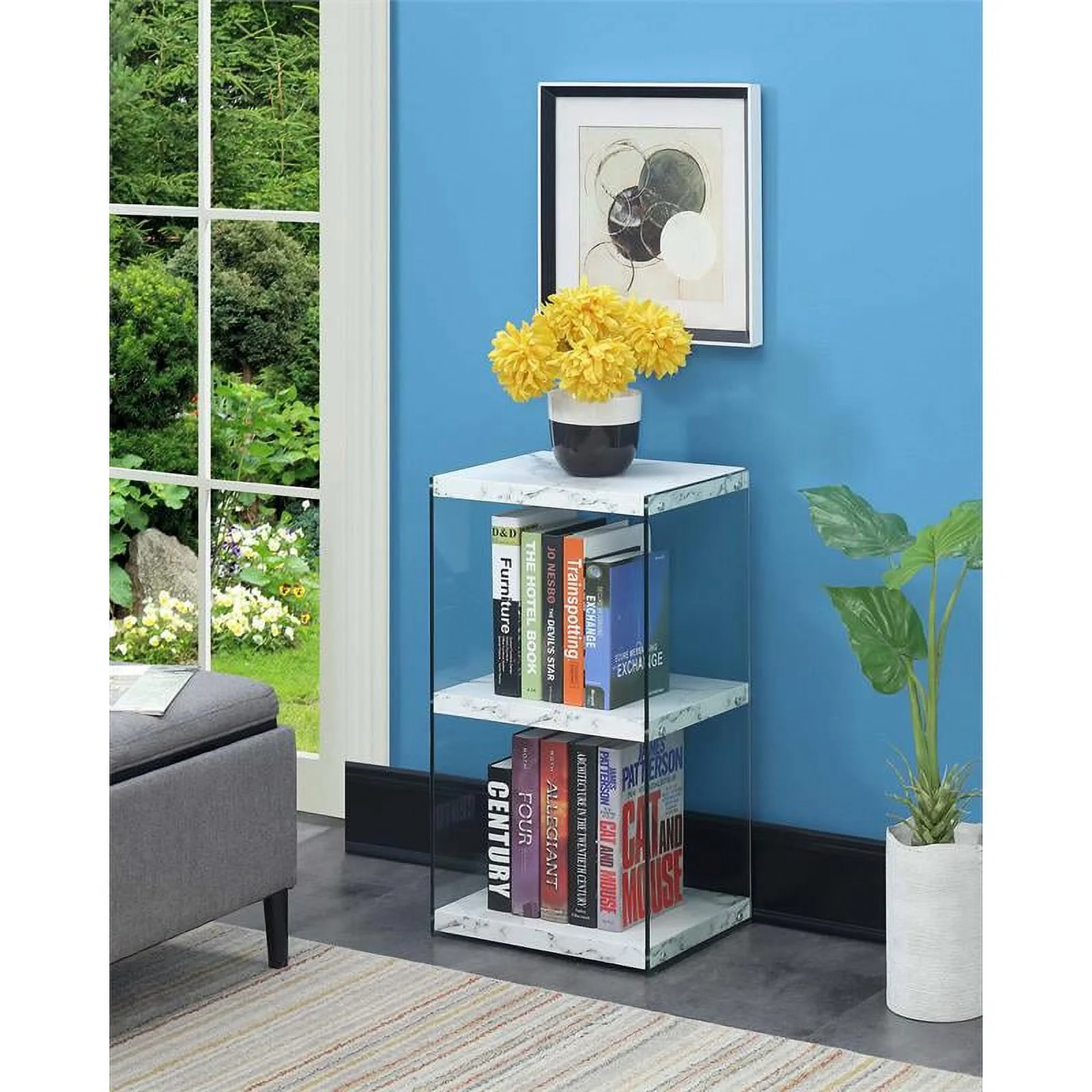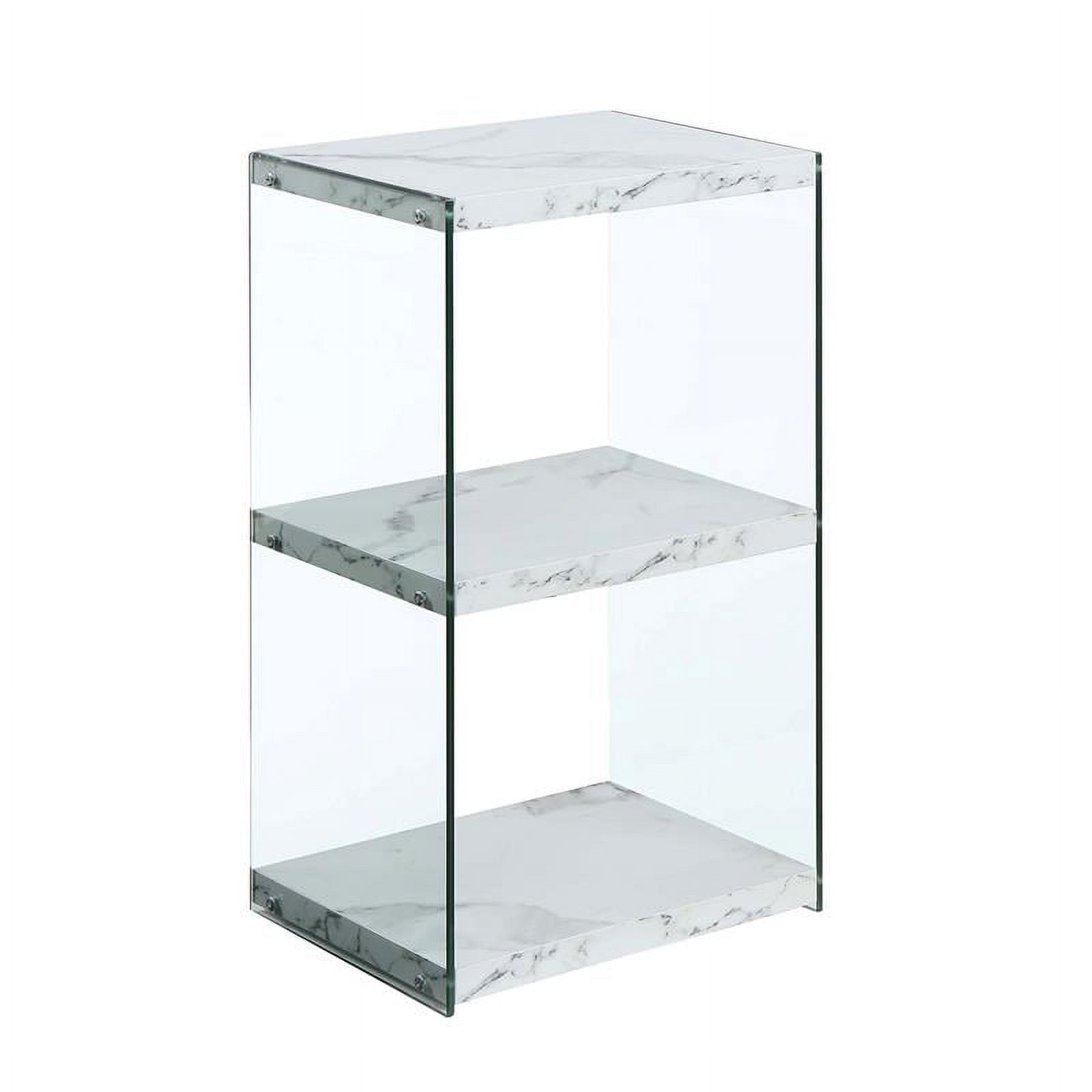 Introduce a sparkling addition to your ensemble with the SoHo 3 Tier Tower Bookcase by Convenience Concepts. Its tempered clear glass side panels create the magical illusion that the shelves are floating, giving your favorite books a unique display space. This bookshelf displays a modern contemporary style that is sure to refresh your home décor. With a limitless versatility, this multifunctional storage unit is ideal for your living room, entryway or home study. The shelves are crafted from honeycomb particle board and finished in a rich melamine paper, making it long lasting and easy maintenance. Display your books right after delivery with its simple 1-step assembly. Enjoy its three shelves, perfect for your storage or display needs. Available in multiple finishes. Pair with additional furniture pieces from the SoHo Collection by Convenience Concepts. Each sold separately.