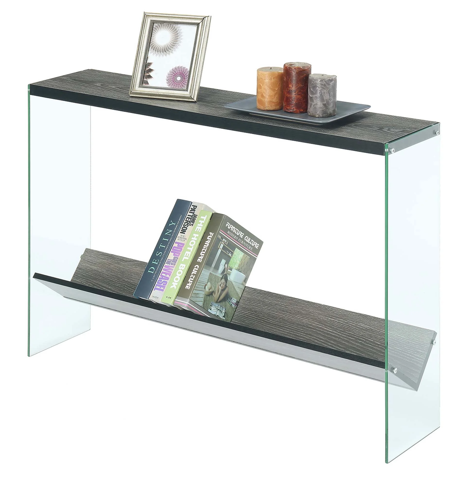 Convenience Concepts SoHo Glass V Console Table with Shelf, Weathered Gray/Glass Features: Part of the SoHo Collection by Convenience Concepts Slanted Bottom Shelf for Easy Storage Crafted from Tempered Glass & Honeycomb Particleboard Modern and contemporary style Brings style and functionality to your home Chic side tempered glass panels give the shelves a floating appearance. Low maintenance, easy to clean, and built for durability Easy assembly with instructions provided Assembled Item weight: 28lbs. Assembled Item dimensions: (L) 42 in. x (W) 9.25 in. x (H) 30 in.