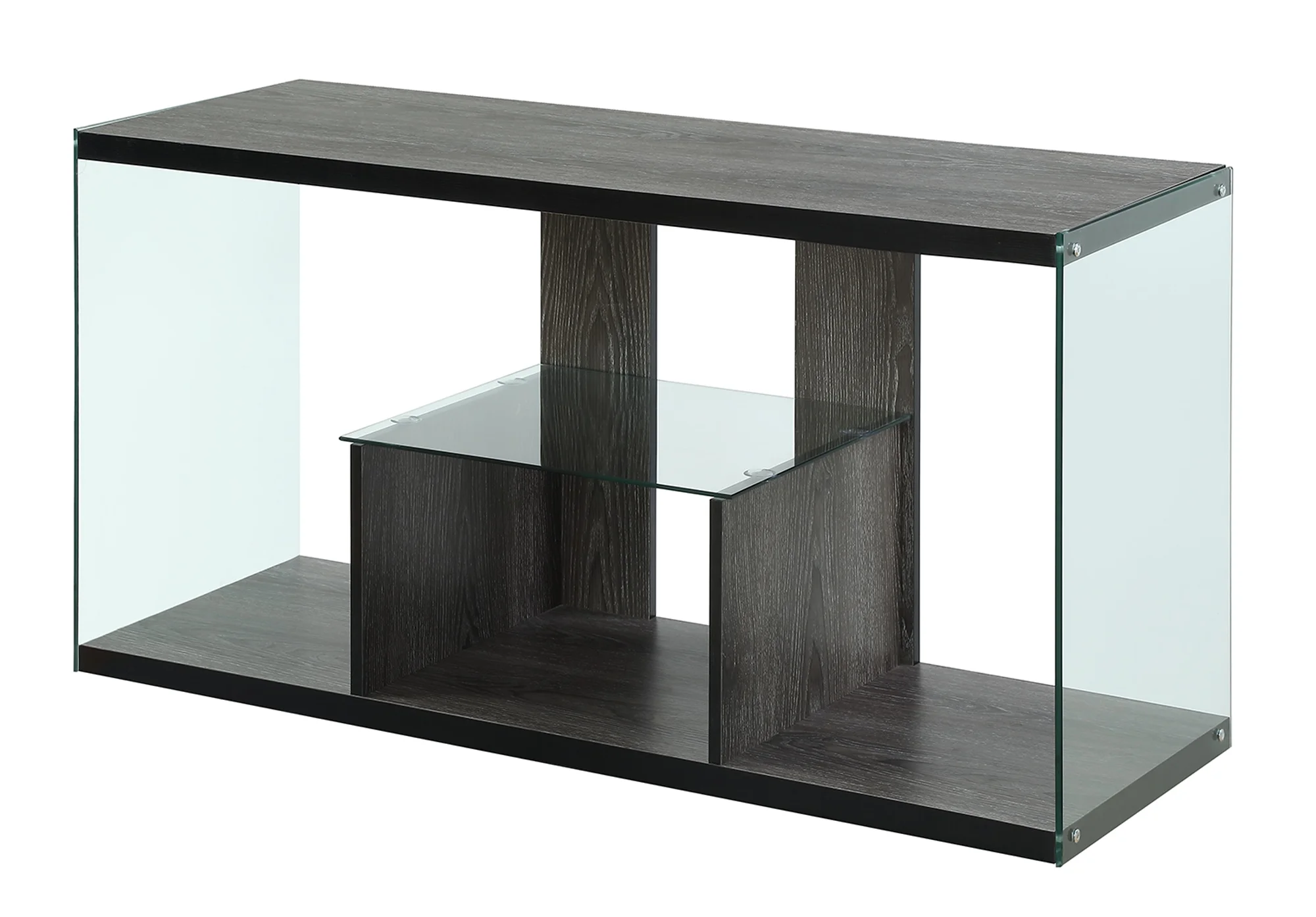 Beautiful weathered gray wood finish Accommodates TVs up to 50 inches Tempered Glass Highlights SoHo Collection Clean Modern Look 23.75″ H x 15.75″ D x 48″ W