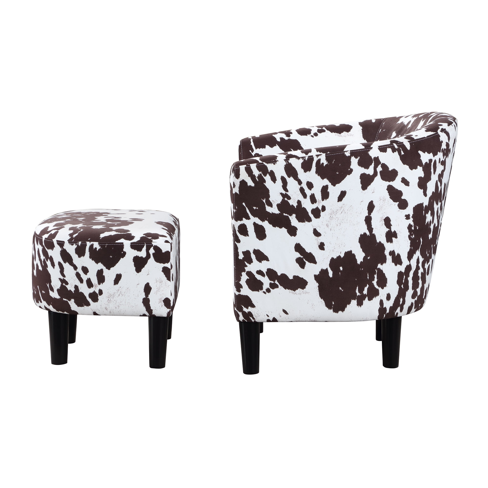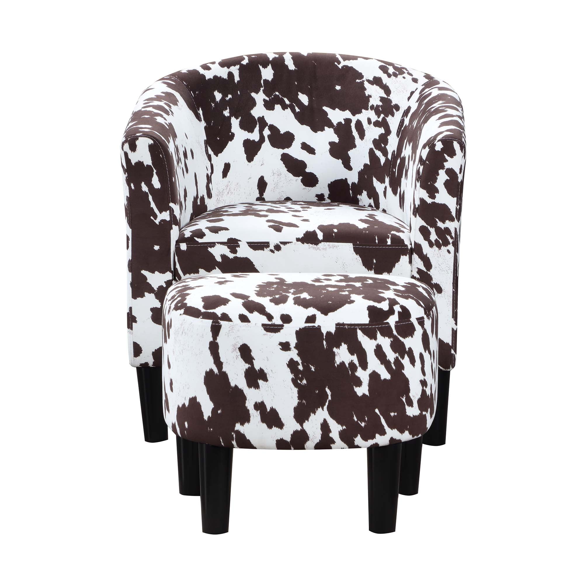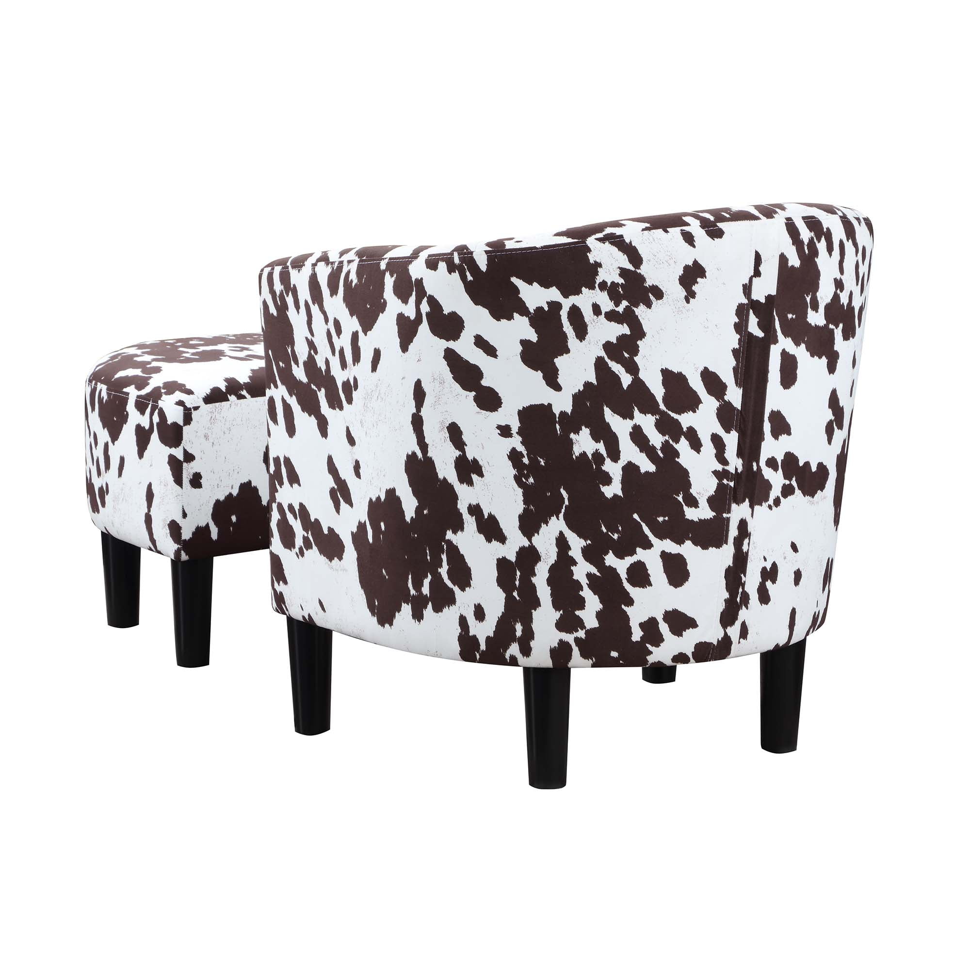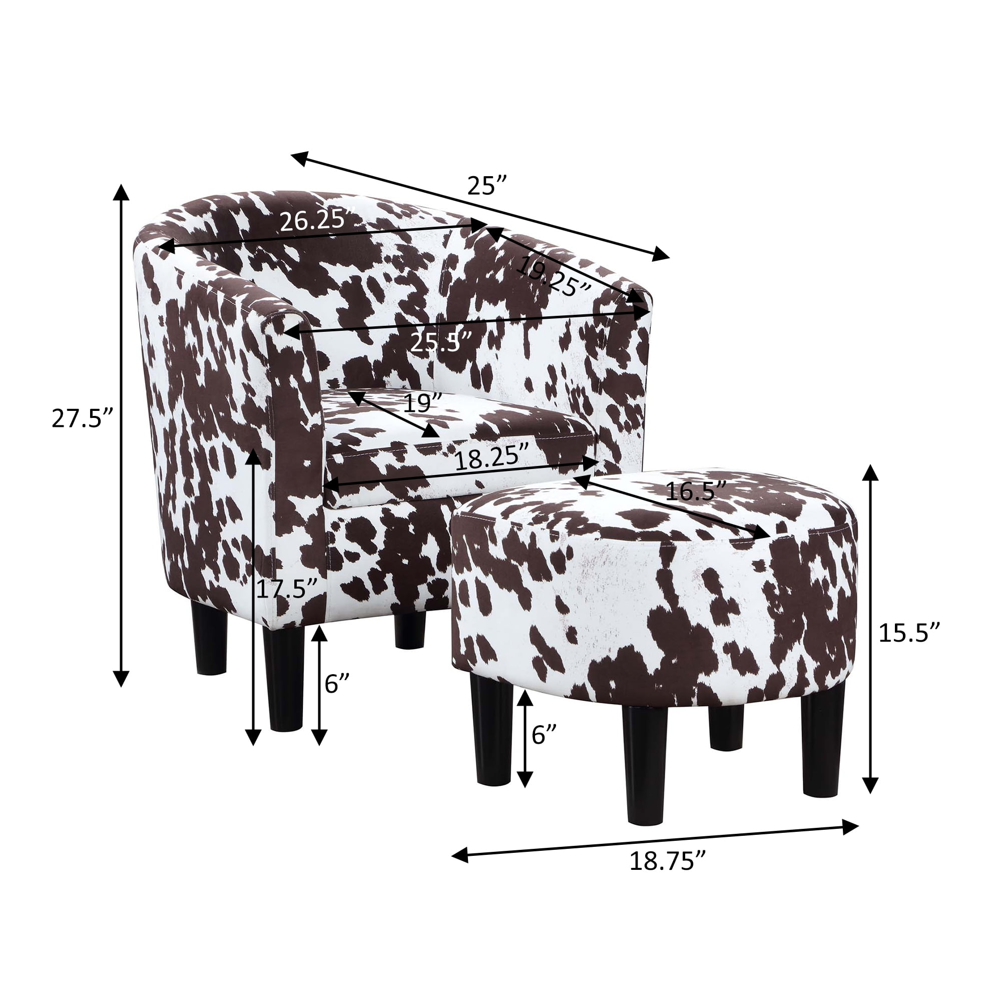 Part of the Take a Seat Collection by Convenience Concepts Contemporary style Sturdy wood frame supported by solid wood legs Assembled ottoman weight: 8 lbs. Assembled chair weight: 20 lbs. To maintain and protect your furniture, regularly wipe down all surfaces with a soft clean dry cloth Easy assembly requiring only one step! Maximum chair weight capacity: 250 lbs. Maximum ottoman weight capacity: 150 lbs. Classic Barrel Accent Chair & U-Shaped Ottoman Upholstered in Soft Faux Cowhide Fabric High-density padded foam cushions and fine detailed stitching Chair: (L) 26.25 in. x (W) 25 in. x (H) 27.5 in.; Ottoman: (L) 18.75 in. x (W) 16.5 in. x (H) 16 in. Color may vary slightly due to photography lighting or monitors display