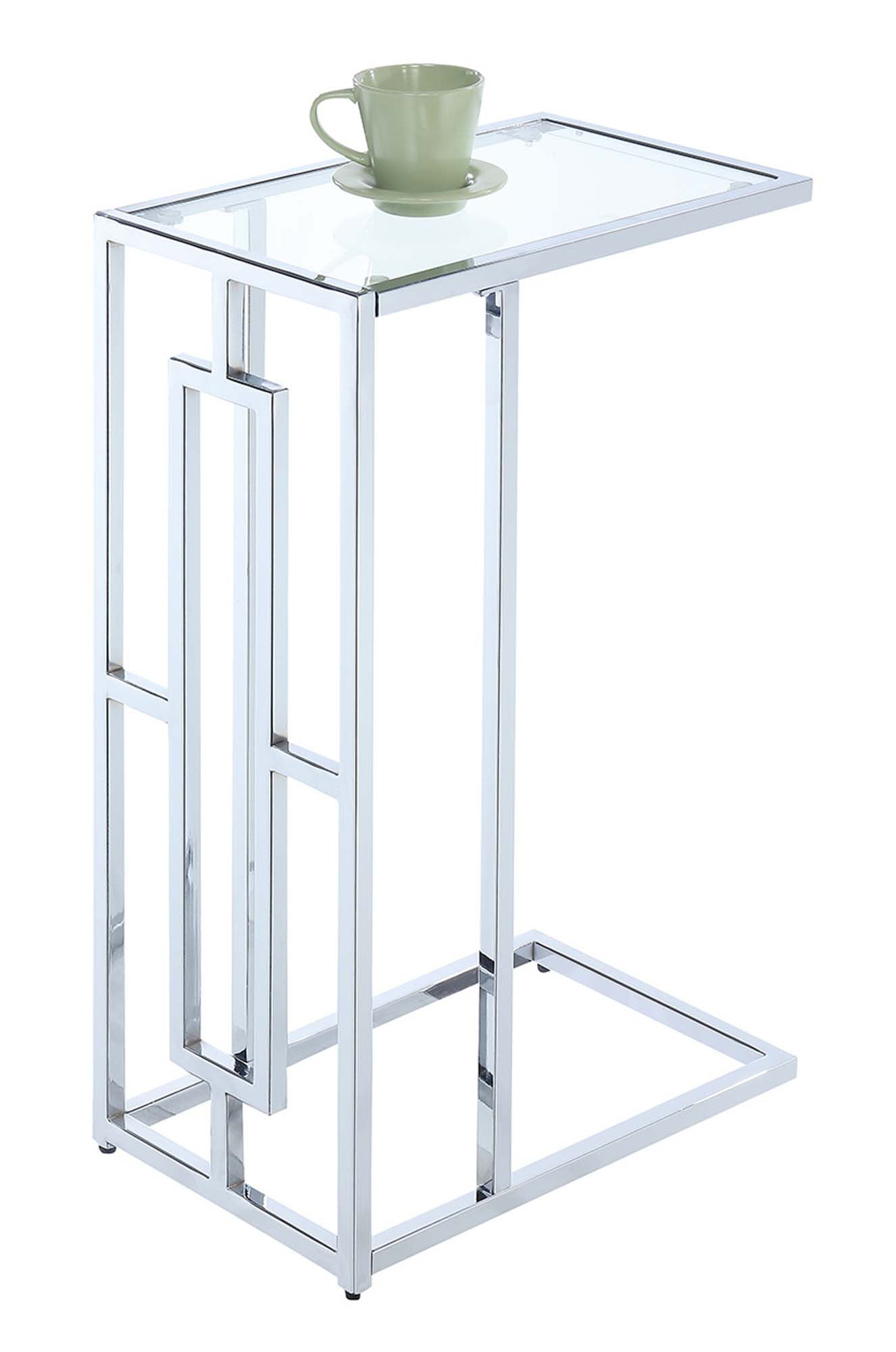 Innovative and chic, the Town Square Chrome C End Table is a must-have piece for your home. This accent furniture provides a design that is just as functional as it is durable. Its C shape allows you to use it as a standard end or chairside table, then slide it under the couch to accommodate anything from snacks and refreshments to a laptop without the hassle! It provides a beautiful contrast between a tempered clear glass insert and chromed metal. The signature geometric frame gives this item a touch of elegance. Witness its versatility as you use in your living room, den or home study. Enjoy right after delivery with its simple 4-step assembly! Complete the look with additional furniture items from the Town Square Collection by Convenience Concepts. Each sold separately.