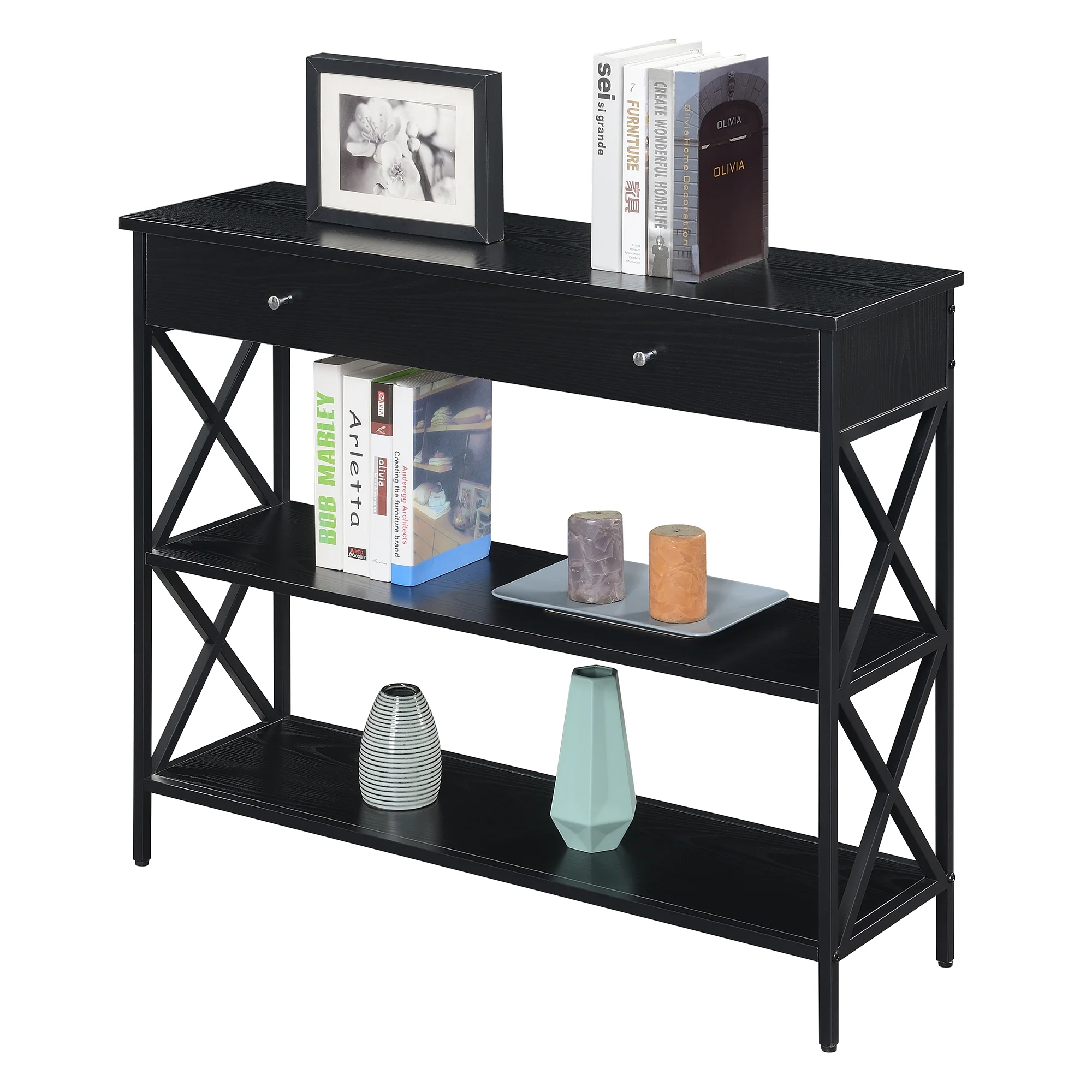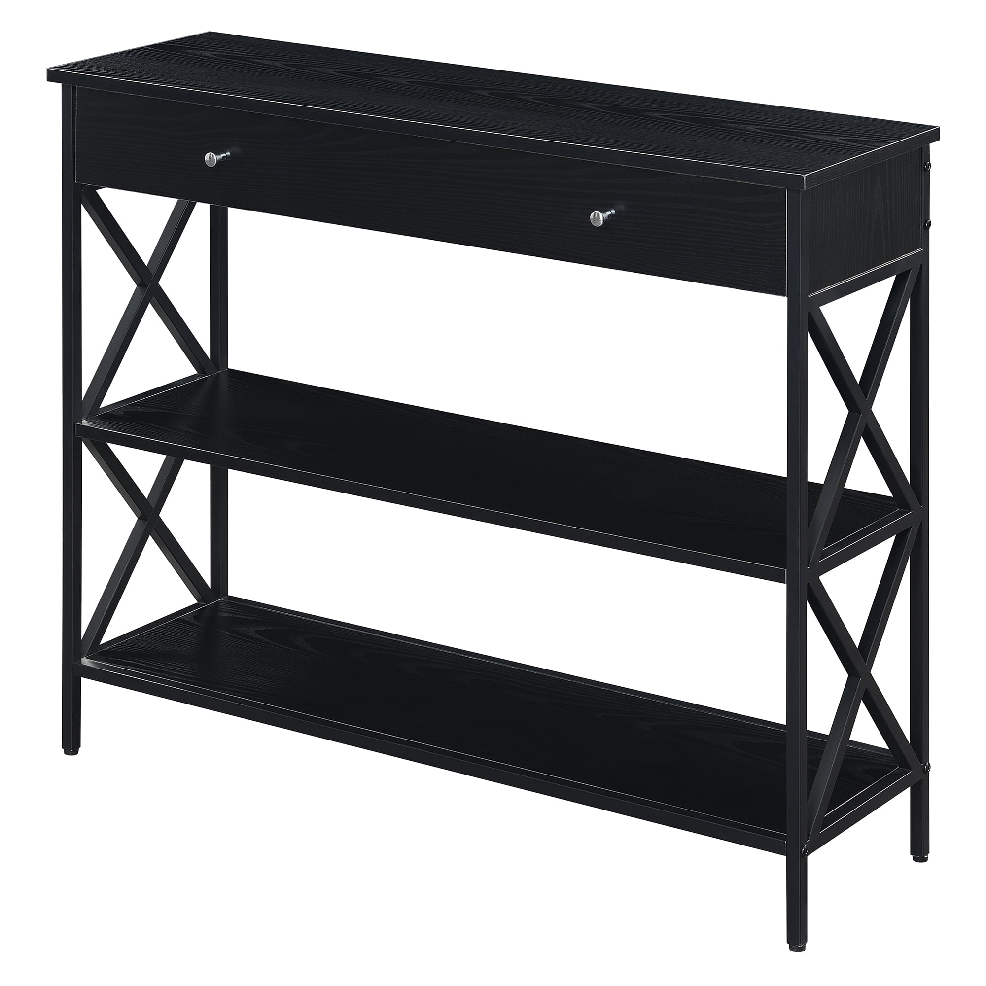Upgrade your living space with the modern touch of the Tucson One-Drawer Console Table by Convenience Concepts. Featuring a pull-out drawer perfect to stow away keys, entertainment essentials, and more. This table also includes generous top surface space, a middle shelf, and a bottom shelf. Ample space provides additional display area for decor, collectibles, and even books. The black crisscross frame is sure to make a statement in any room in your home. Available in a variety of finishes, this table is crafted from particle board and powder coated metal for long term use. Shop coordinating pieces from the Tucson Collection by Convenience Concepts, each sold separately. Features: Part of the Tucson Collection Available in Multiple Finishes One Drawer for Concealed Storage Bottom Shelf for Additional Storage (L) 39.5 in. x (W) 12 in. x (H) 31.5 in. Beautiful black wood finish with black metal frame Specifications: Product Dimensions: (L) 39.5 in. x (W) 12 in. x (H) 31.5 in. Product Weight: 42