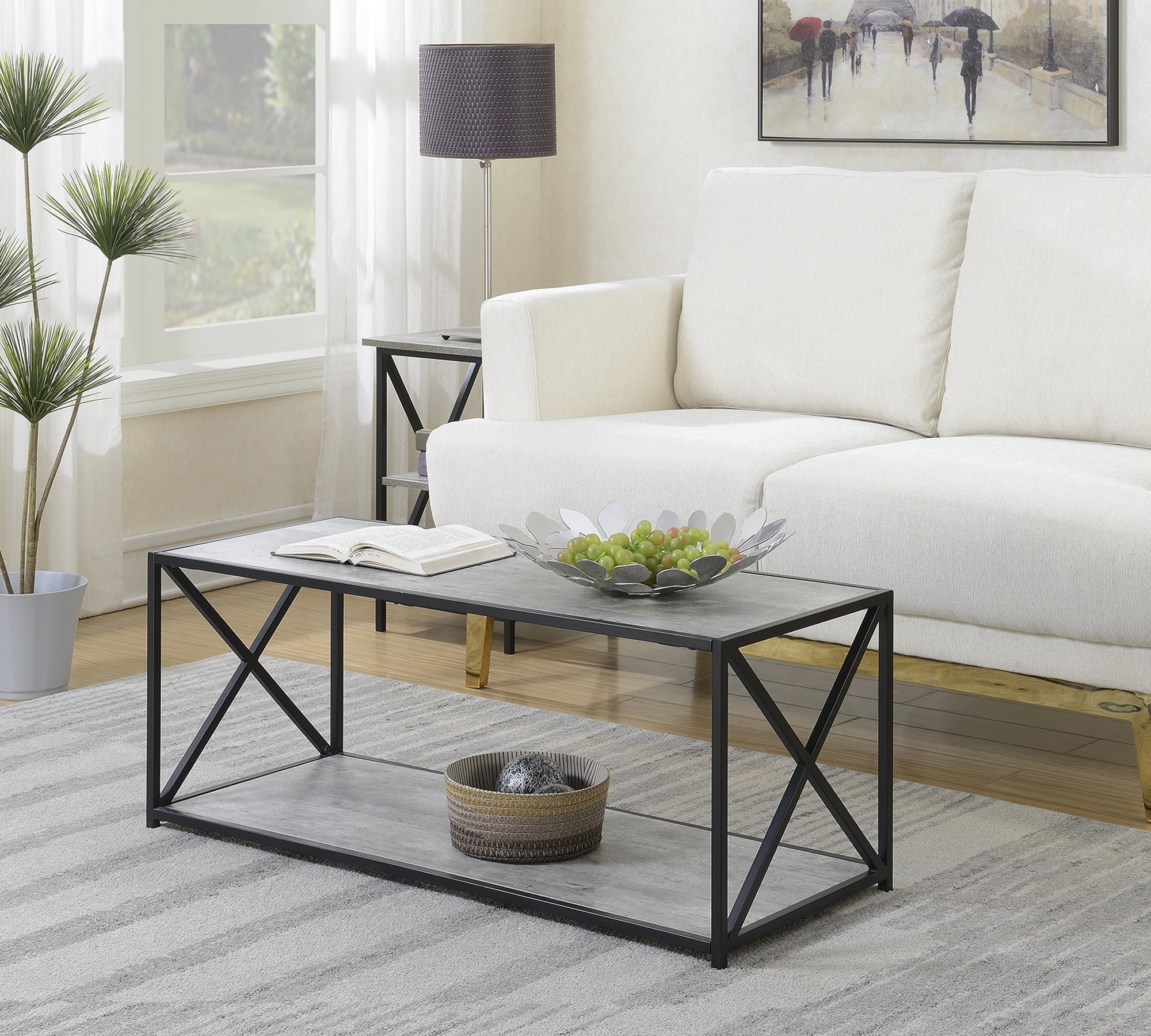 The Tucson Coffee Table with Shelf by Convenience Concepts will make a great addition to any modern home. Available in multiple finishes, this table is sure to complement any home decor. Featuring a spacious top and bottom shelf, providing easy access to plenty of space to display collectibles and everyday necessities. Engineered for a long-time use, this beautiful contemporary piece is built from particleboard, sturdy powder-coated metal, and melamine veneer. This table is sure to make a statement no matter where it is displayed in your home! Coordinate your favorite room with additional pieces from the Tucson collection by Convenience Concepts, each sold separately. Features: Part of the Tucson Collection Available in Multiple Finishes Two Tiers of Spacious Shelving Built from Particleboard, Powder-Coated Metal, and Melamine 17″ H x 42″ W x 17″ D Beautiful weathered gray wood finish and black metal powder-coated “X” frame Specifications: Product Dimensions: 17″ H x 42″ W x 17″ D Product Weight: 29 lbs