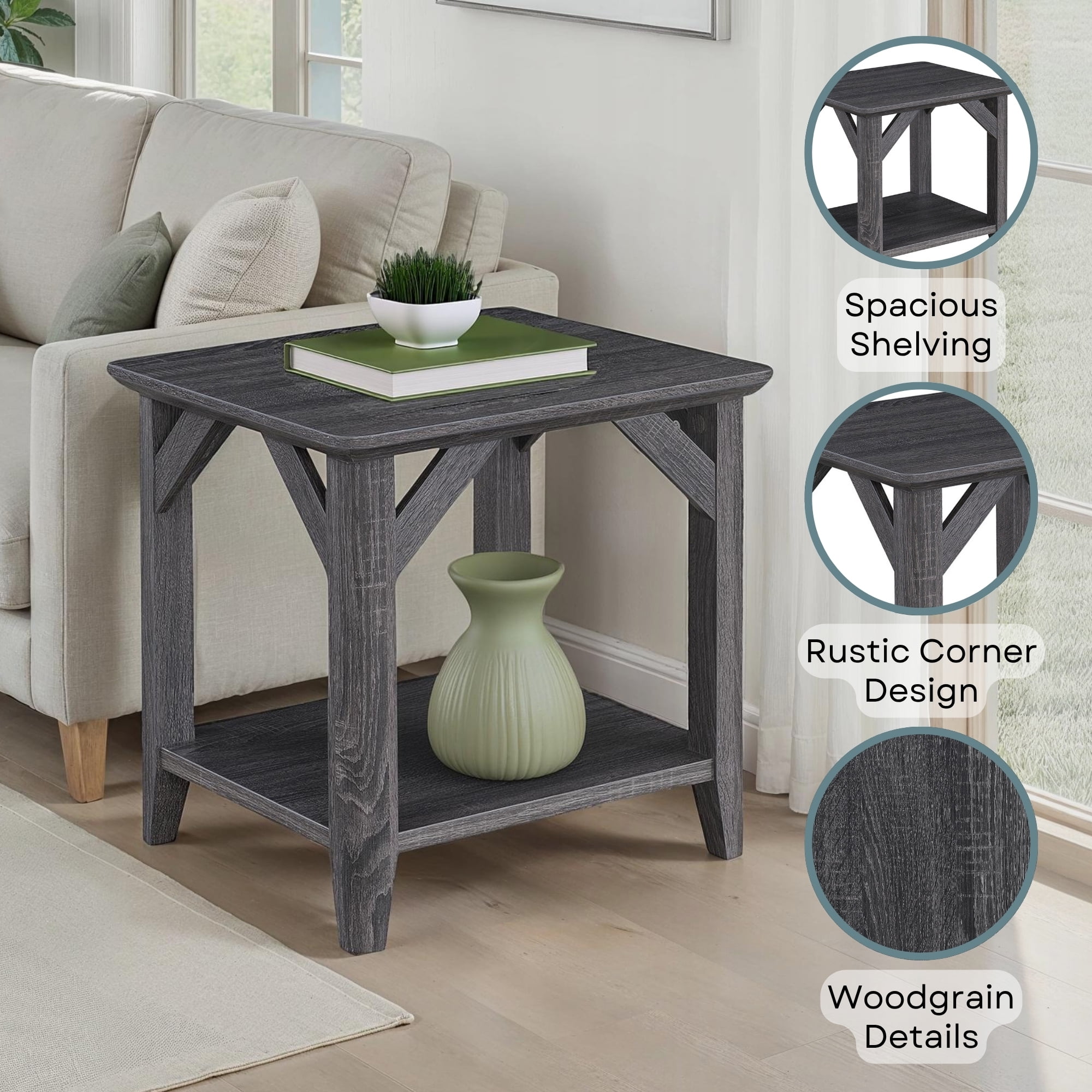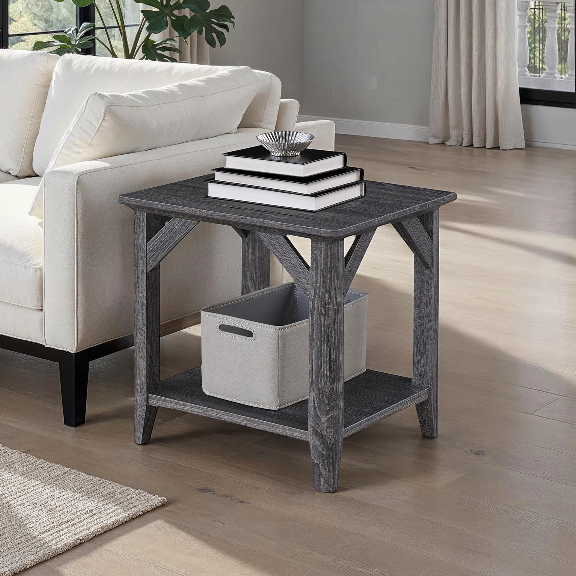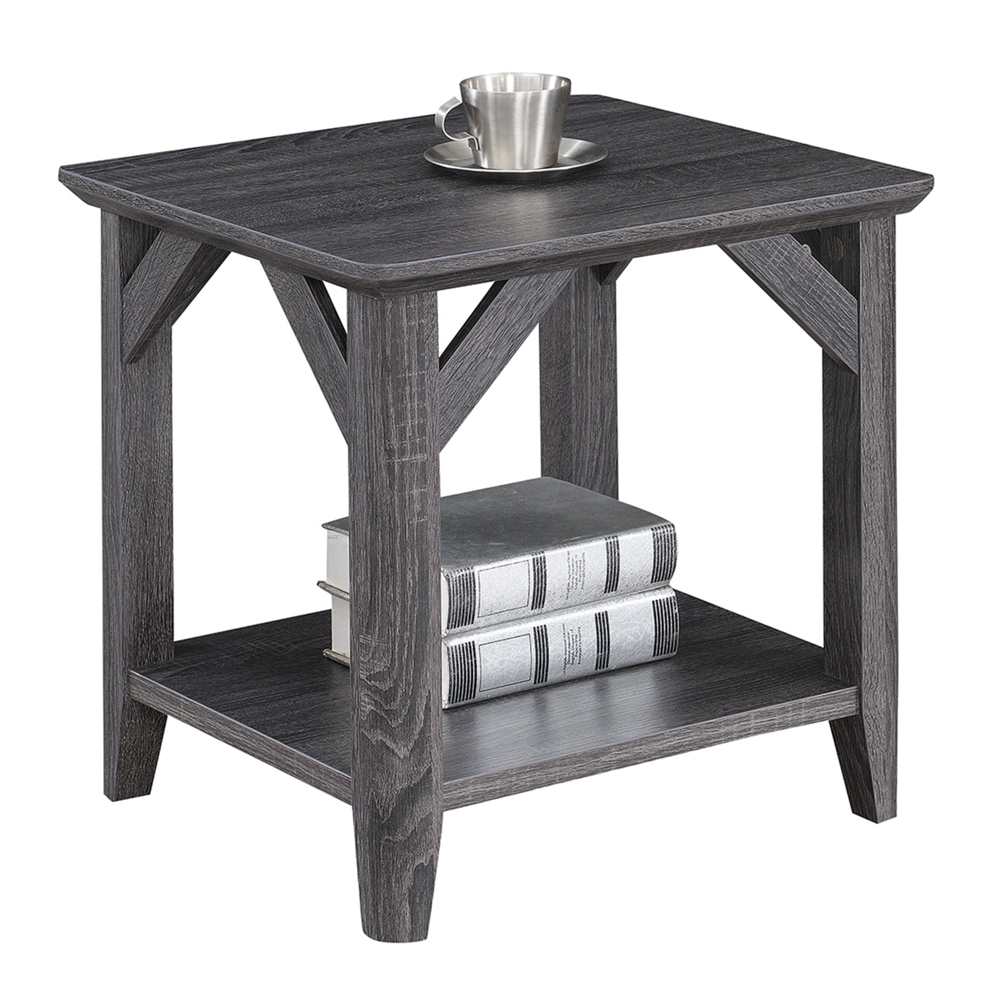Winston End Table Get reacquainted with nature with the Winston End Table by Convenience Concepts. Its rustic style and wooden finish will bring the outdoor feel to your living room decor. Constructed of particle board and MDF and finished with a rich melamine, this two tier unit was crafted with longevity and easy maintenance in mind. Its top and bottom shelf are ample enough to optimize both your storage and display space. You will have plenty of room for a lamp, your favorite coffee mug and decorative collectibles. Its tapered legs give this piece a unique style while making it sturdy. Ideal for your living room, den or home study as it is available in multiple finishes. Comes with feet tacks to prevent any scratches on your floors. Bring home today and enjoy it in as little as 6 simple steps! Complete the look with additional items from the Winston Collection by Convenience Concepts. Each sold separately. Specifications: Its rustic style and wooden finish will bring the outdoor feel to your living room decor Part of the Winston Collection by Convenience Concepts Showcases a rustic style to refresh your home decor Made of particle board/MDF/melamine to beat the test of time Offers a simple 6-step assembly!