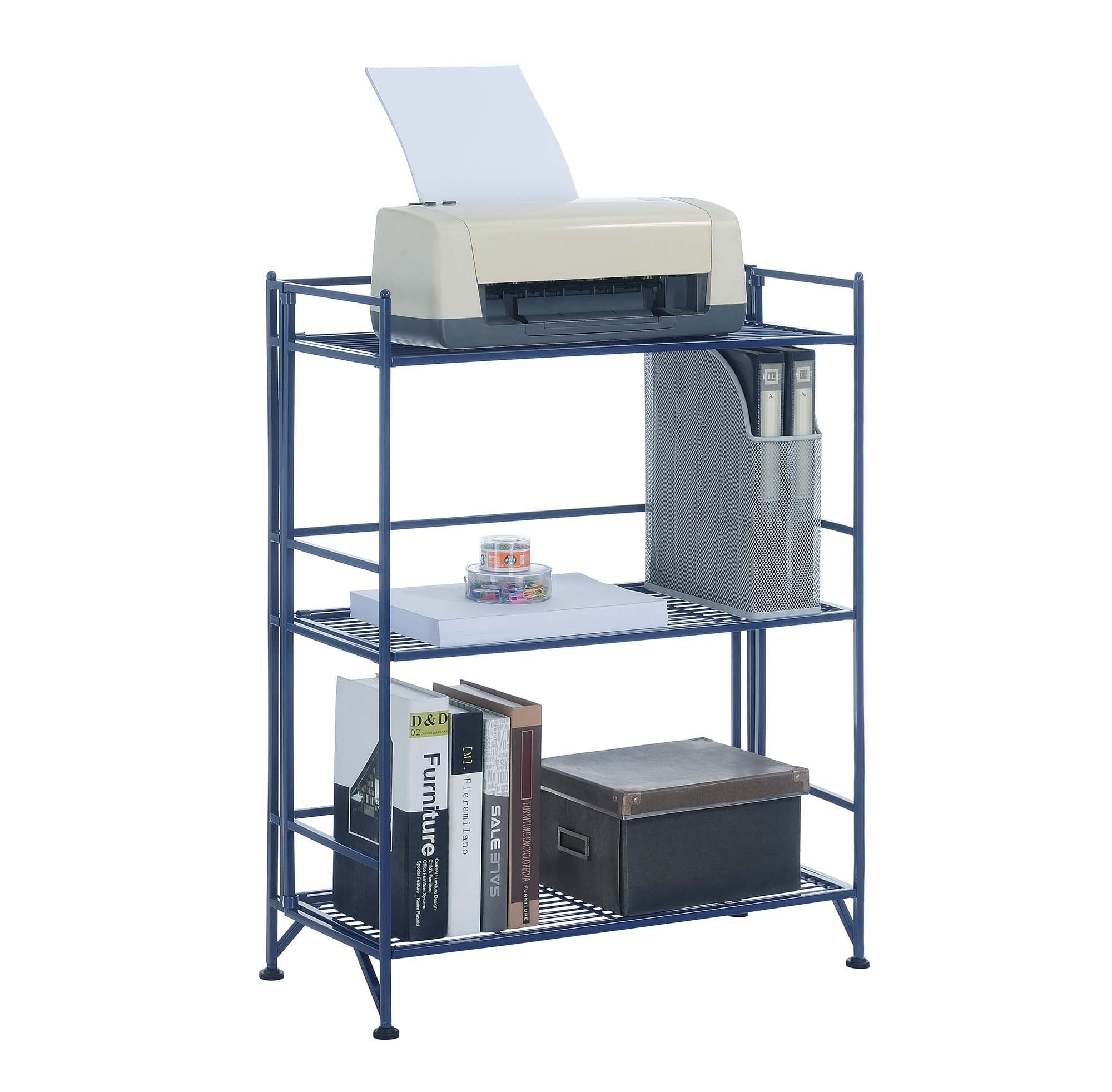 Convenience Concepts Xtra Storage 3 Tier Wide Folding Metal Shelf, Cobalt Blue Features: Part of the Xtra Storage Collection by Convenience Concepts Easy to Fold, Move, & Store When Not in Use 3 Tiers of Wide Shelving Designed to Store Household Goods, Office Supplies, & More Adjustable Leveling Feet Compensate for Uneven Floors Sturdy Power-Coated Metal Frame Easy Assembly with No Tools Required Powder Coated Metal To Maintain and Protect your Furniture, Regularly Wipe Down All Surfaces with a Soft Clean Dry Cloth Low Maintenance, Easy to Clean, & Built for Durability Maximum Weight Capacity per Shelf: 25 lbs. each Assembled Item Weight: 11 lbs. Assembled Item Dimensions: (L) 25.25 in. x (W) 11.25 in. x (H) 32.5 in. Color May Vary Slightly Due to Photography Lighting or Monitors Display