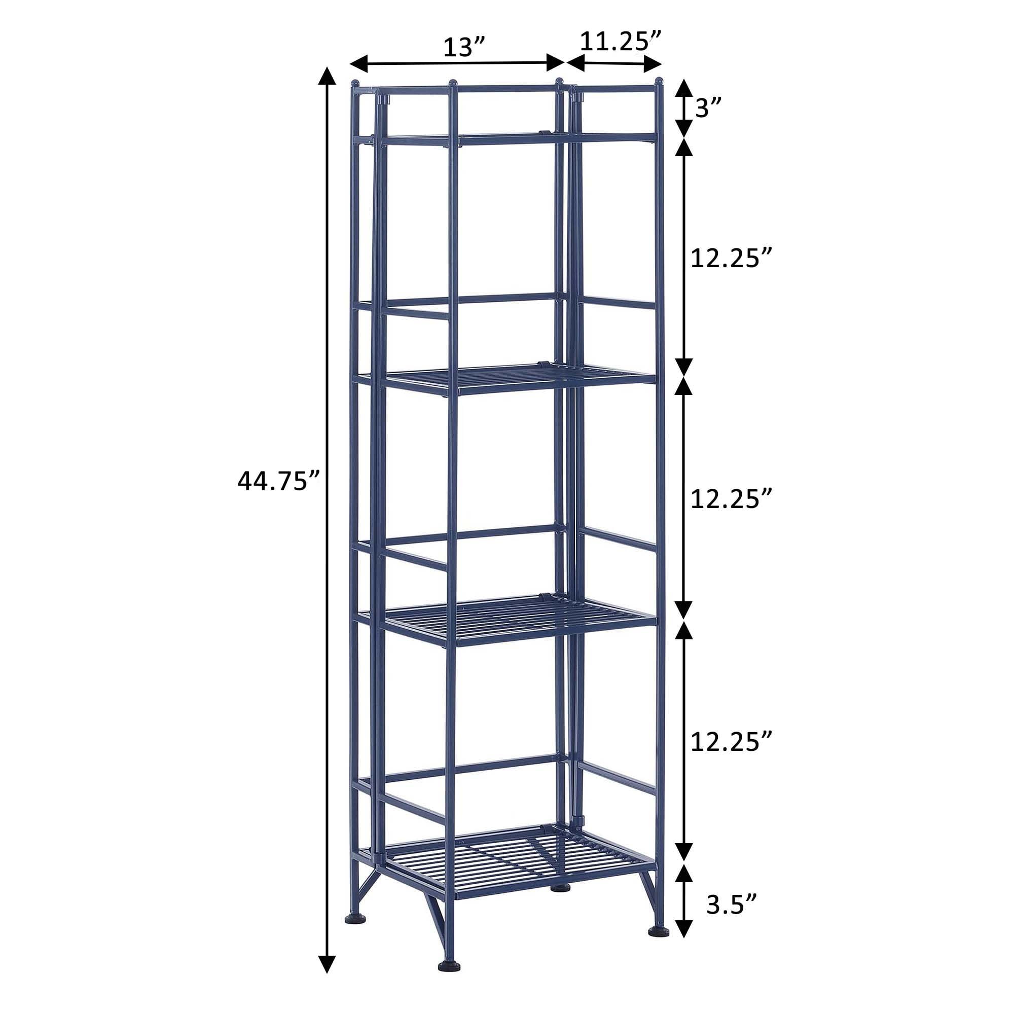 Convenience Concepts Xtra Storage 4 Tier Folding Metal Shelf, Cobalt Blue Features: Part of the Xtra Storage Collection by Convenience Concepts Easy to Fold, Move, & Store When Not in Use 4 Tiers of Shelving Designed to Store Household Goods, Office Supplies, & More Adjustable Leveling Feet Compensate for Uneven Floors Sturdy Power-Coated Metal Frame Easy Assembly with No Tools Required Powder Coated Metal To Maintain and Protect your Furniture, Regularly Wipe Down All Surfaces with a Soft Clean Dry Cloth Low Maintenance, Easy to Clean, & Built for Durability Maximum Weight Capacity per Shelf: 15 lbs. each Assembled Item Weight: 11 lbs. Assembled Item Dimensions: (L) 13 in. x (W) 11.25 in. x (H) 44.75 in. Color May Vary Slightly Due to Photography Lighting or Monitors Display