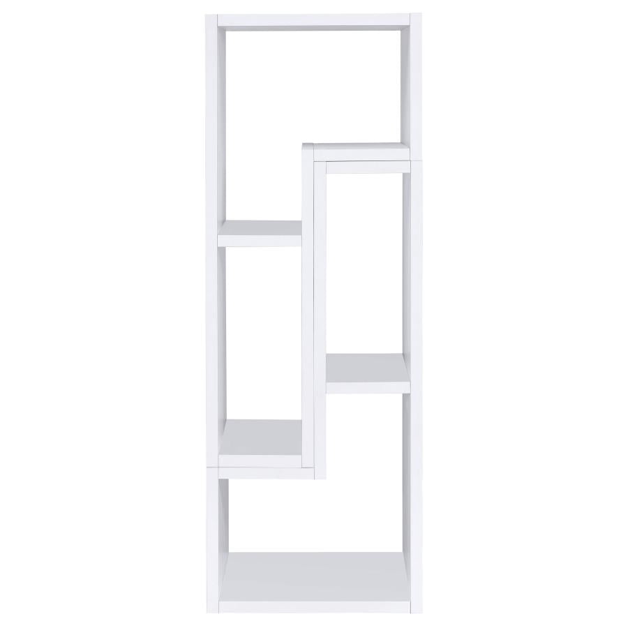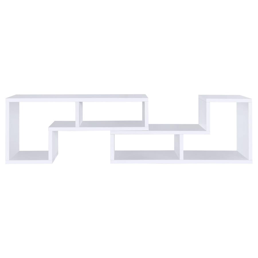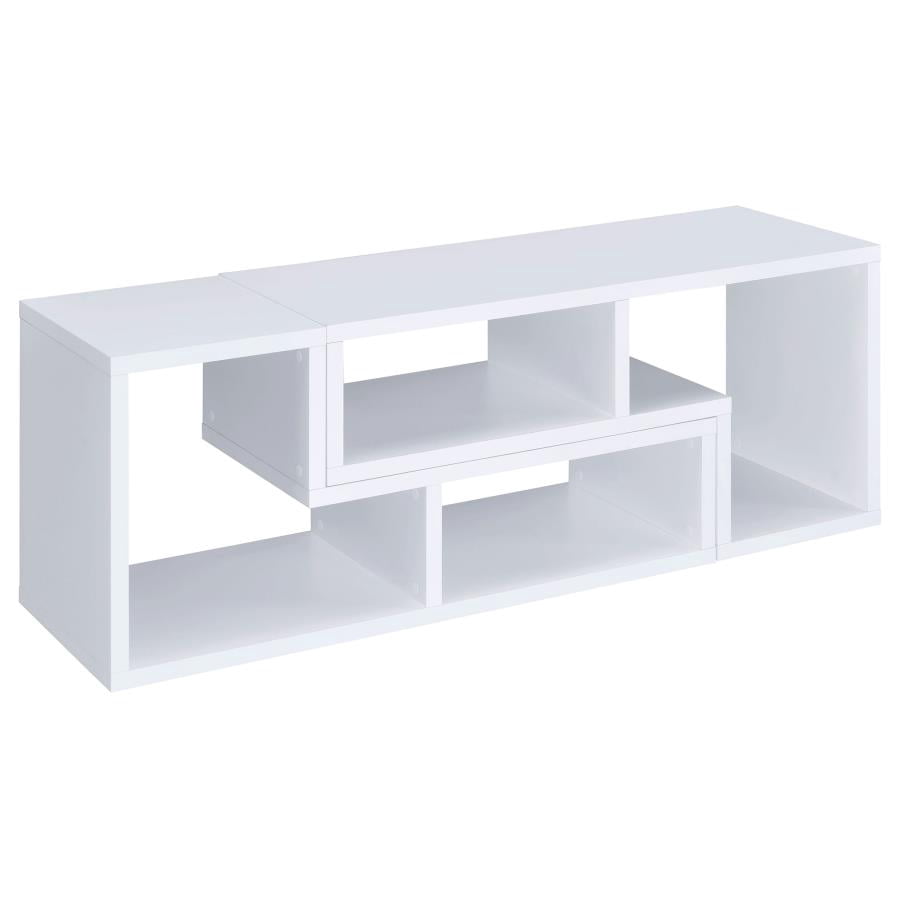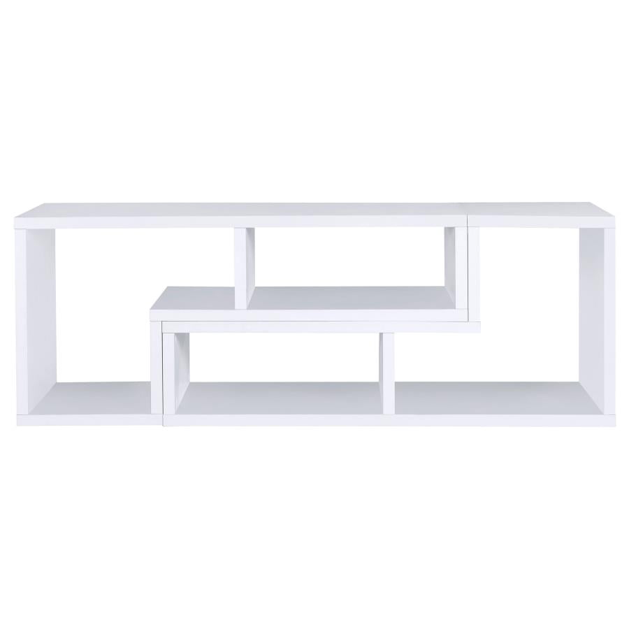 Perfect for a variety of uses, this two-piece bookcase and TV console is fabulously versatile. It allows you to switch between various bookcase and TV stand configurations for your convenience. Bold, L-shaped shelves are arranged in striking geometric designs for a modern look. A while finish enhances its contemporary appeal. Crafted from top quality materials, this bookcase is sturdy, stylish, and smart.