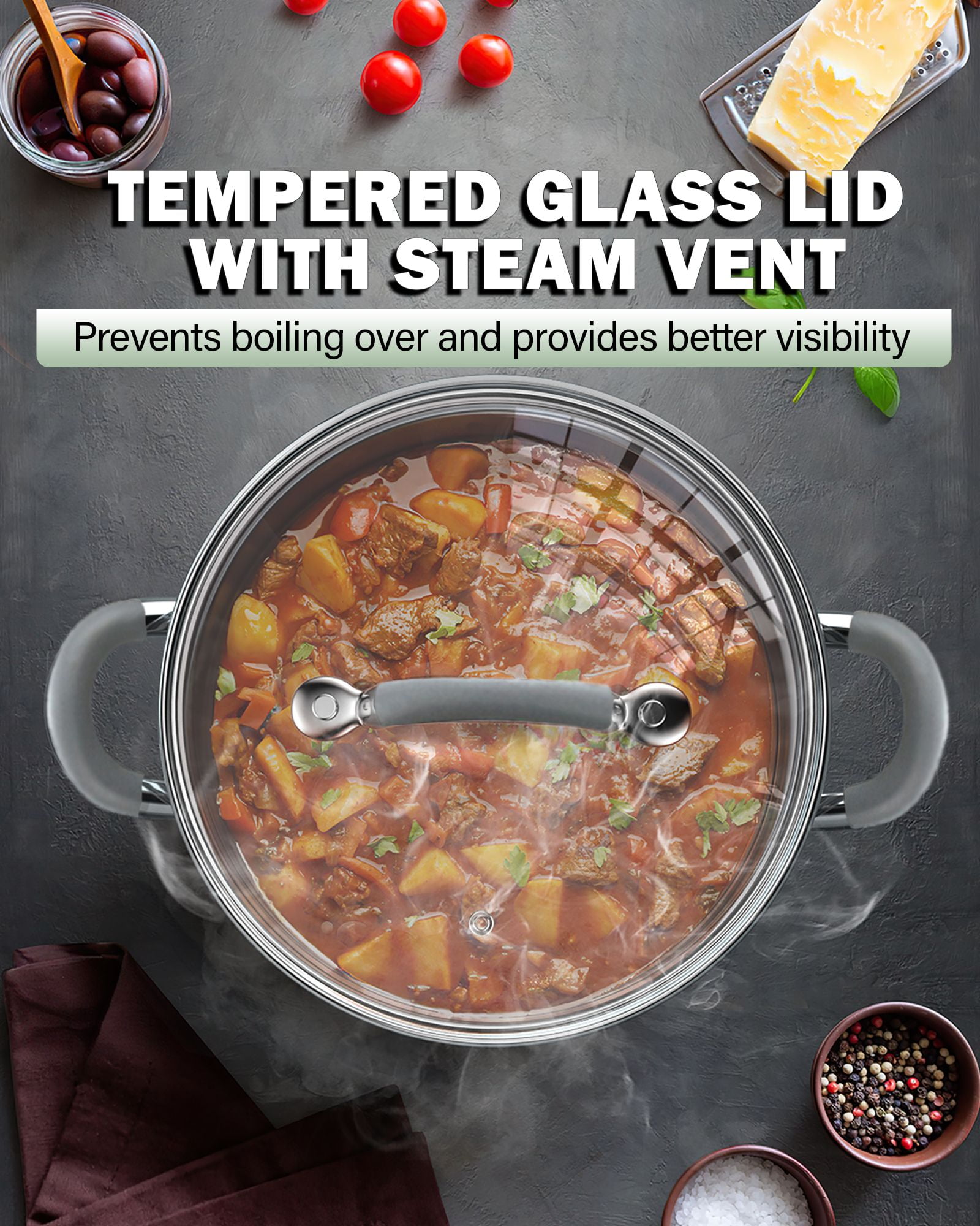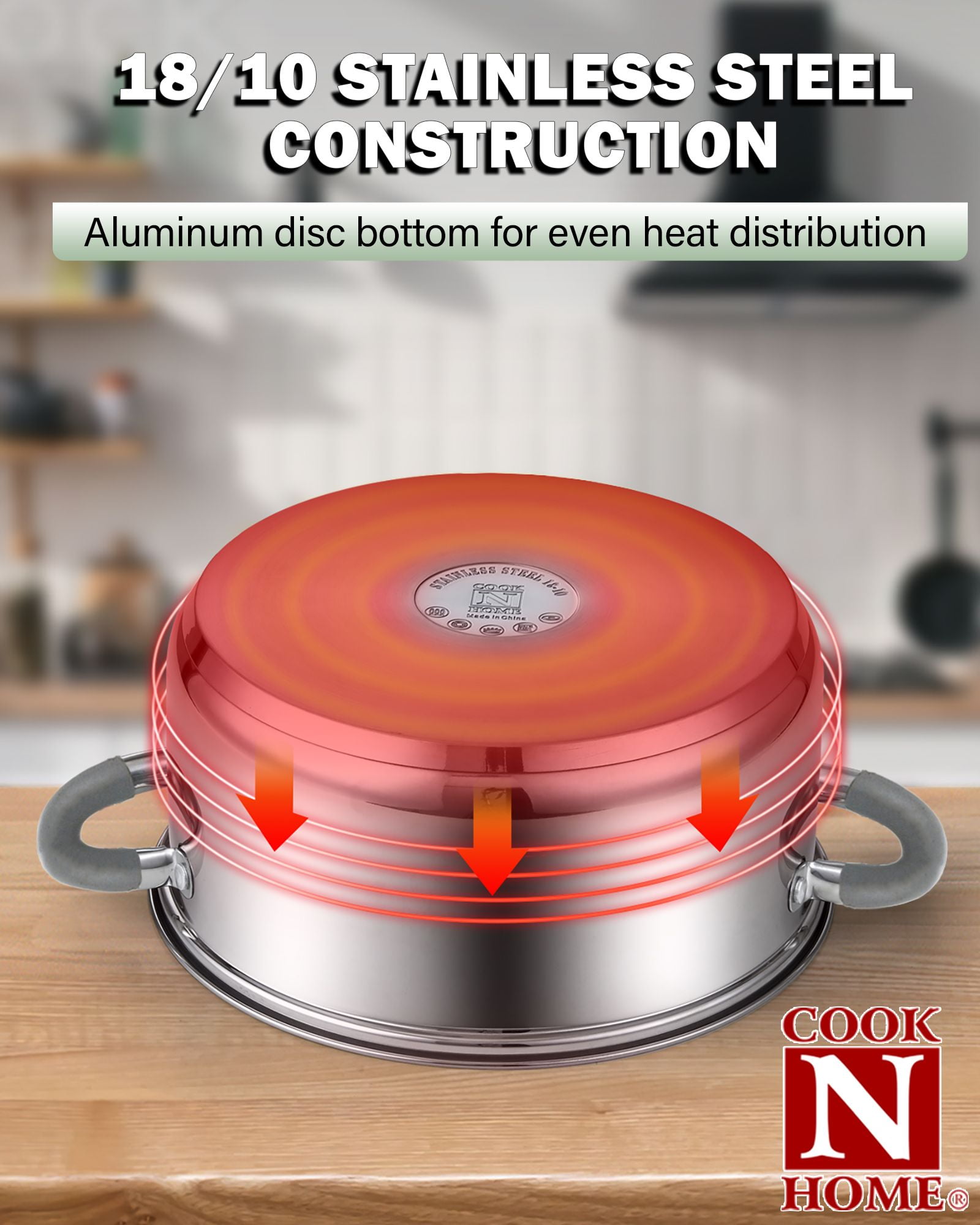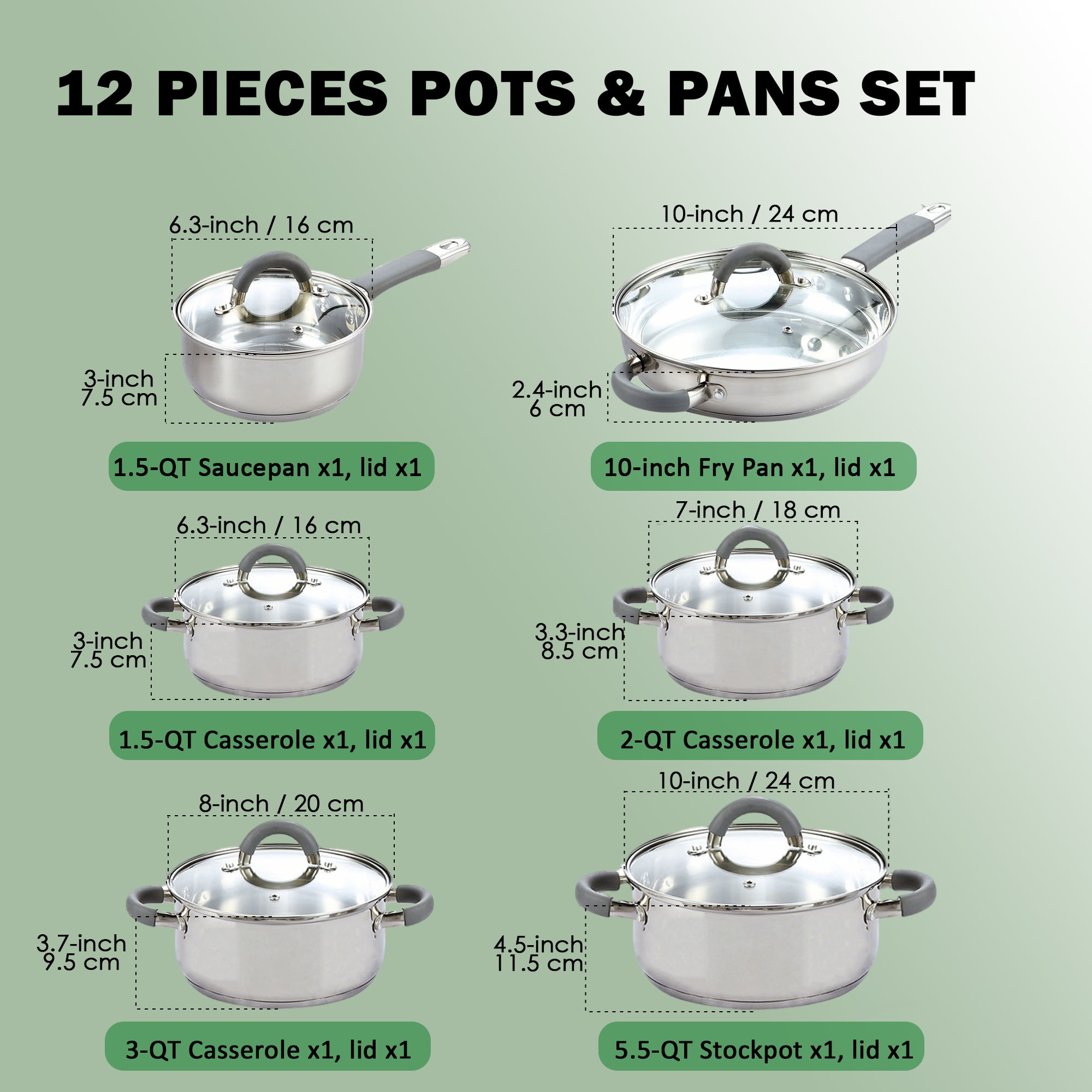 The Cook N Home Basics Cookware Set includes a 1 1/2-qt saucepan with lid, 1 1/2-qt, 2-qt, and 3-qt saucepot casseroles with lids, a 5 1/2-qt stockpot with lid, and a 10-inch fry pan with lid for all your cooking needs The stainless steel pots and pans set is made of mirror-polished 18/10 stainless steel with an aluminum disc bottom for even and quick heat distribution, preventing hot spots The Stainless steel cookware is induction compatible and works on gas, electric, glass, ceramic, halogen, and more; Oven safe up to 400℉, lids up to 350℉; Dishwasher safe for easy cleaning Tempered glass lids with steam vents allow you to view food while cooking; Riveted stainless steel handles with silicone provide a firm grip and protect your hands from heat The pots and pans have a reflective finish inside and out for a sleek appearance and easy cleaning; They are stackable with a flat base for convenient storage and stability on cooktops The perforated handle is designed for easy hanging, saving space in your kitchen