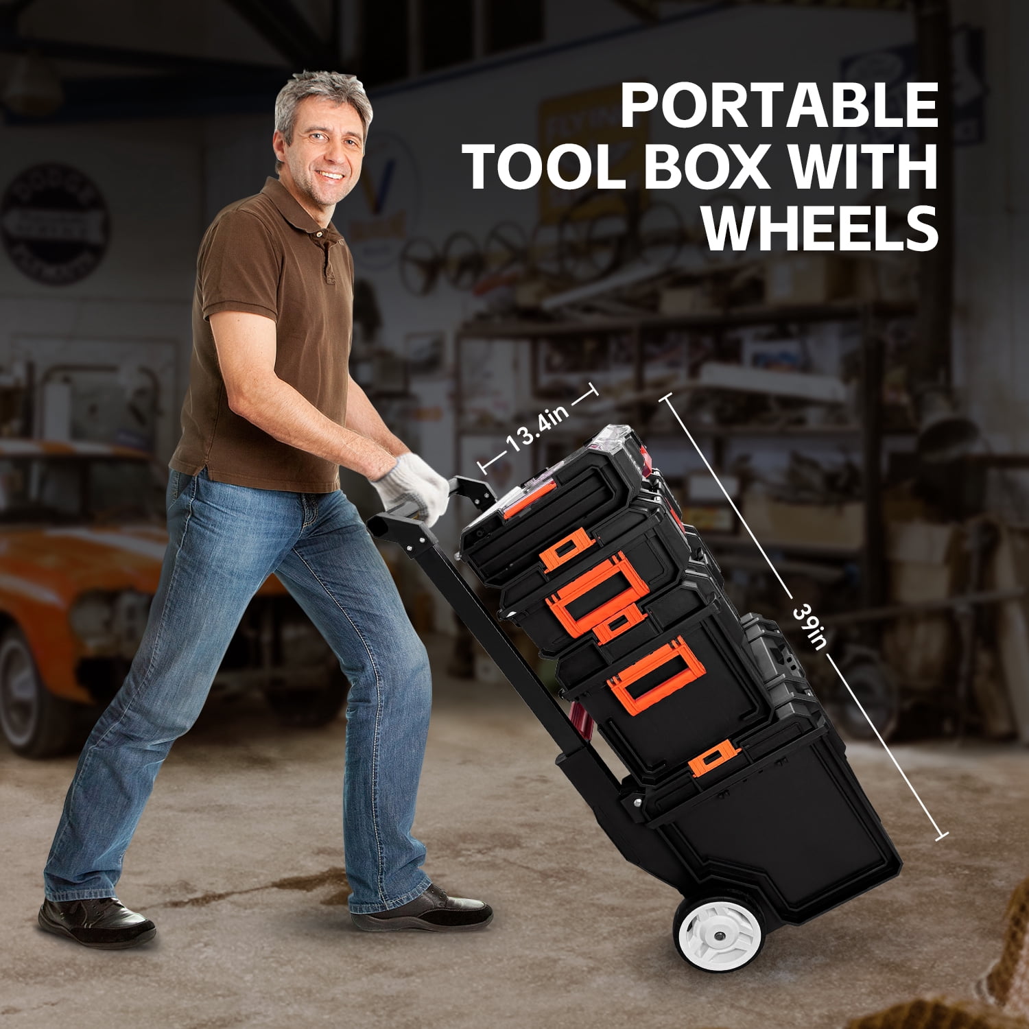 Our Portable Toolbox with Wheels – Stackable Tool Chest with Drawers-4 piece set. Includes an extra-large deep bin for safe and convenient storage of power tools and hardware, a medium-sized tool box and two shallow tool box for small parts and accessories. The stackable storage system features two 7 in. rubber coated wheels and an ergonomic, telescoping handle for easy transport. Except non-slip handle, the multi-function toolbox also features metal stainless steel double locks, more secure, safe and reliable. Stacks neatly to keep tools secure and organized. Grab the unit you need and leave the ones you don’t.