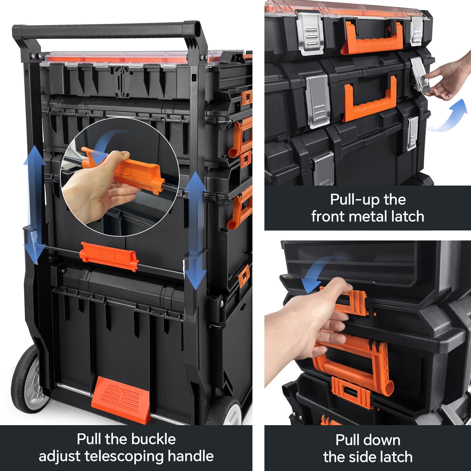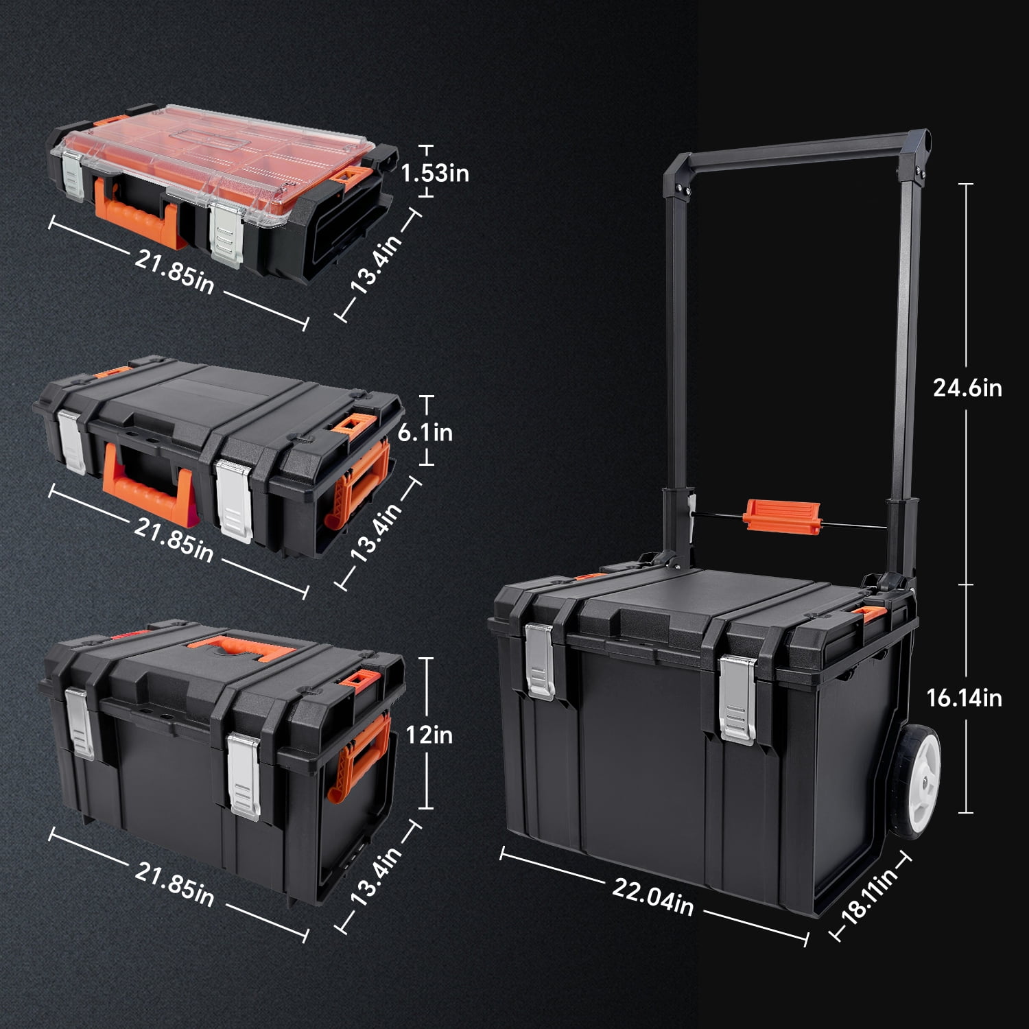 4-Piece Set Mobile Tool Box—Stackable and Detachable : A extra-large deep rolling tote for safe and convenient storage of power tools and bulkier items. Size: 22.04″x18.11″x 16.14″-24.6″ (Lx Wx H). Load bearing: 110 lbs. Sealed waterproof design (IP 65 waterproof grade). A medium-sized tool box ideal for storing hand tools–2 Lift handle on both side, Lid with large lift handle in the middle. Size: 21.85″x13.4″x12″ (Lx Wx H). Load bearing: 66 lbs. IP 65 waterproof. A Small tool box—-Lid built-in 2 parts organizers for small accessories (8 small compartments+3 long compartments). 2 Lift handle on both side. Size: 21.85″x13.4″x6.1″ (Lx Wx H). Load bearing : 44 lbs. IP 65 waterproof. A Small tool box— a great option for small parts and accessories that can get buried in deep bins. With 12pcs removable organizer compartments ( 8 small storage box +4 large storage box ). Size: 21.85″x13.4″x1.53″(Lx Wx H). Load bearing: 33 lbs. Portable Storage Tool Box : The stackable rolling toolbox features two 7 in. rubber coated wheels and an ergonomic, telescoping handle for easy transport. Adjustable handle height 16.14″-24.6″. Double Lock Design: Except non-slip handle, the multi-function toolbox also features metal stainless steel double locks, more secure, safe and reliable. The double locks design will perfectly meet your security needs and protect your tools from loss. After-Sale Service: If you have any questions, please contact us, we will reply with 24hrs, and we will provide you with a satisfactory after-sales solution.