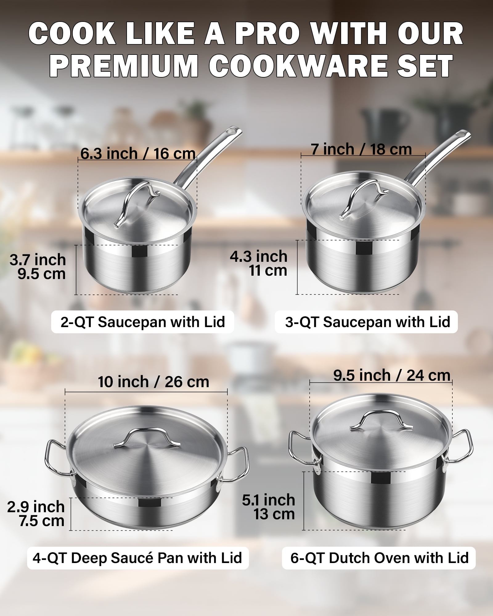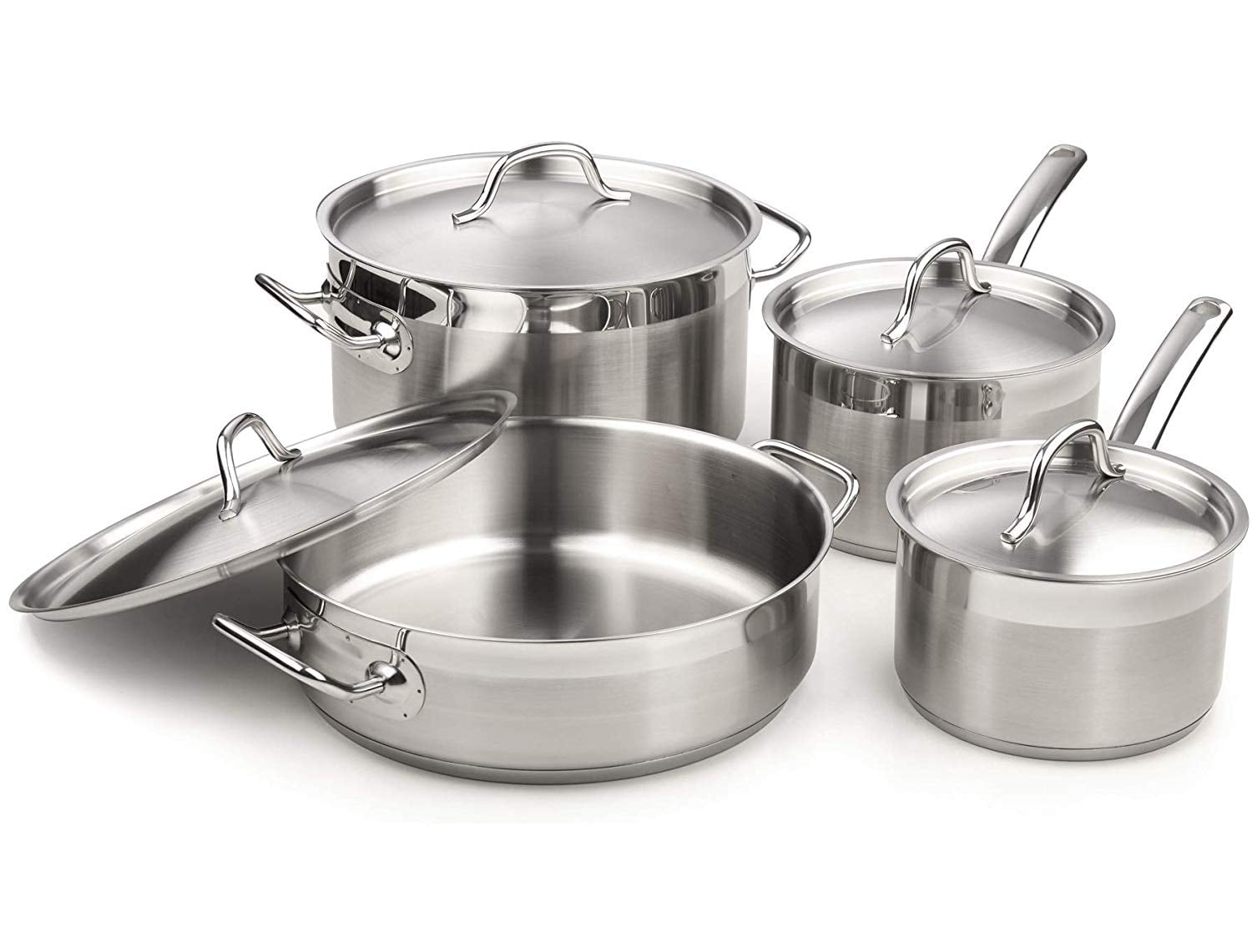 The Cooks Standard Professional Stainless Steel Cookware set 8PC: Made of brushed 18/10 stainless steel inside and out with an aluminum disc layered in the bottom. Stainless steel is heavy-duty, easy to clean, and looks great. The aluminum disc capsuled bottom provides even/quick temperature distribution and prevents hot spots. Solid stainless steel lid keeps heat and moisture for long boiling/stocks and creates a seal. Wide and deep stainless steel handles offer durability/comfort for carrying. Tapered lip for drip-free/balanced pouring and keeps contents in. Induction compatible. Works on gas, electric, glass, ceramic, halogen, etc. Oven safe to 500F.