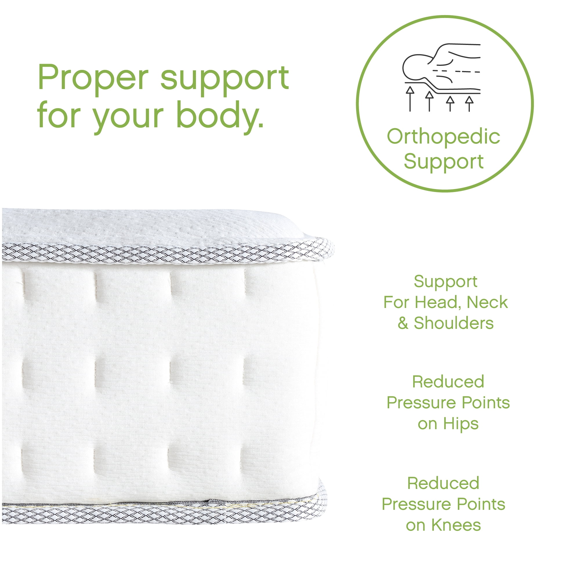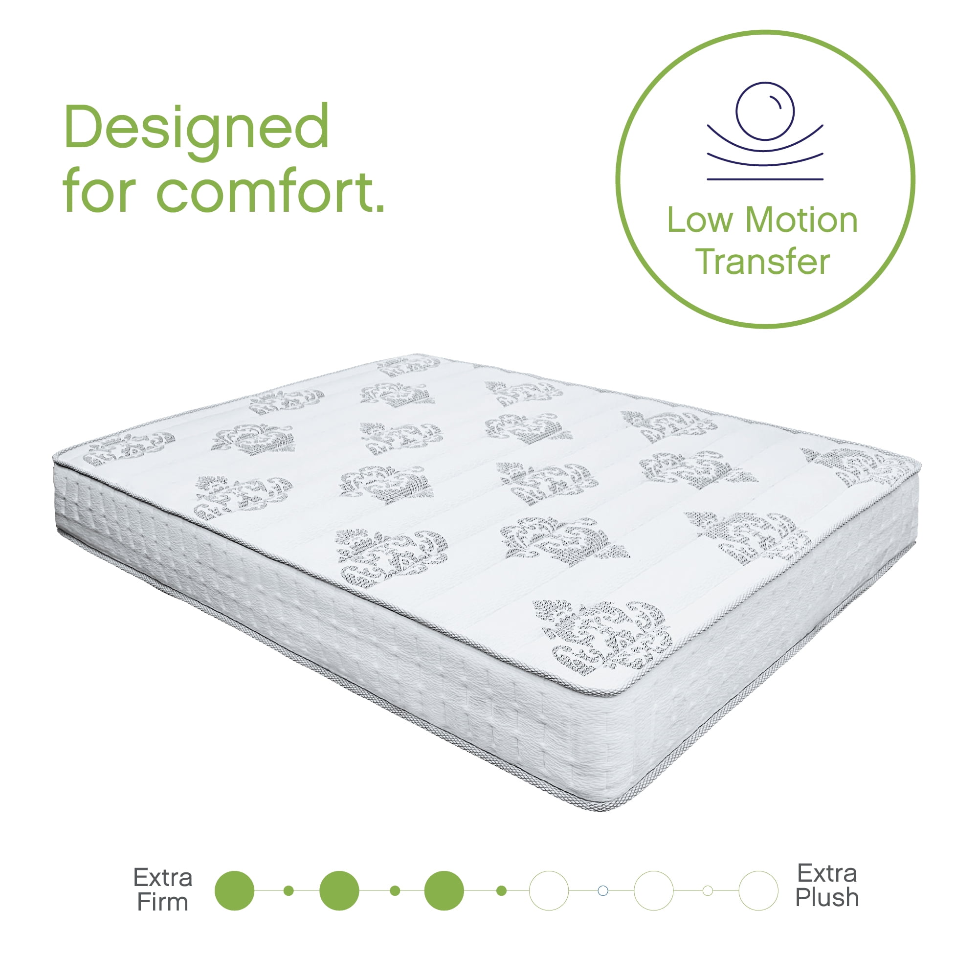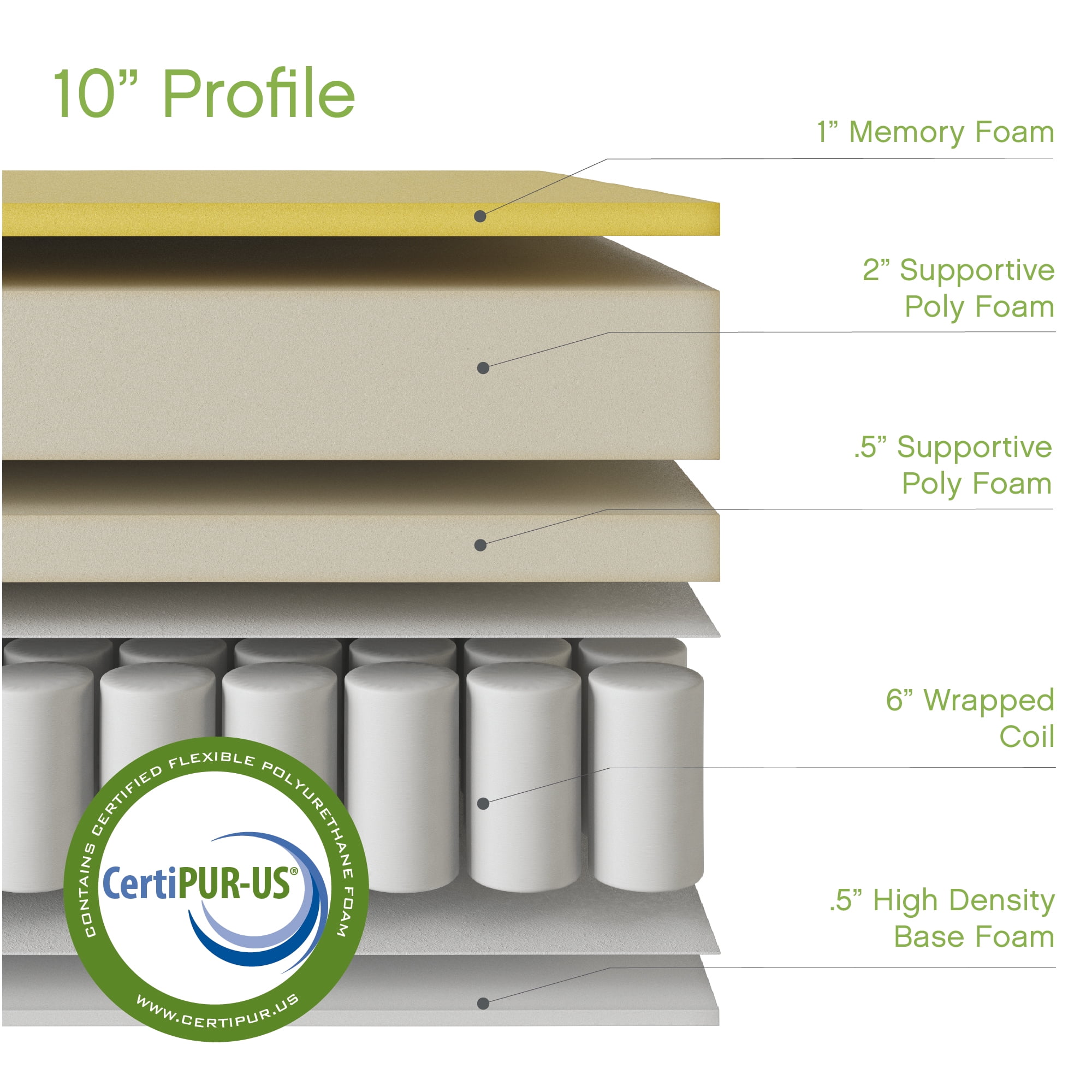 Available in your choice of size Firm comfort mattress 10.5 in. thick innerspring Top layer is memory foam Support base with innerspring 6-in. individual coils wrapped in fabric 13-gauge steel coils 10-year warranty Includes soft, customized cover Memory foam responds to movement by filling in and reshaping