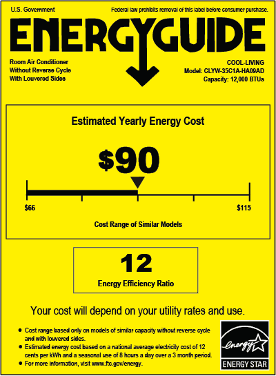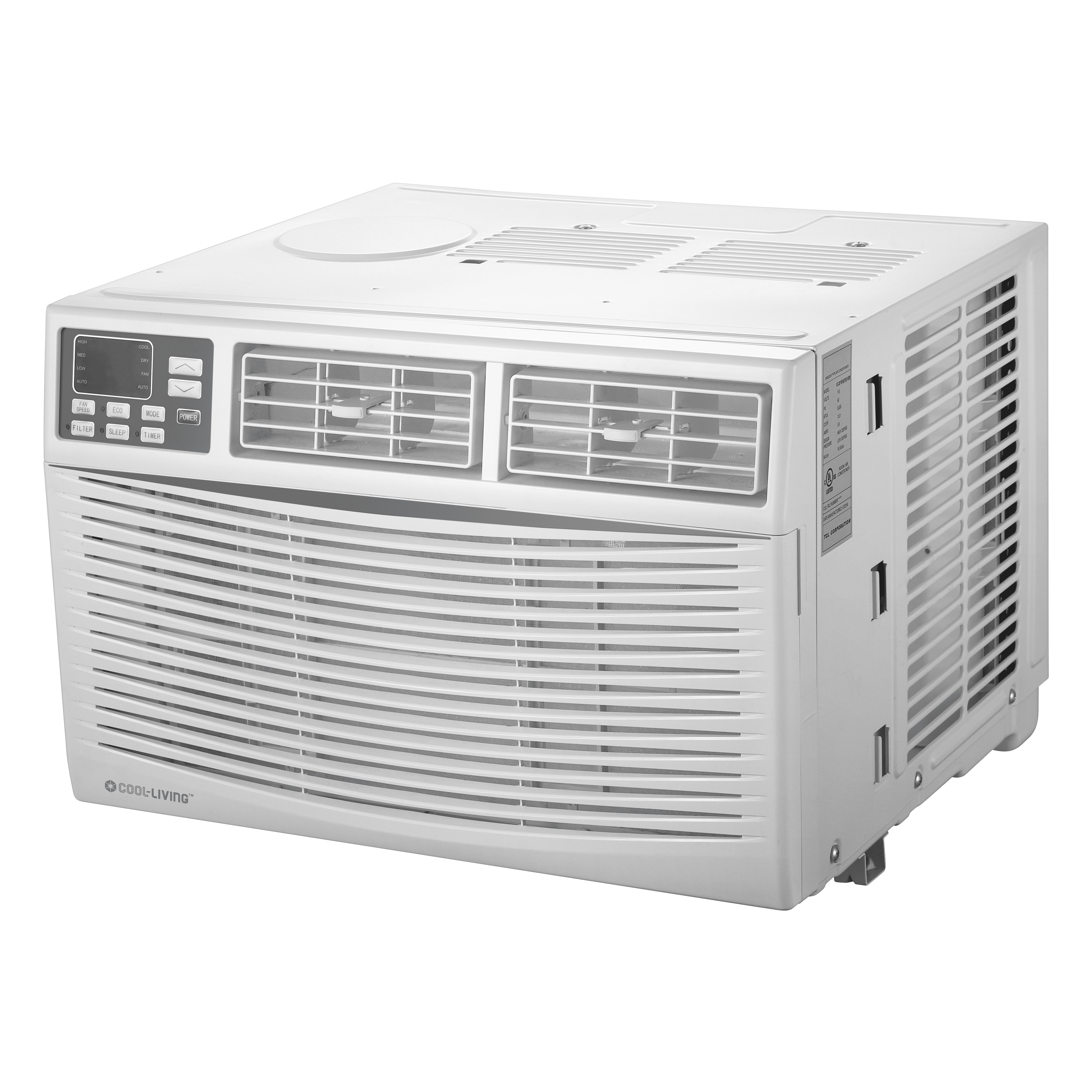 It fits conveniently in a window for safe dispensing of exhaust outside. The Cool-Living 12,000 BTU 115-Volt Window Air Conditioner is Energy Star compliant. Cool Living 12,000-BTU Window-Mounted Room Air Conditioner with Digital Display and Remote, White: Oscillating 3-speed fan moves air about the room Programmable digital thermostat lets you easily adjust the air temperature 24-hour programmable timer, energy-saver mode, sleep mode and auto mode help you conserve energy Loss of power protection automatically restarts the unit with programmed settings if power is lost Remote control allows for full operation and programming from across the room Washable and reusable air filter Energy-Efficient Rate: 11.2 Eco-friendly R410A refrigerant Requires a standard 3-prong, 120V/15A household outlet Color: white Cools up to 550 sq ft Energy Star-compliant air conditioner with digital display Full warranty Model# CL-CLYW-35C1A
